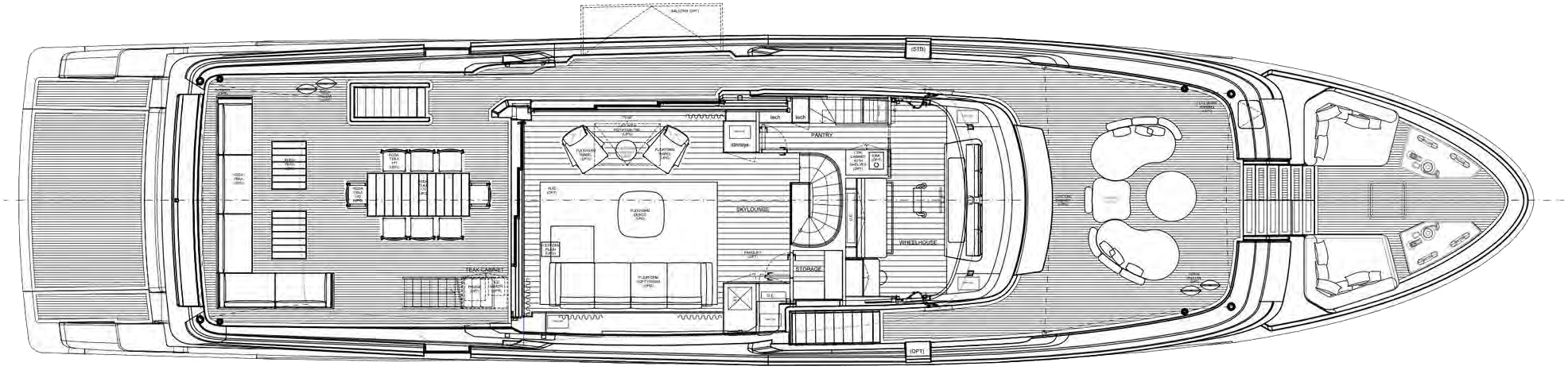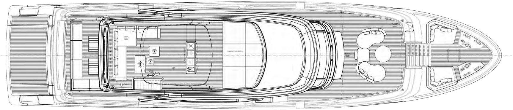 Teak is laid to the beach club, cockpit, side decks, bow and flybridge
