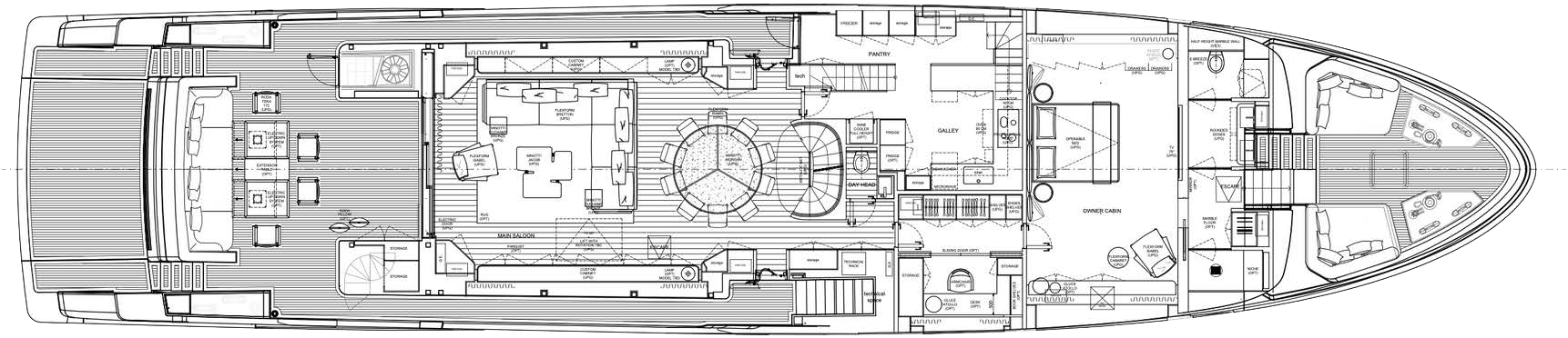 The flybridge features a hardtop styled after the SL series and includes a Boffi K2 bar cabinet, Teppanyaki grill, ice makers, fridges and teak decking throughout. Furnished with luxury outdoor pieces by Roda and Royal Botania, the space is both functional and stylish, ideal for socializing and relaxation. Additional options include smoke tables with hi-low functionality and custom cushions.