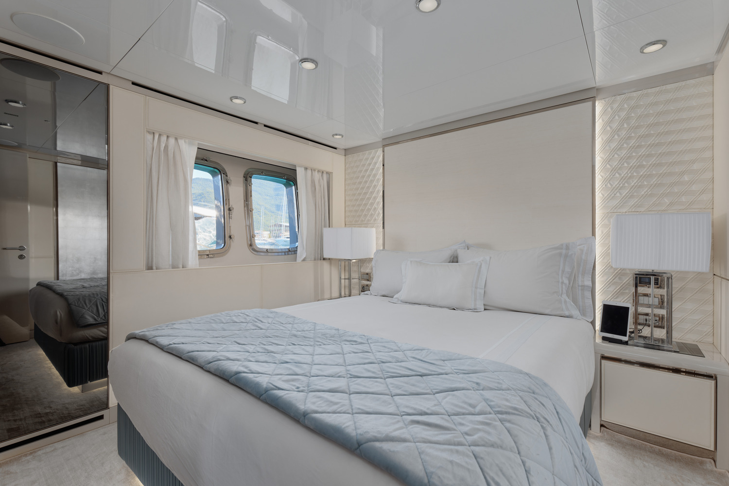 Two VIP cabins on lower deck midships, central double bed, night stands, wardrobe, vanity unit, leather covered bulk heads, Santushi carpet, 42l Frigonautica fridge, TV, electric curtains, storage cupboards and safe