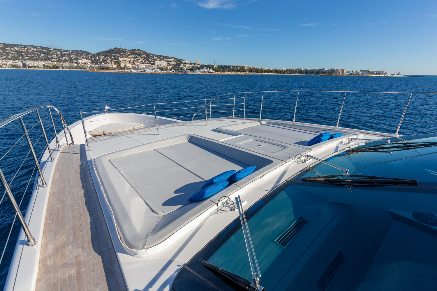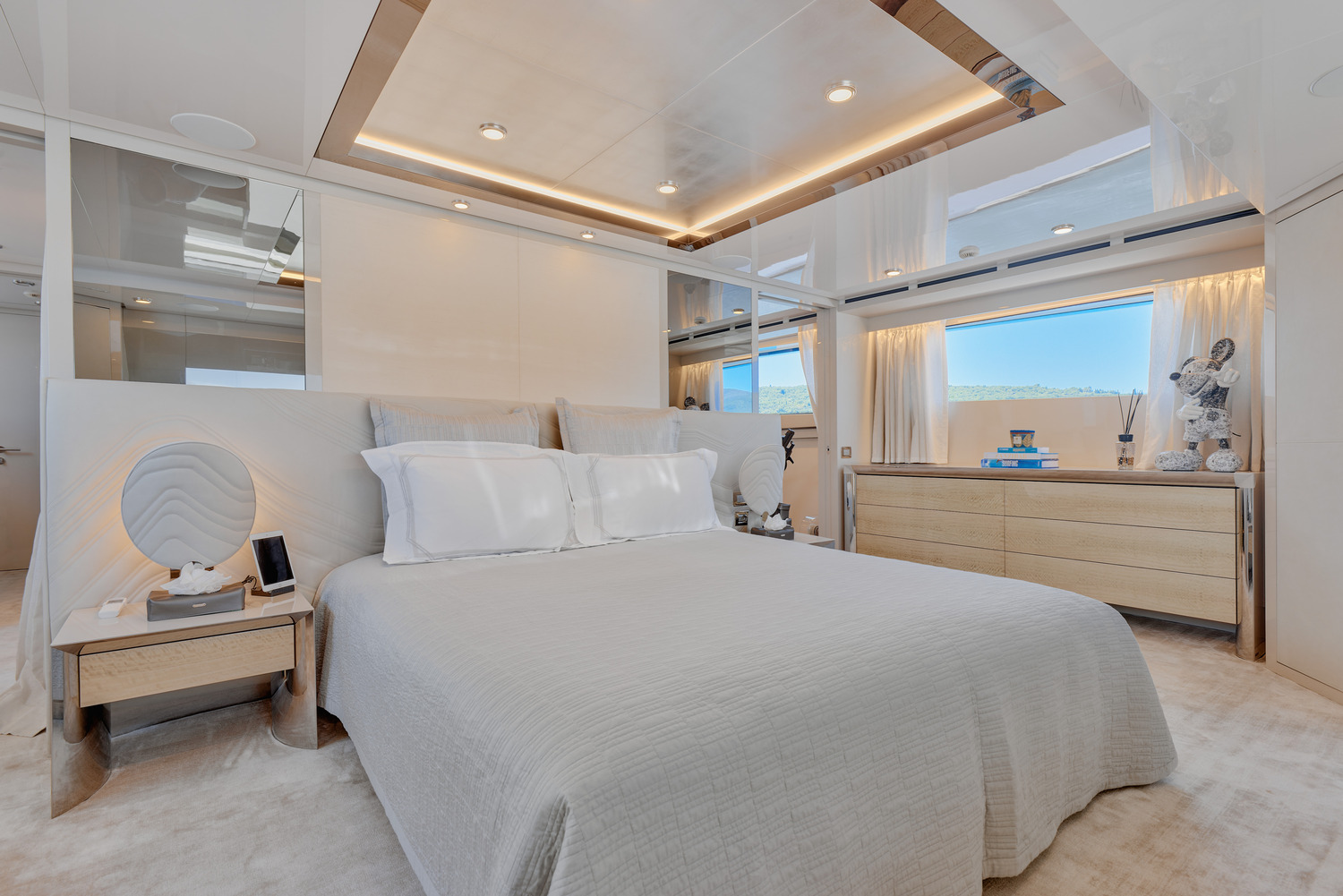 Main deck owners cabin with island double berth, night stands, open walk in wardrobe, storage cupboards, vanity desk/office with second wardrobe, Santushi carpet, 42l Frigonautica fridge, port and starboard terrace, electric curtains, high/low 55'' TV and safe.