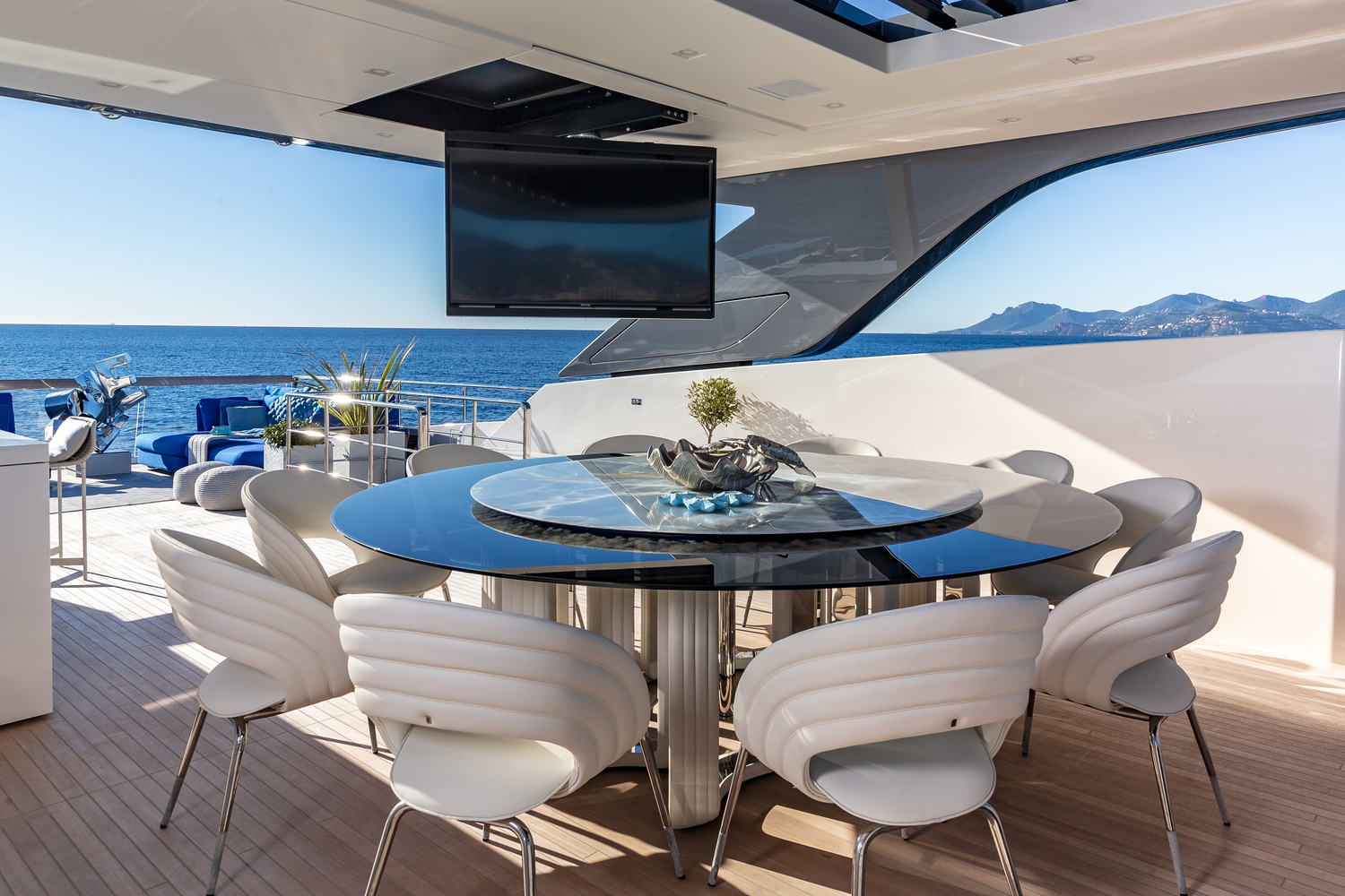 Large L-shaped sofa, coffee table, two arm chairs, automatic sliding cockpit to saloon doors, high/low TV, access door to starboard for access to the side terrace, storage cupboards, Shantushi rug, electric curtains, feature marble wall, chandelier in crystal and dining table for up to ten guests