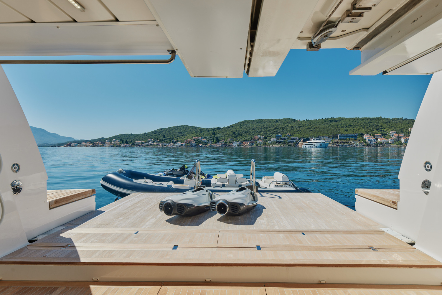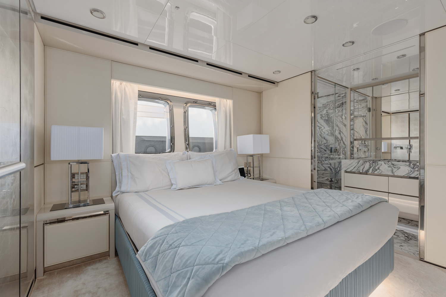 Spanning 36-metres, the main deck offers a spacious saloon and a forward dining area, along with five bright and comfortable cabins, accommodating up to 10 guests. The full-beam master suite boasts ample wardrobe space, two opening balconies, and a generous en-suite bathroom. The crew area is designed to comfortably house five crew members across three cabins.
