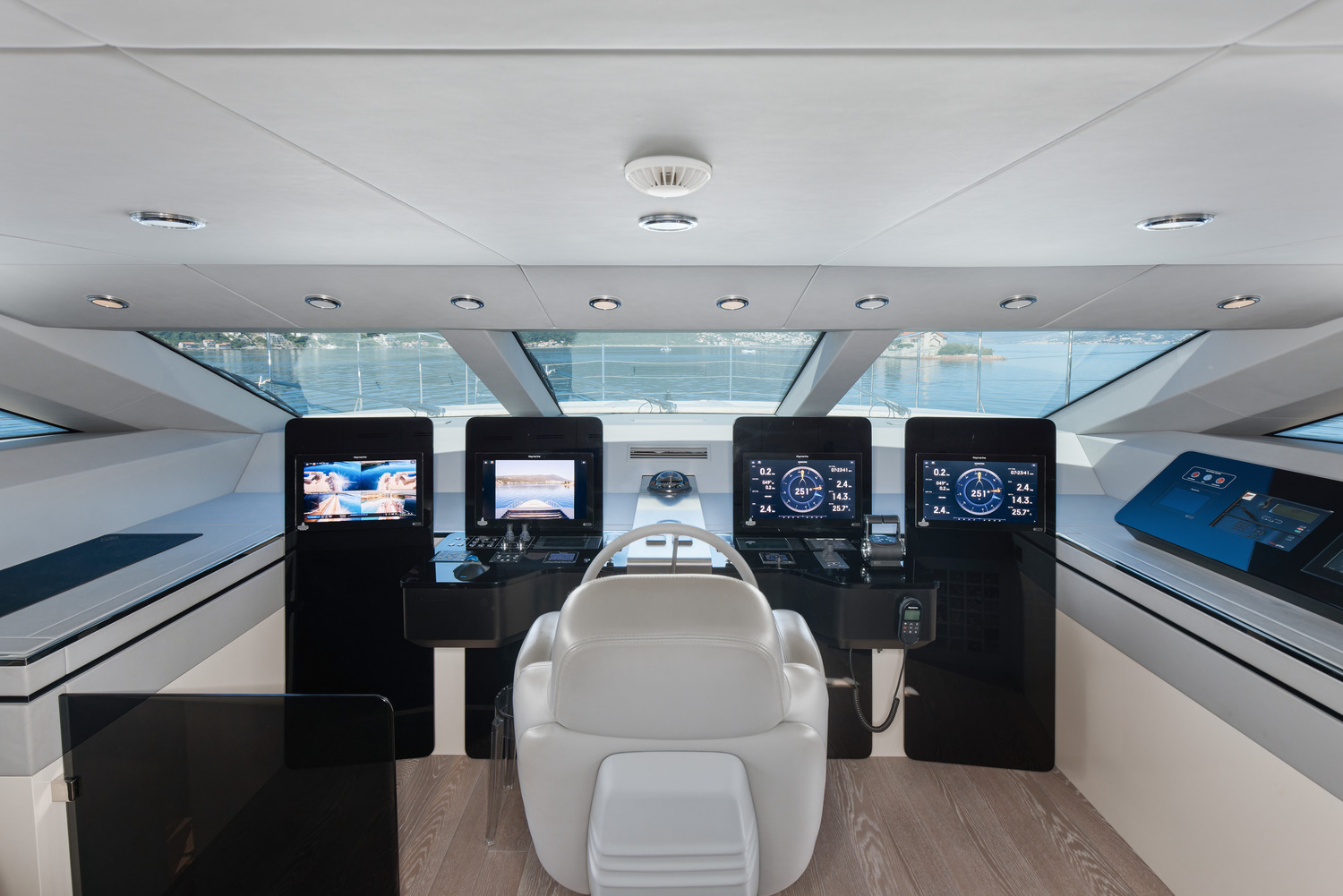 Helm seat, navigation and ships controls, worktop with access to the flybridge and main deck