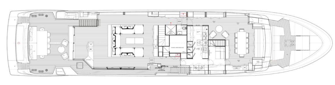 Large flybridge with sunbeds to aft, sofas and individual chairs in a U shape position, dining for 10 separated to the aft by a large bar with teppanyaki, fridge, icemaker, direct access from port flybridge door leading forward