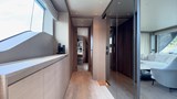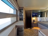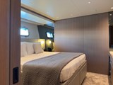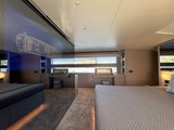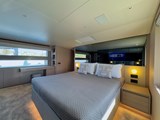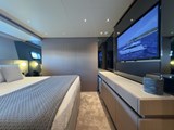 Located forward on the main deck and accessed through the port side foyer - Double bed with 4 draws, custom headboard, nightstands, strip led light under the bed and nightstands, vanity desk to port with pouf, TV integrated into bulkhead behind stopsol mirror, electric skylight, carpet floor, door to the stbd side deck for private access to foredeck lounge and electric roman blinds