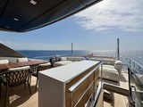 The flybridge may be reached through an external staircase coming up from the aft cockpit port side, from the bow area through an external passageway on port side or from the internal staircase from the wheelhouse - Helm station to port with pilot bench for two, L-shaped bar area with ice maker to starboard, Grill Barazza in port bar cabinet, engine controls, navigation instruments and engine instruments. Hardtop with blade opening roof, rear flybridge sun awning, eight B&B Erica dining chairs, Flexform Pico outdoor dining table on flybridge with brunito structure and Iroko natural top, sunbathing area aft with B&B butterfly convertible sofas, covers for all outdoor furniture and Inox column shower. Tops and sides of the wet bar and each cabinet in white Corian with varnished teak doors