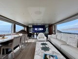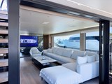 Minotti Andersen L-shaped sofa with pouf, Minotti Liam coffee table with Calacatta marble top and oak moka middle surface, Minotti Angie armchair with leather backrest and fabric cushions, fumè mirror on forward bulkhead with TV on display, 34 bottle wine cooler, icemaker, wooden flooring, full height windows on each side, electric roman curtains, electric roman blinds, LED strip light behind blinds, storage cupboards and full height cabinet behind main bulkhead