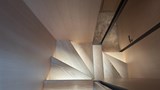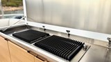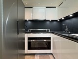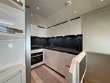 The galley is forward of starboard foyer, which is separated by a door. Boffi galley fitted with - Miele cooktop 80cm, extractor fan, dishwasher, Miele conventional oven 90cm, commercial fridge/freezer, twin sinks, countertop, storage, vinyl flooring, door to stbd side deck