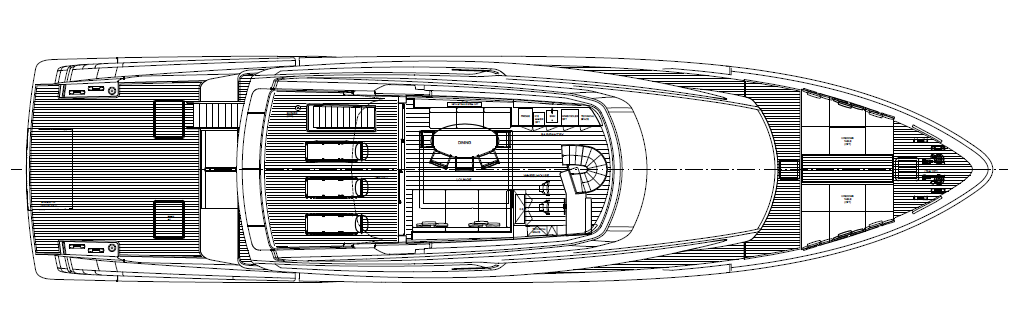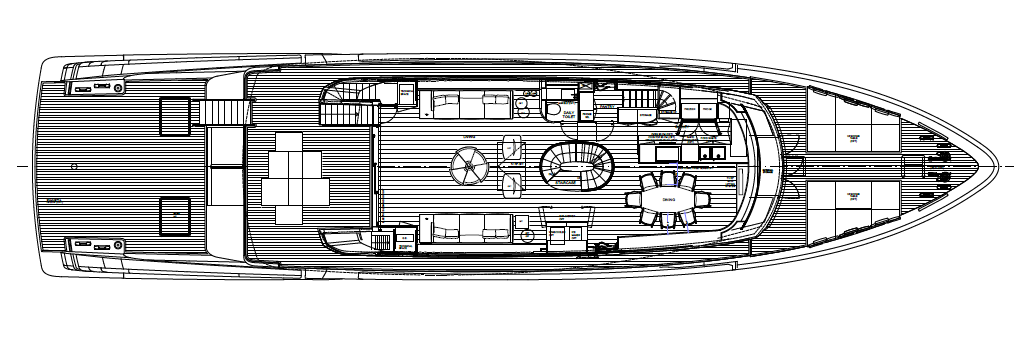 Tender crane, up/down swimming platform, fold down platforms, access to enclosed gym area, day head and sauna, external Inox shower column