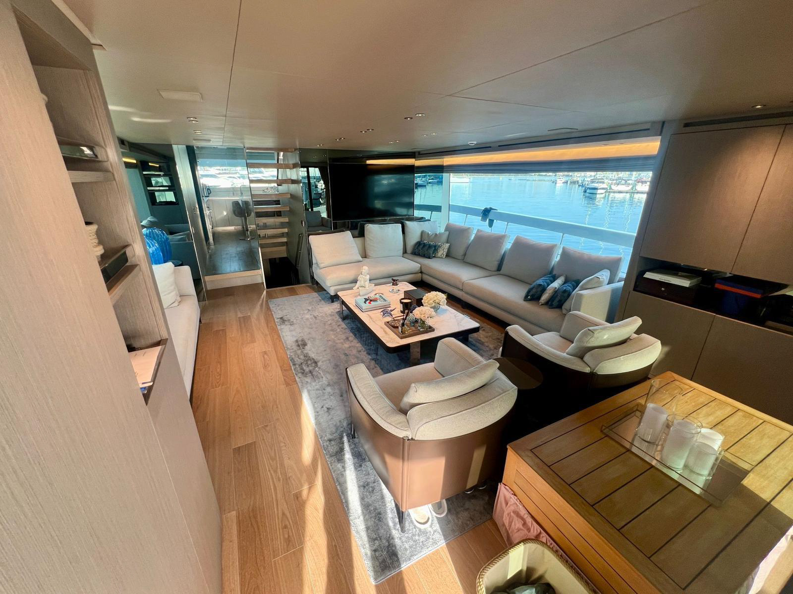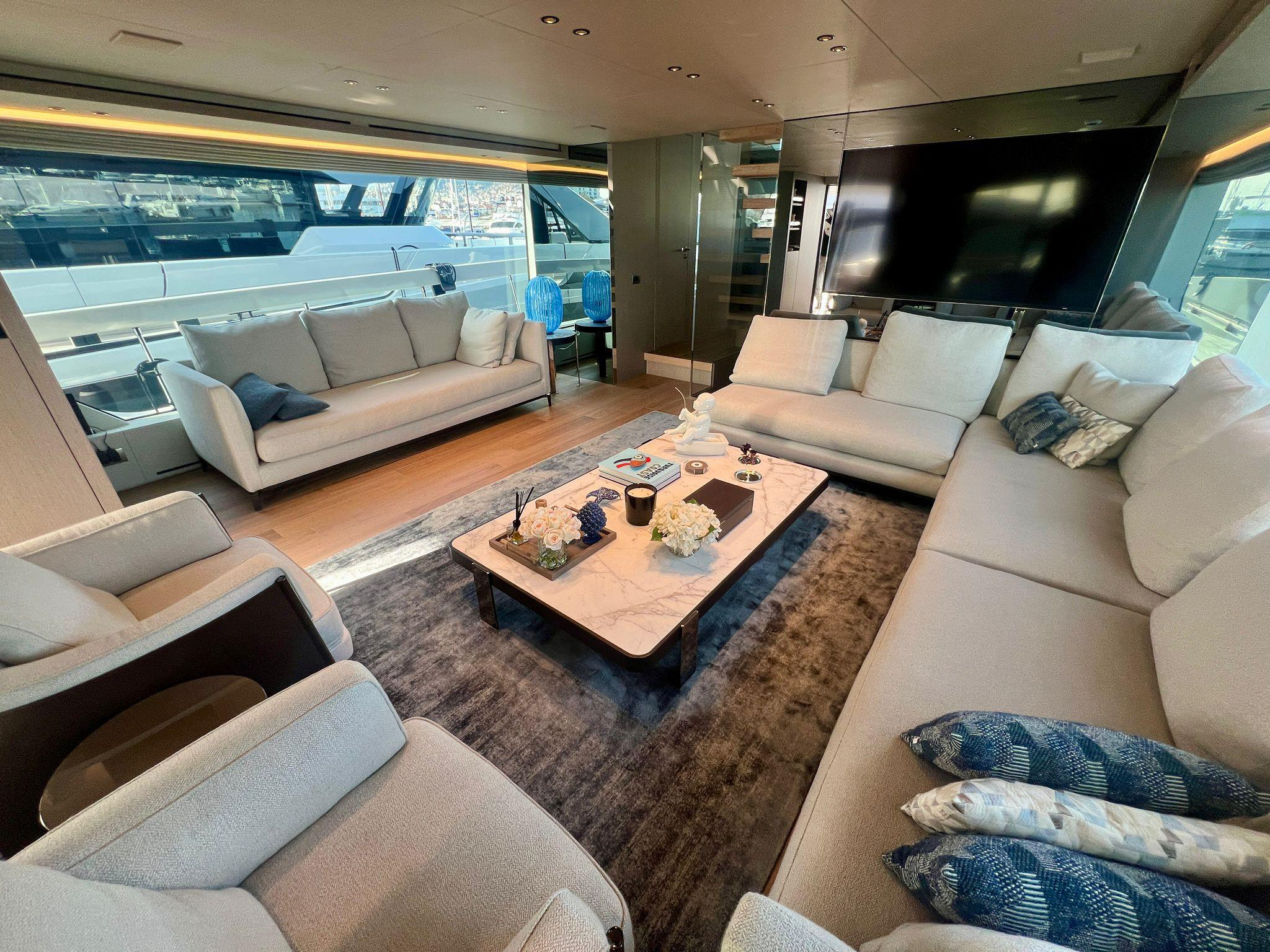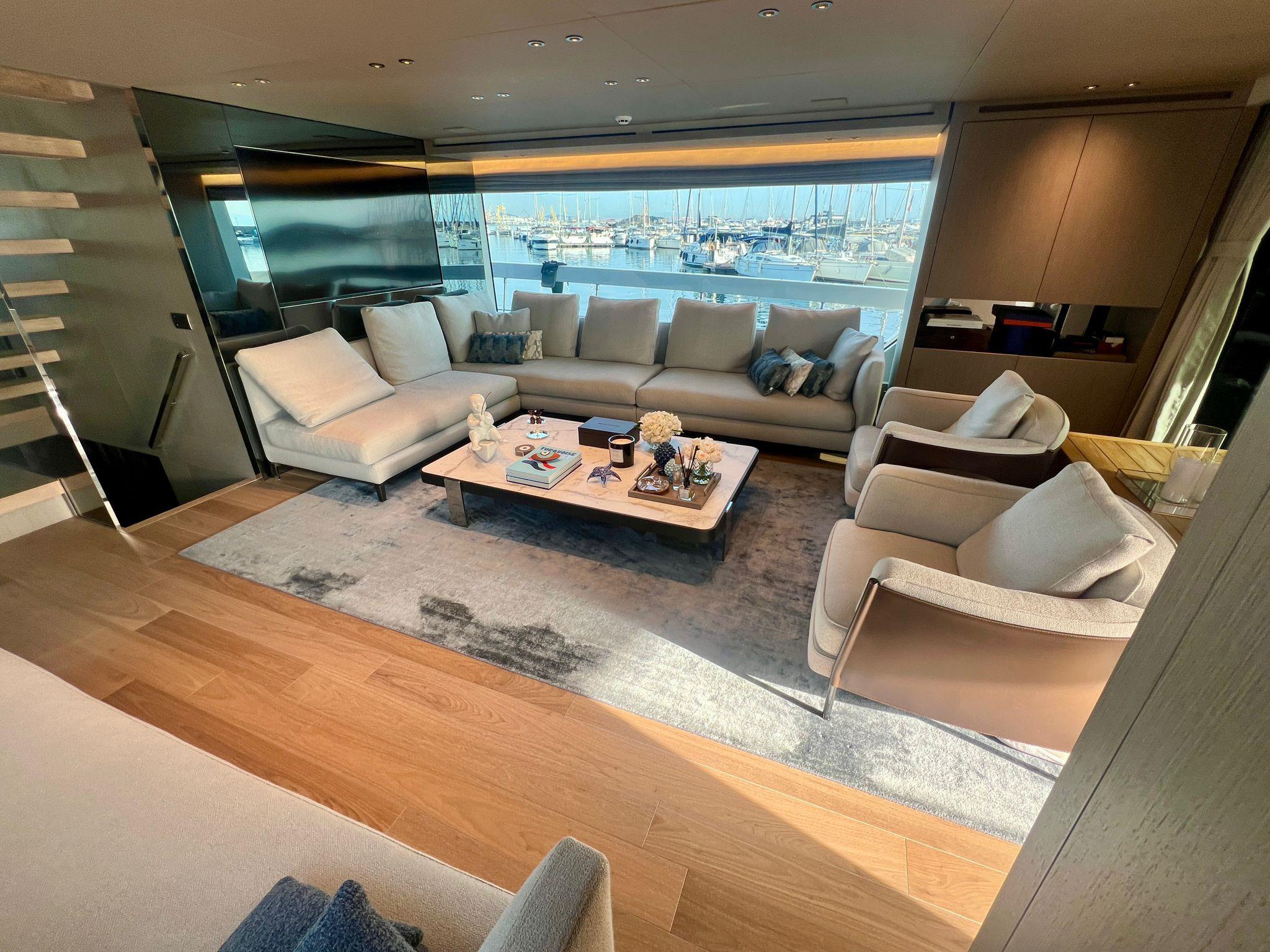Floor to ceiling windows to port and starboard, large L-shaped sofa to starboard with two arm chairs, coffee table with marble inlay, sofa to port, 65" LED TV, wooden walnut flooring and Jacaranda Satara rug