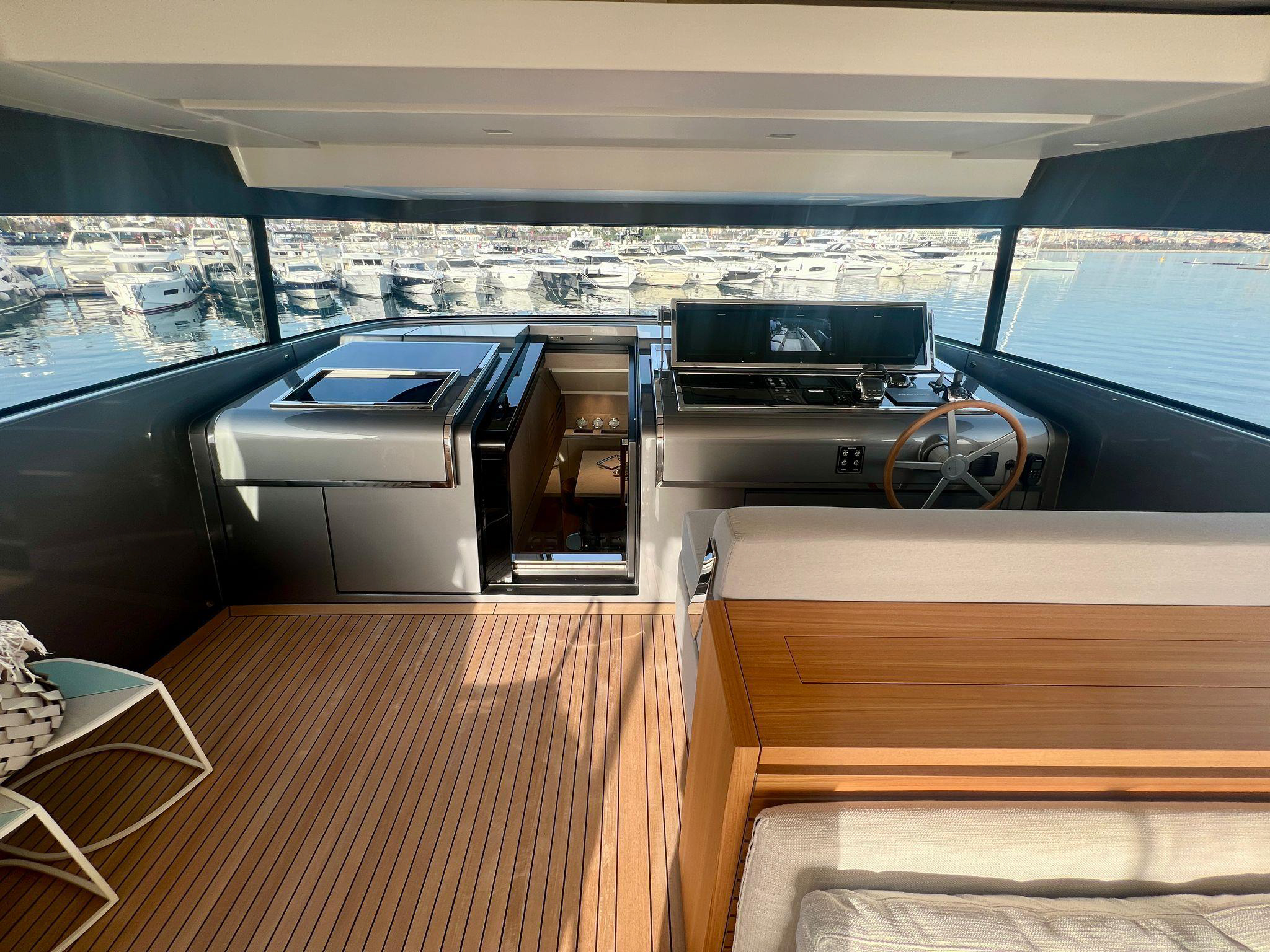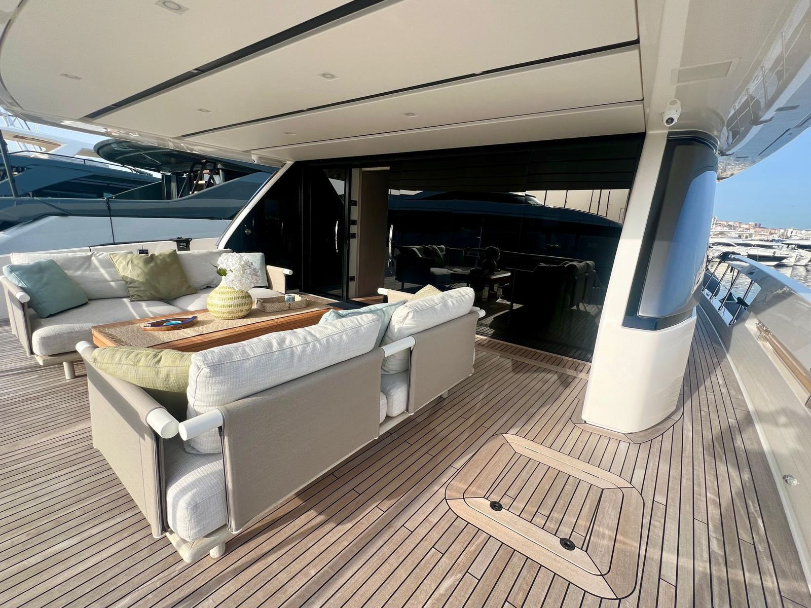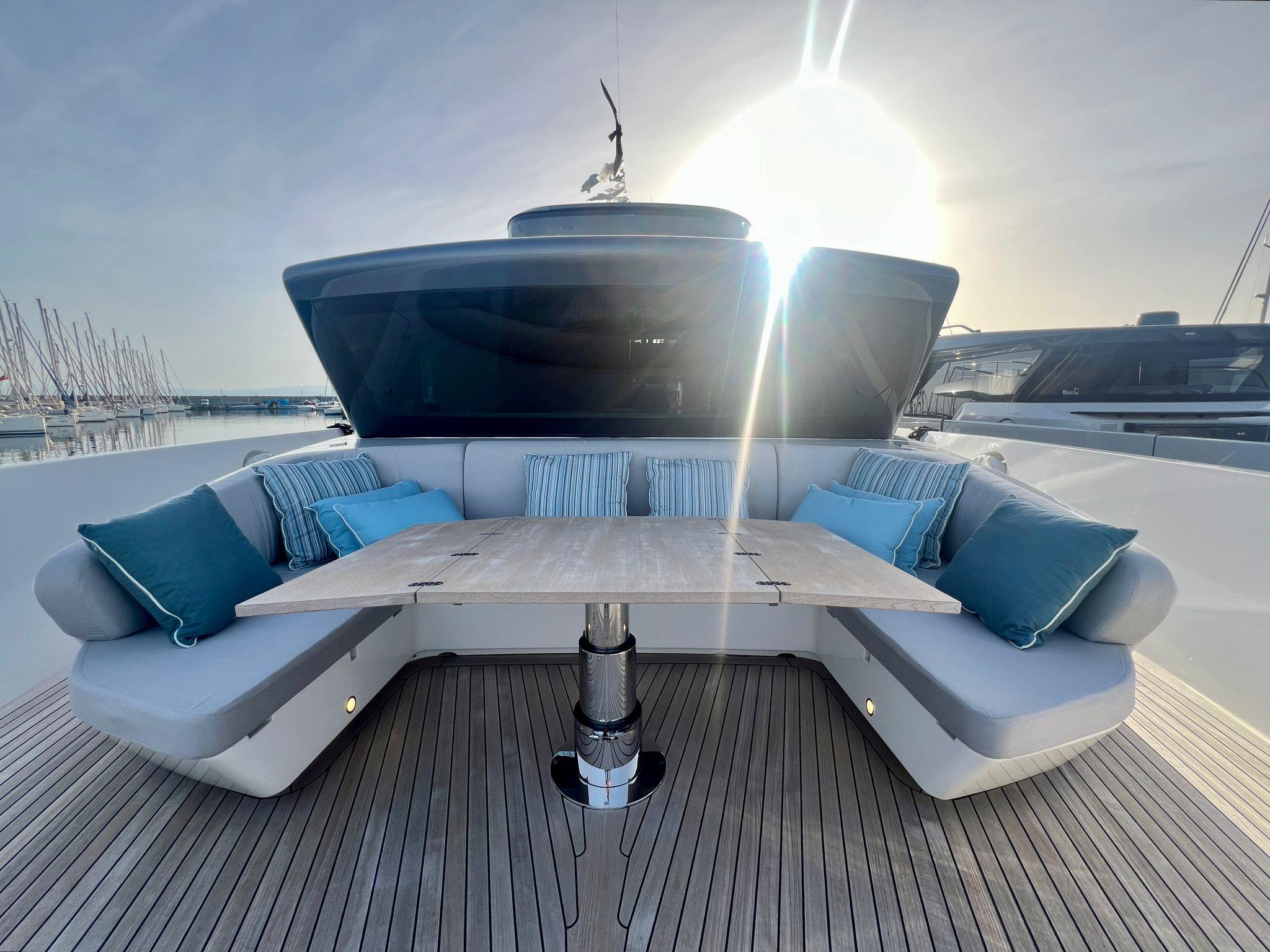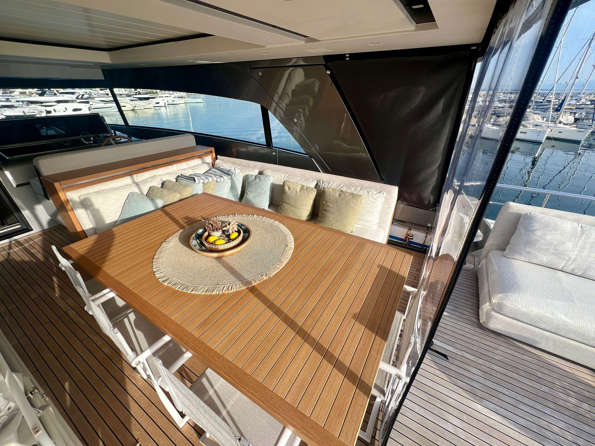 Hardtop with electric louvre roof, wetbar to port with grill, sink and fridge, L-shaped Roda sofa to starboard around teak dining table with four Talenti Riviera chairs