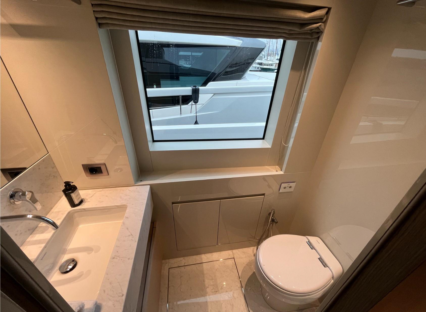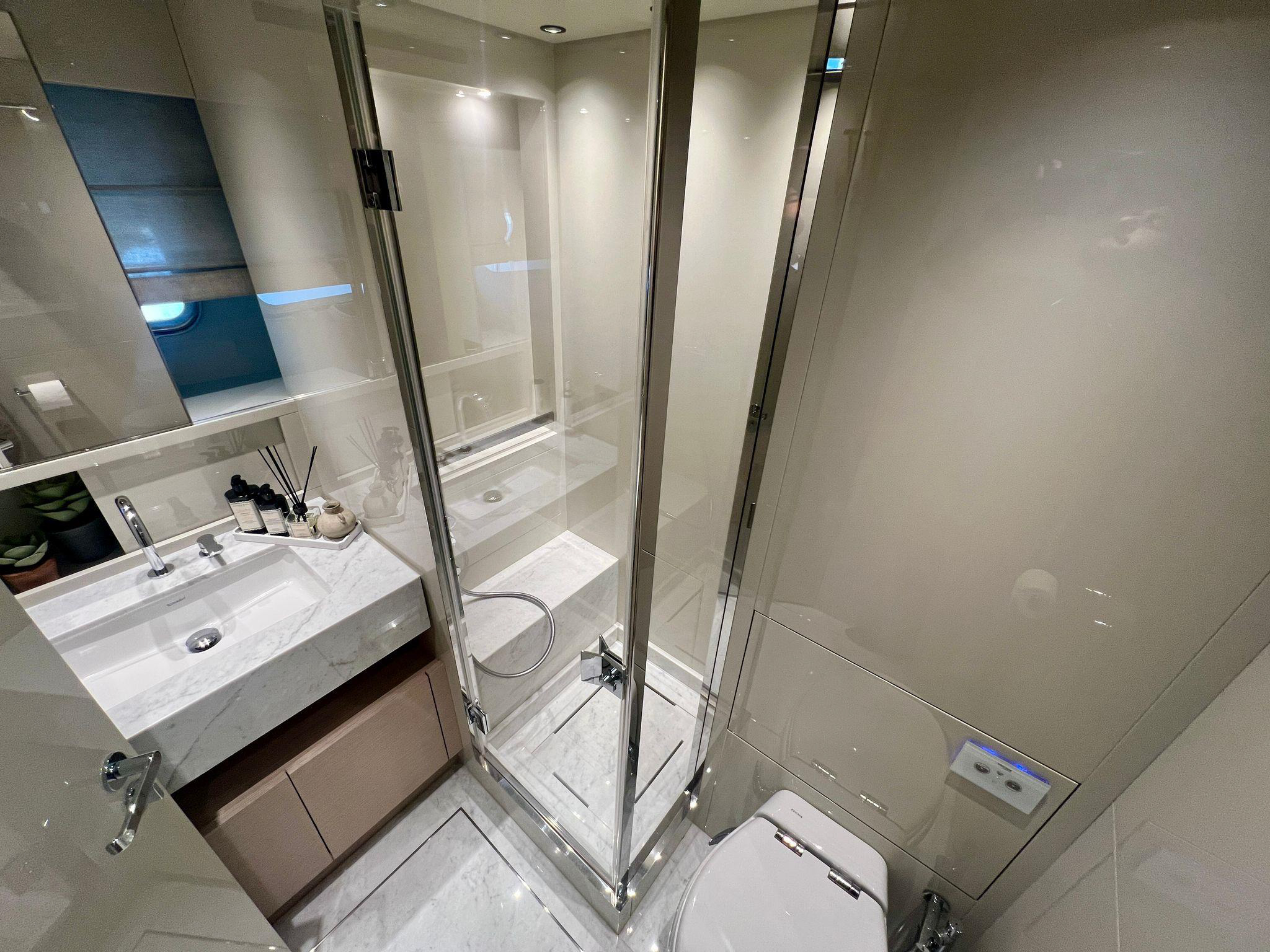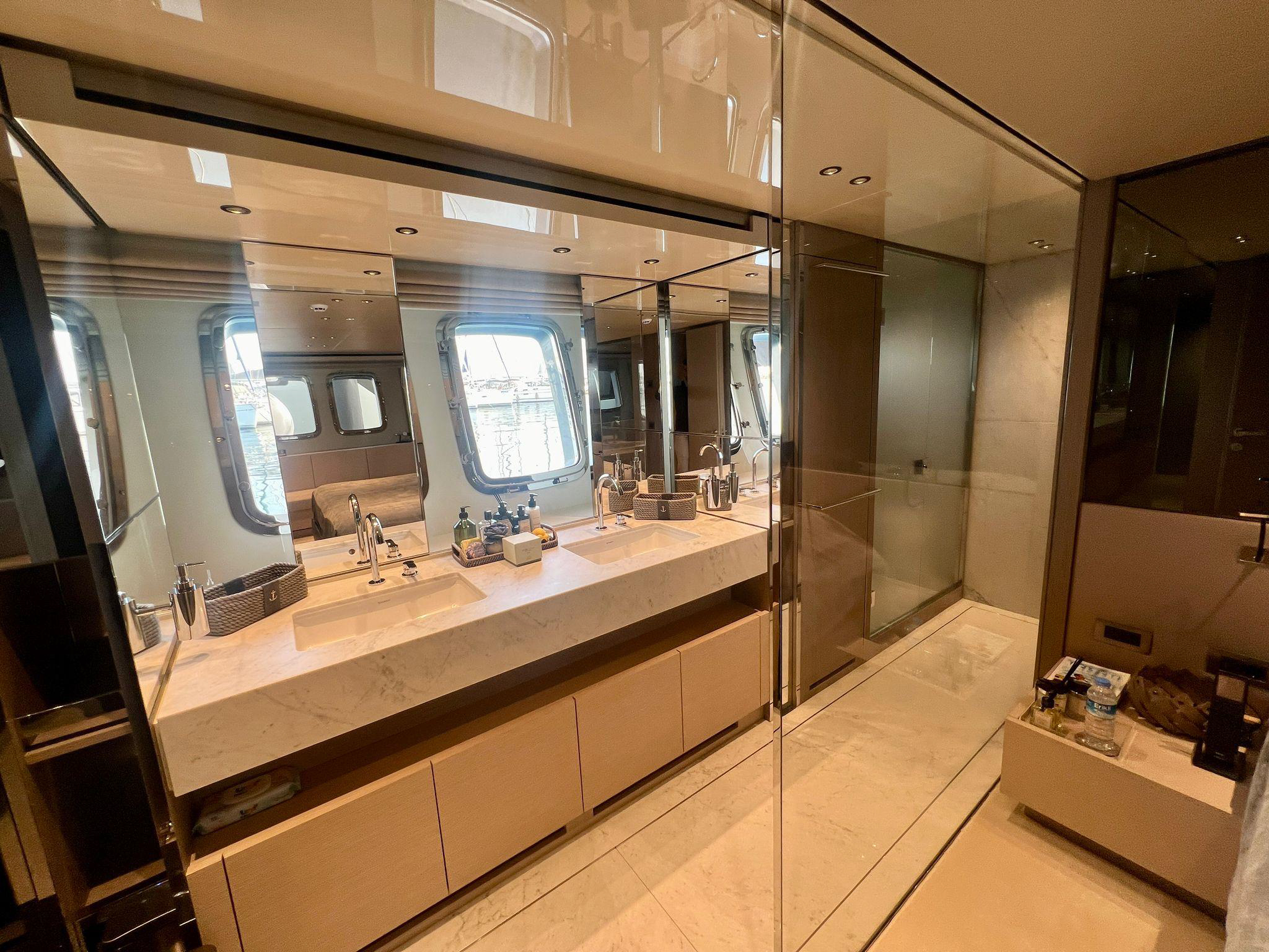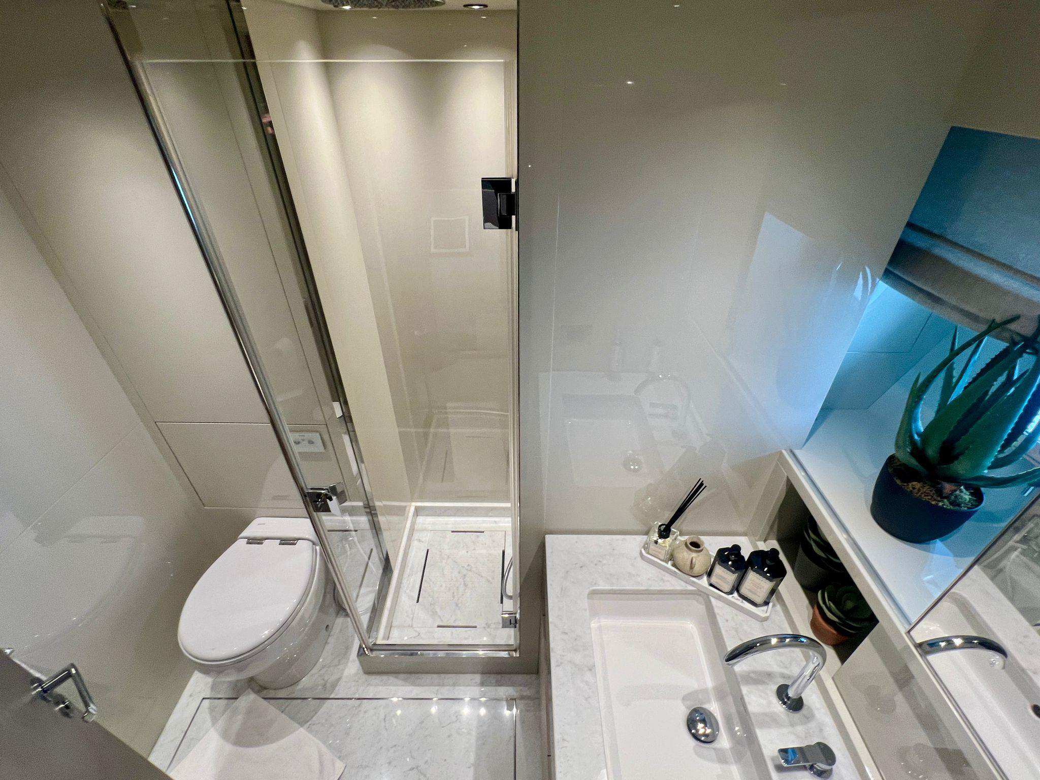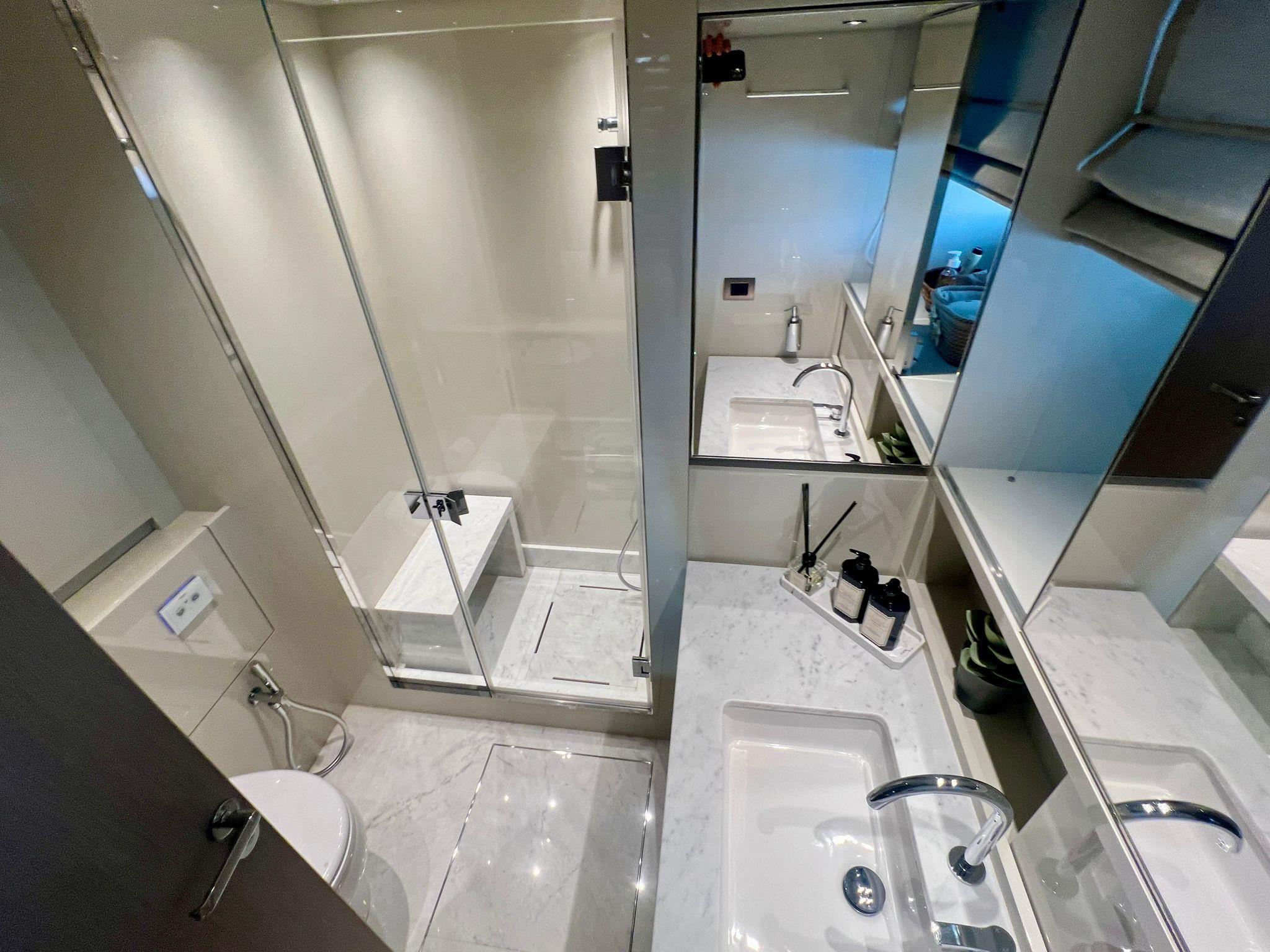 Lissoni designed bathroom located to starboard with floor to ceiling glass partition, twin sinks, toilet and separate large walk in rain shower