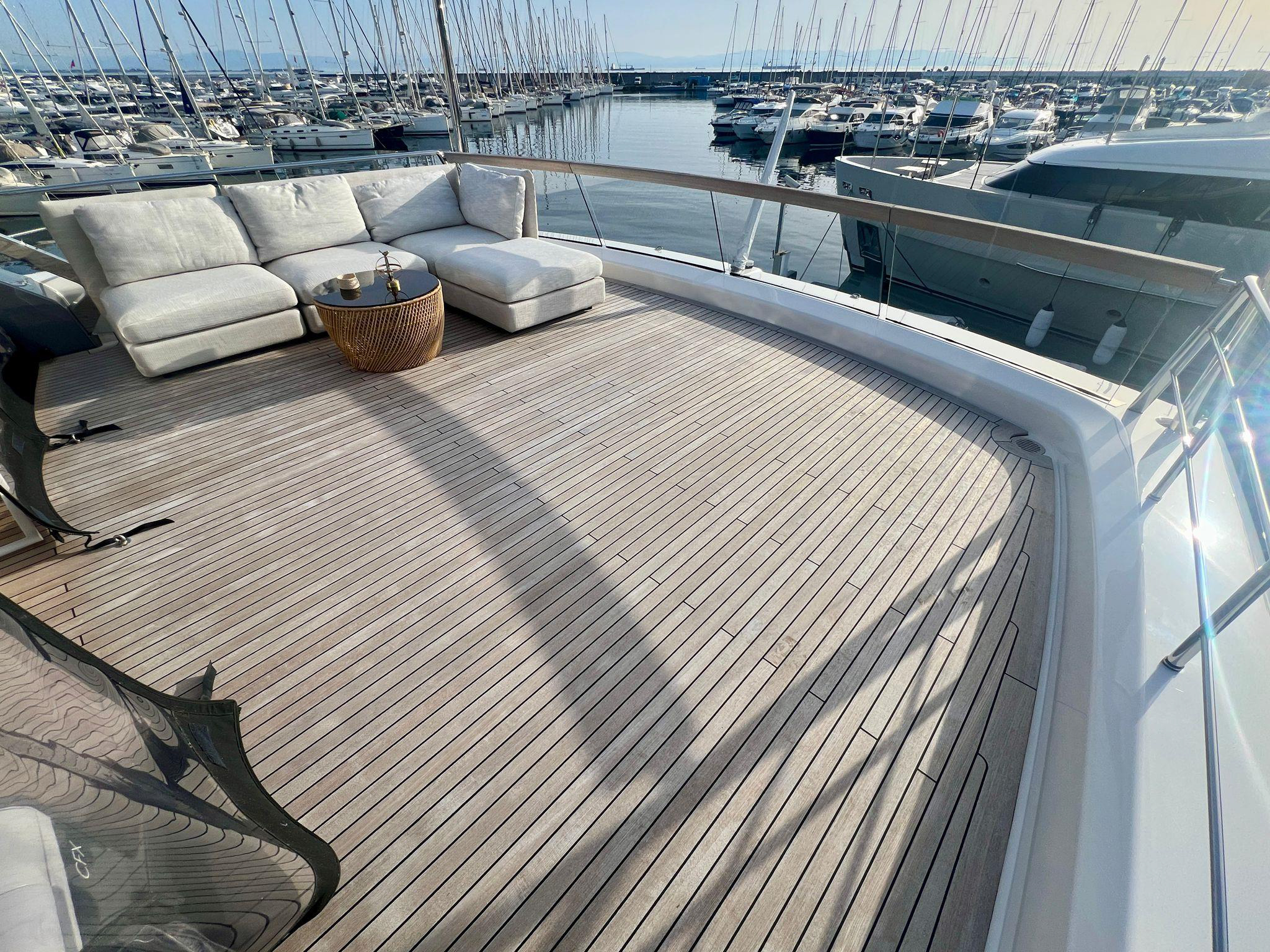 Aft of flybridge with Roda sofa, two Roda Harp sunbeds and two Roda Leaf coffee tables