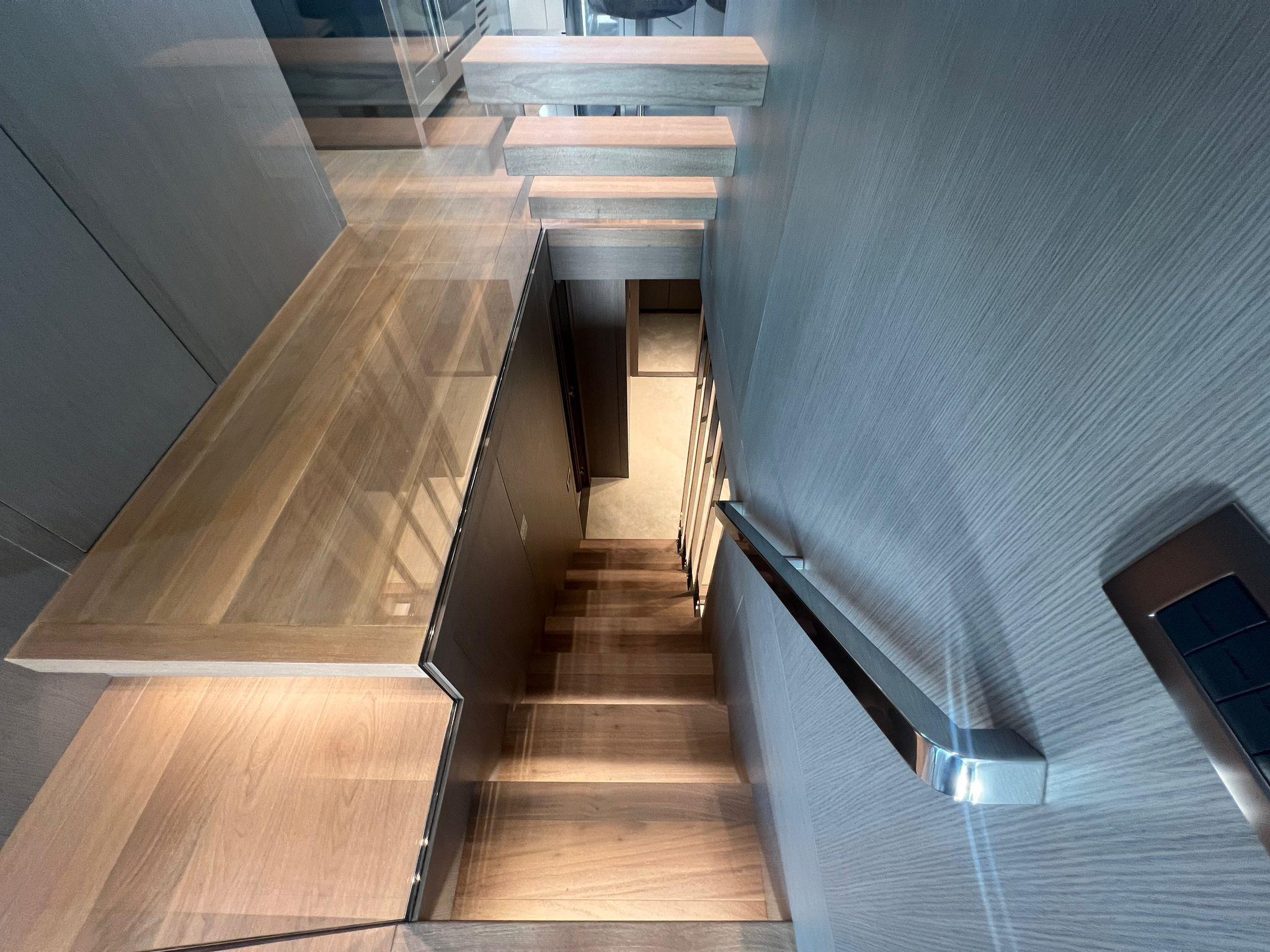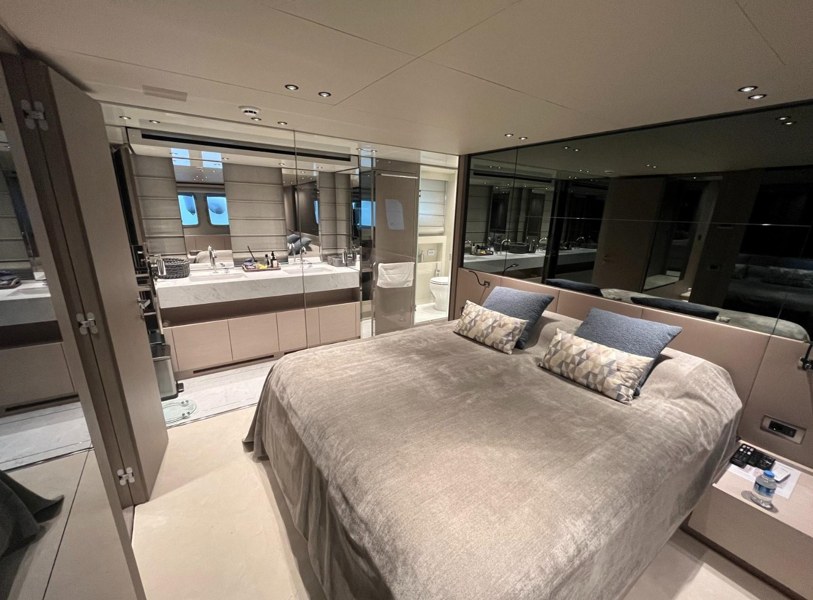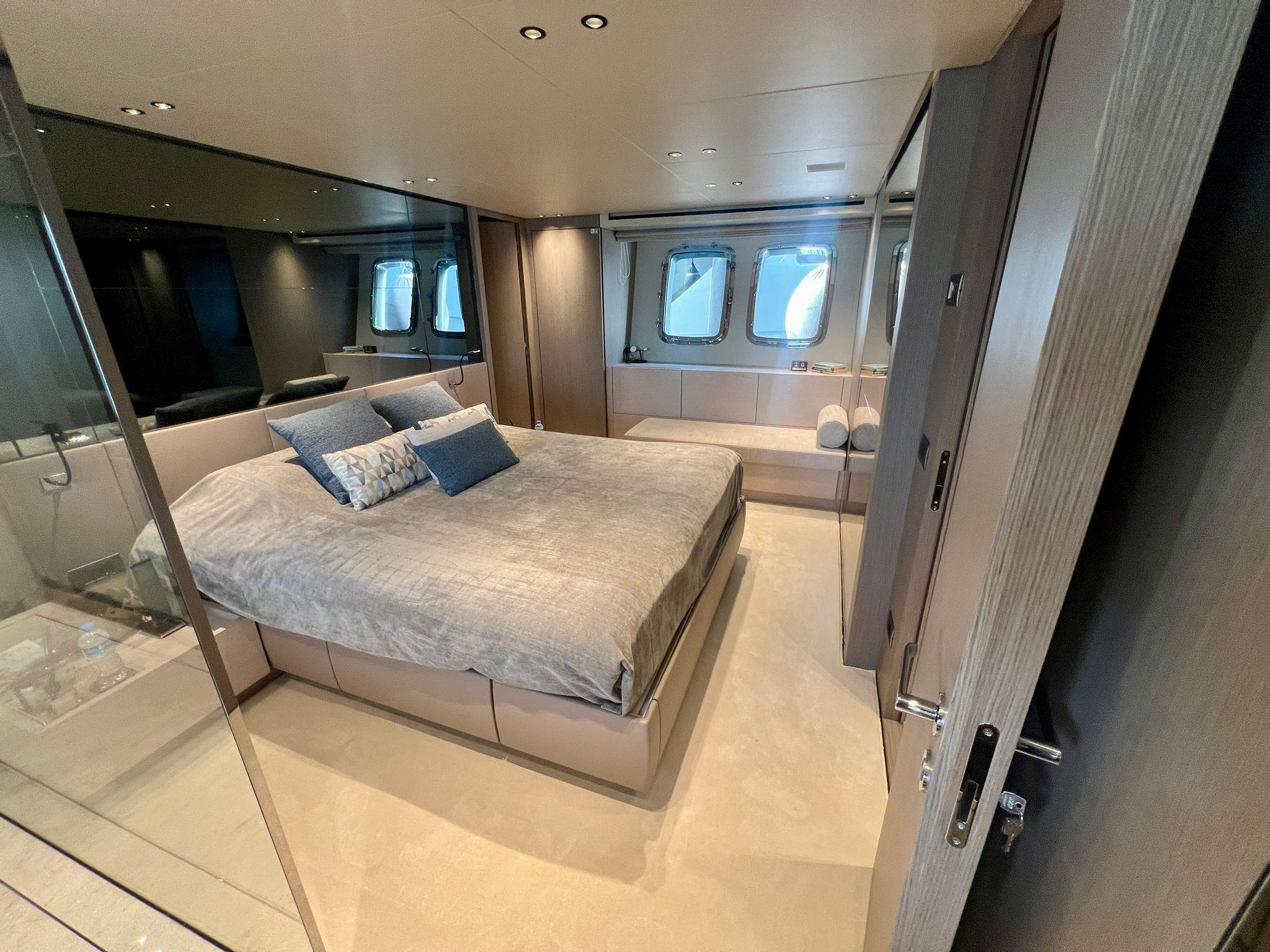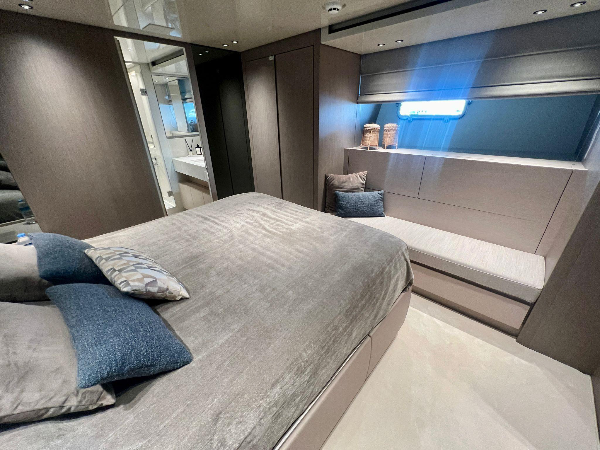 Lower deck aft and full beam with double bed, bedside tables, chaise lounge to port, 50" TV behind stopsol mirror, walk in wardrobe located aft