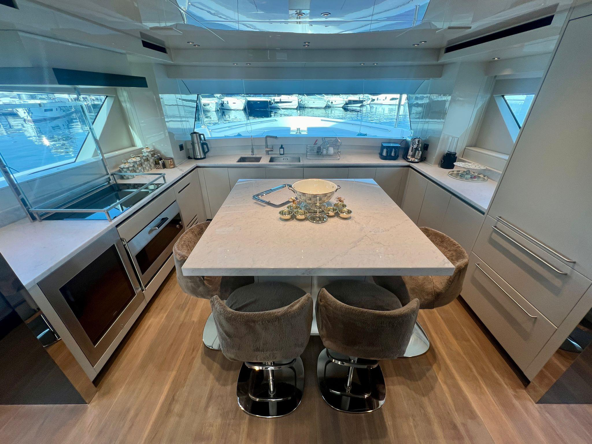 Country kitchen open galley forward with access to port and starboard side decks, Carrara marble worktops and island worktop with breakfast bar with four Minotti dining stools, full height fridge with freezer drawers, additional undercounter fridge and freezer, rapid dishwasher, twin sinks, 75cm electric cook top, 90cm Miele oven, 20 bottle Miele wine cooler, extractor fan and storage cupboards