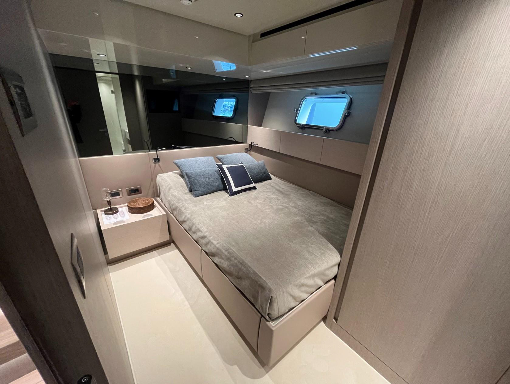 Located forward with double bed, bedside tables, carpet, sofa, hanging wardrobe, sofa to starboard openable porthole and storage