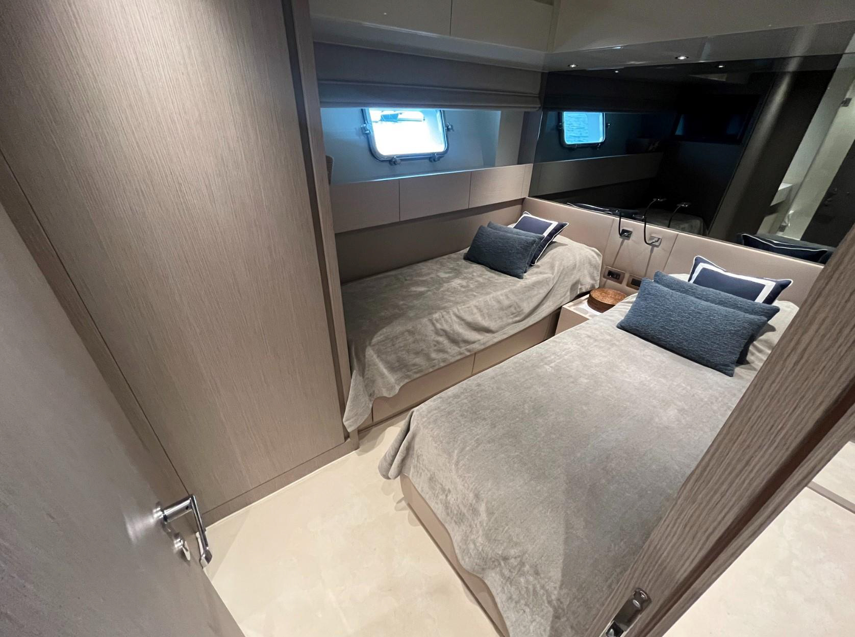 Accessed from cockpit two crew cabins; captain's cabin to port with bunk and one to starboard with two bunks, separate shared bathroom with toilet, sink and shower