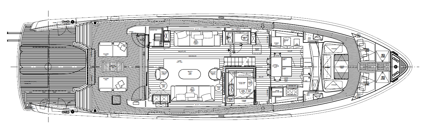 Two Roda Eden sofas, electric up/down coffee table, storage port and starboard with access to beach club area