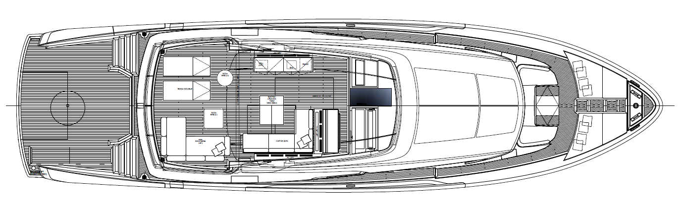 Electric up/down fold out teak table, built in U-shaped sofa, port and starboard sun pads, large storage locker below with access to mooring and anchoring gear and sun awning with stainless steel polls