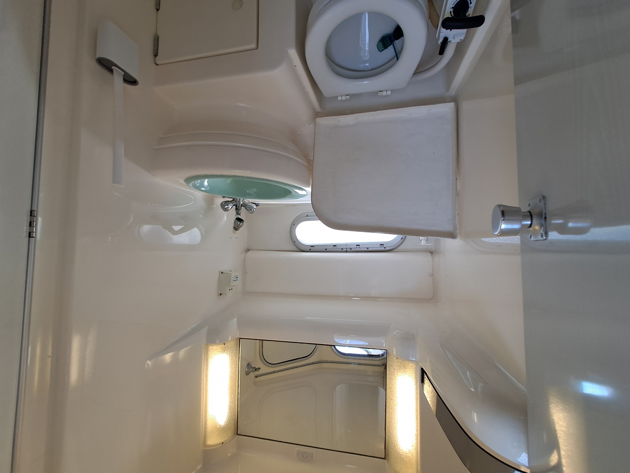 Ensuite heads to saloon and forward cabin with marine TOILET, hand basin, combination mixer tap/shower