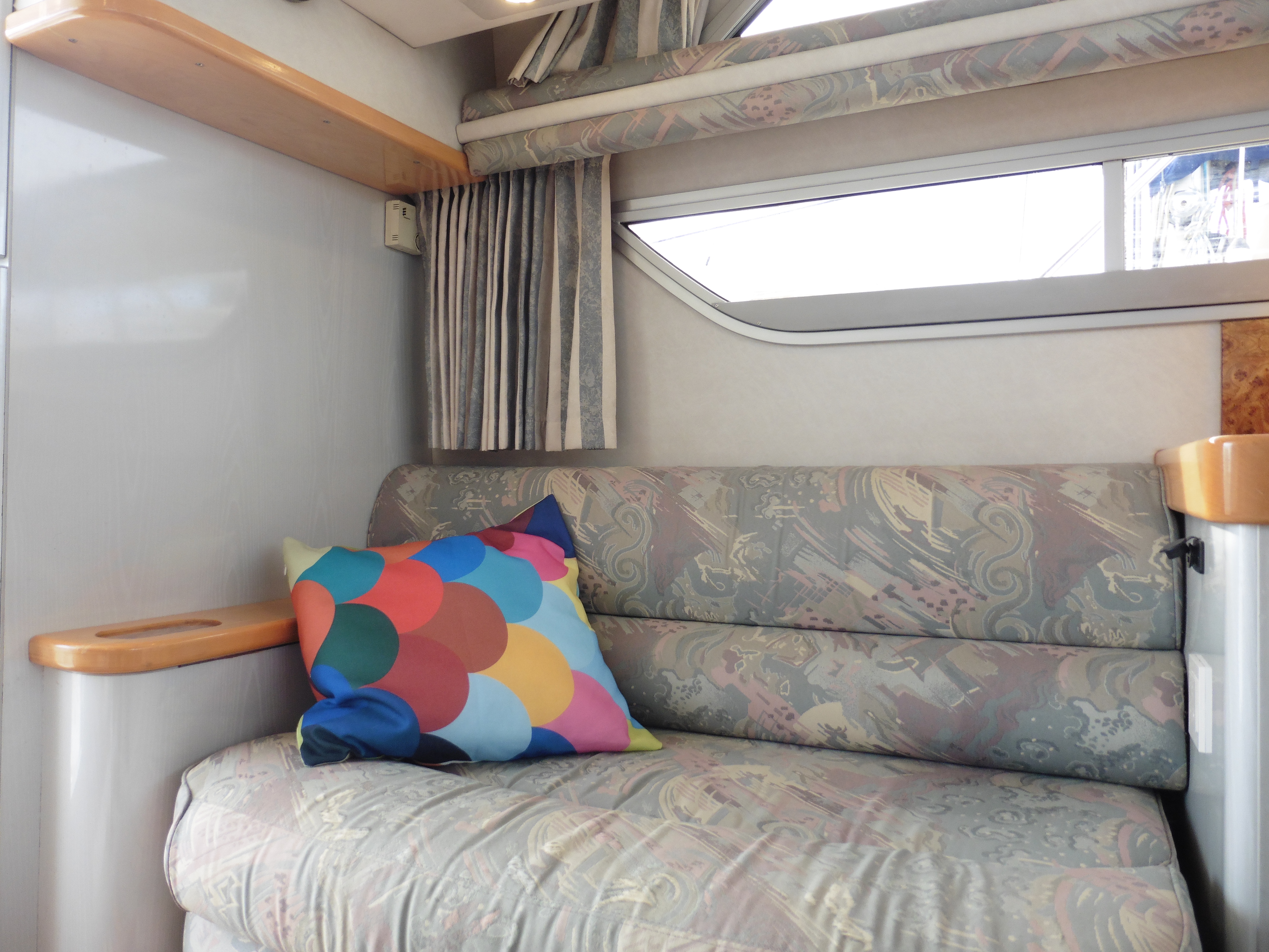 Saloon with L-shaped seating/double berth with pull out section to starboard, additional pull out double seat to port with storage, adjustable saloon table, large under floor storage, coat hanging cupboard