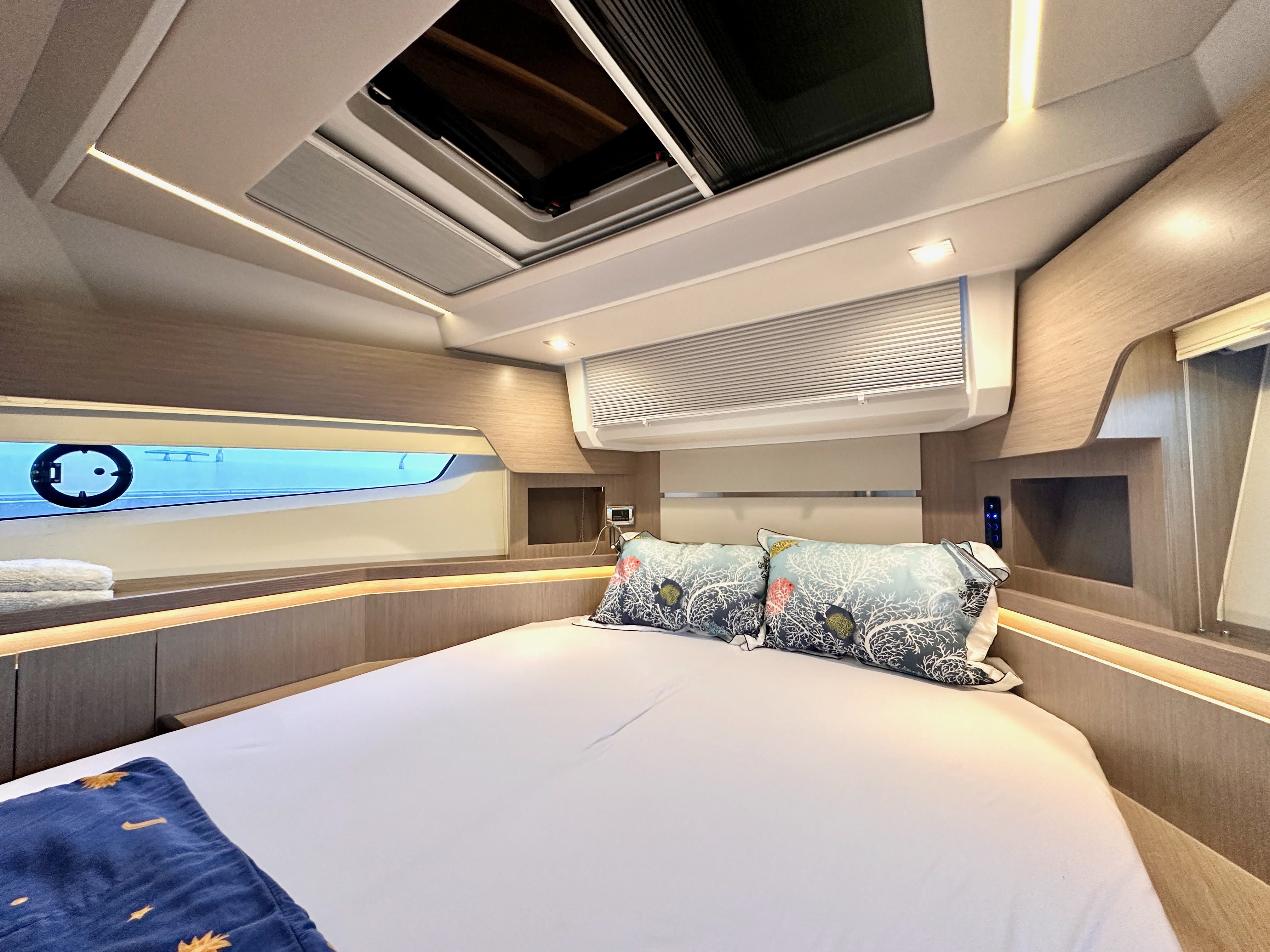 Forward VIP cabin with double berth, 2 wardrobes and sideboards with stowage and two bedside tables. 1 drawer underneath the bed. 3 Skylights, one openable, direct access to separated head. Fully equipped head with separate shower stall with handheld shower, and comfort seat with wood cover.