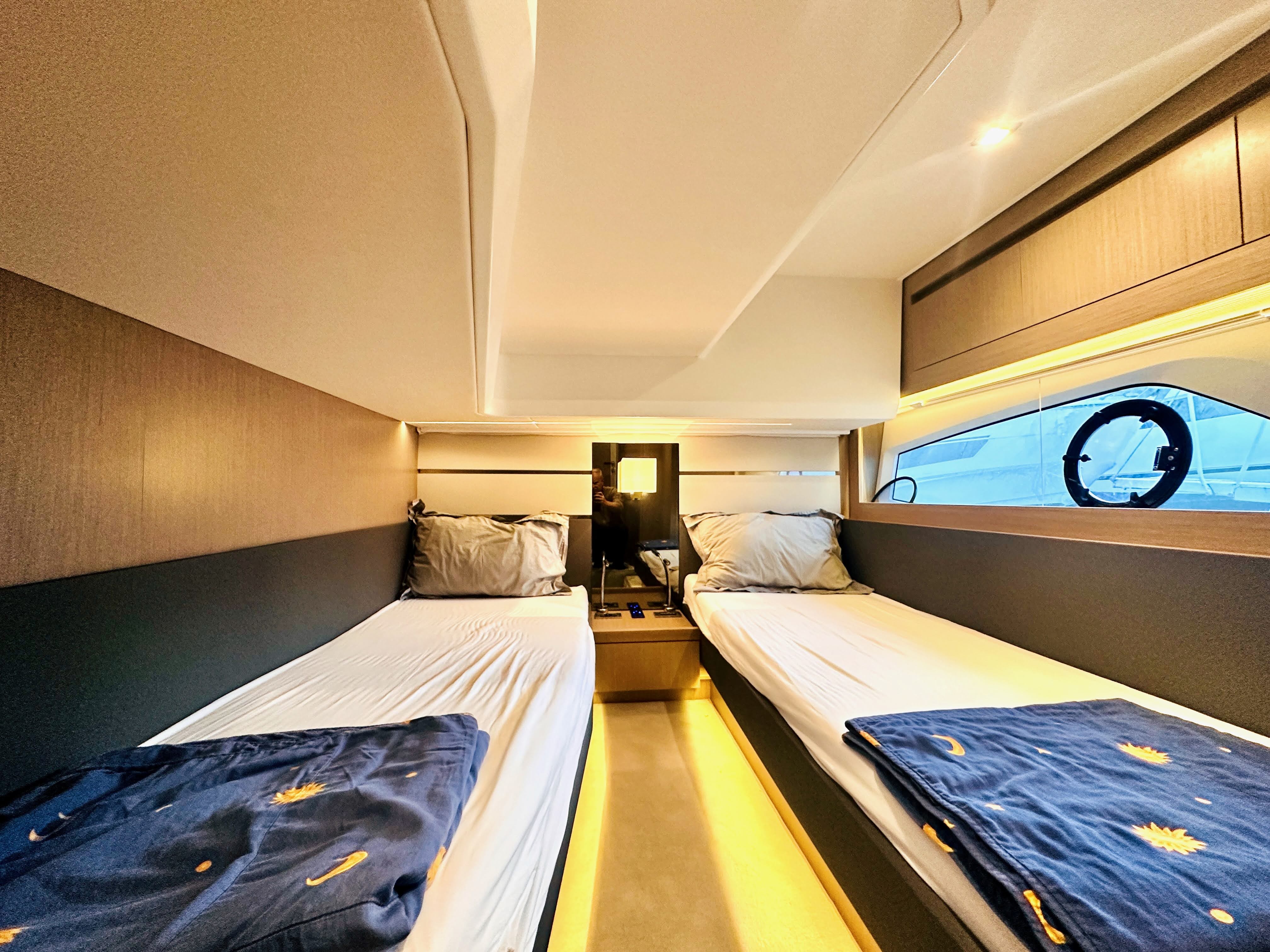 Portside twin cabin with single beds and storage.