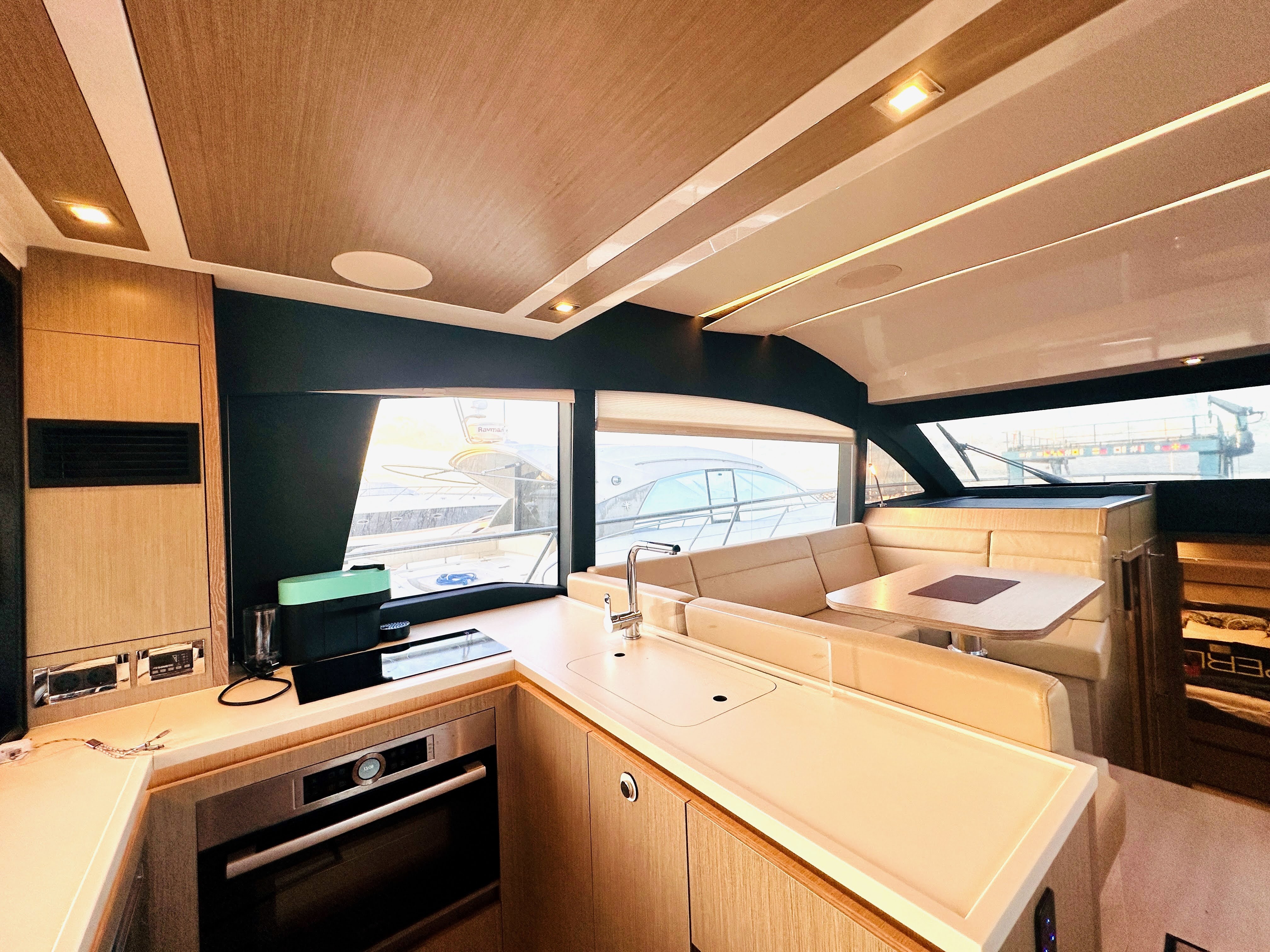 The light and spacious saloon has the "L" shaped galley aft and the dining area to port midships. Helm station to starboard.