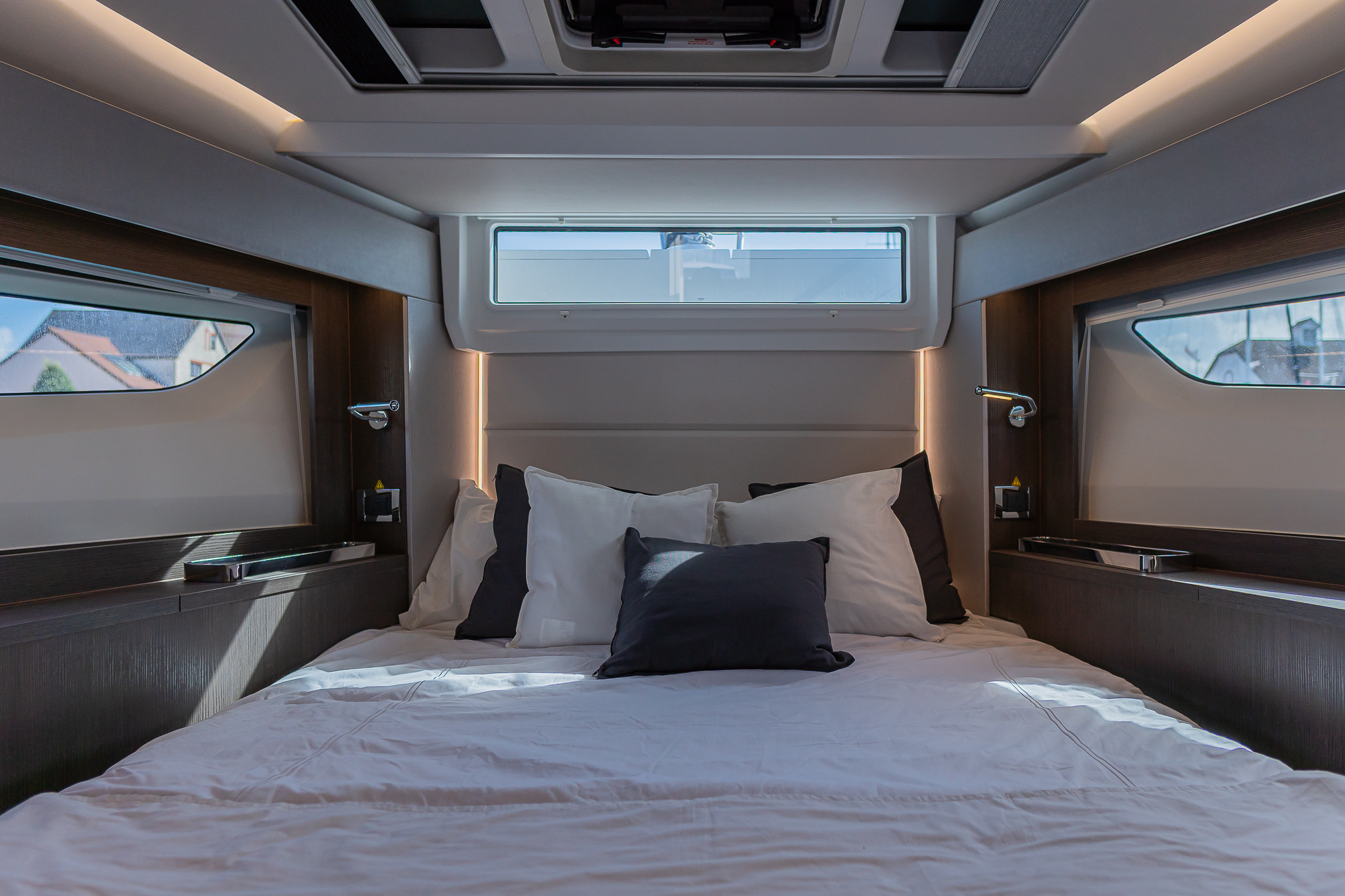 Owners cabin forward, small and large wardrobes & additional stowage. Mosquito nets on forward hatch.