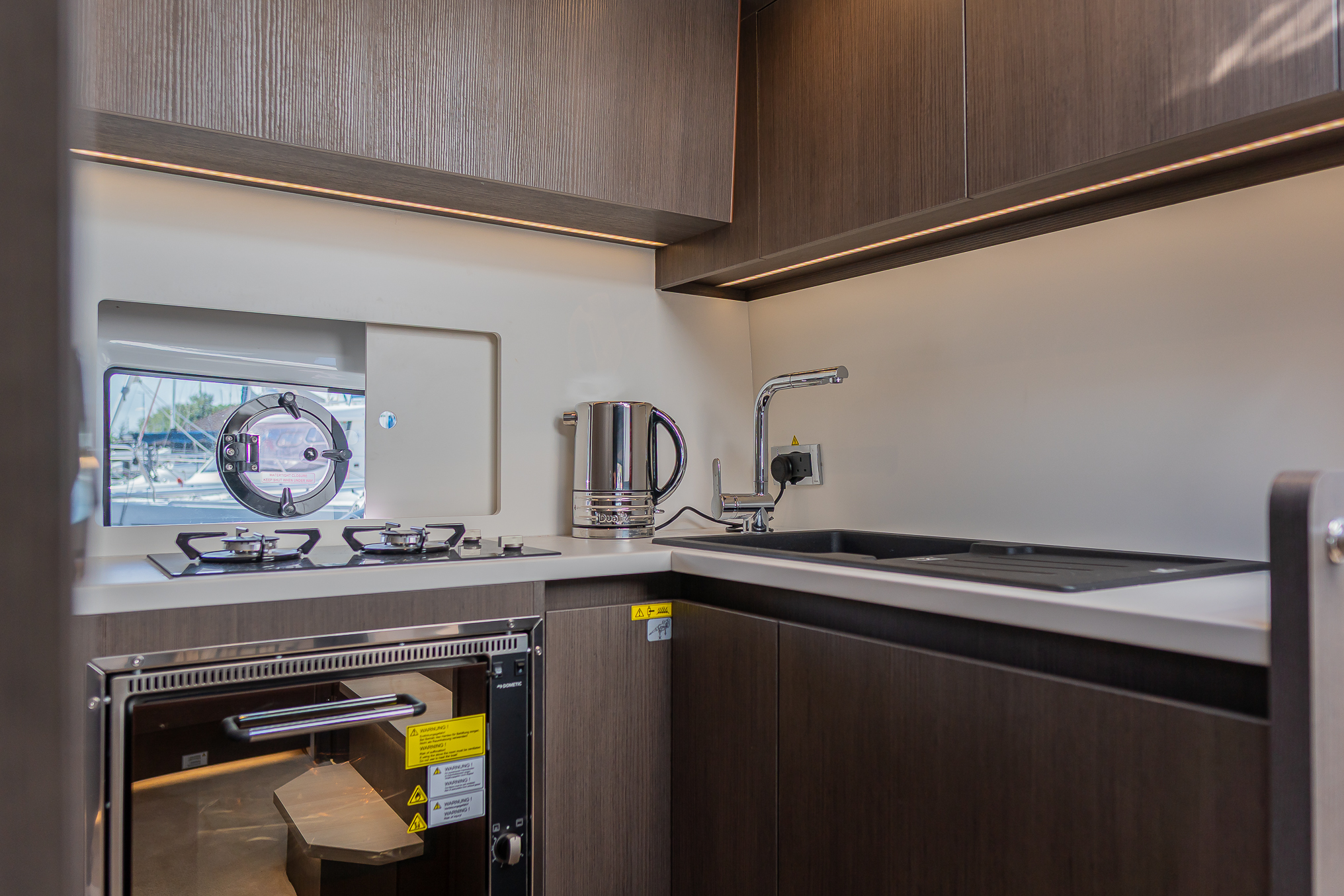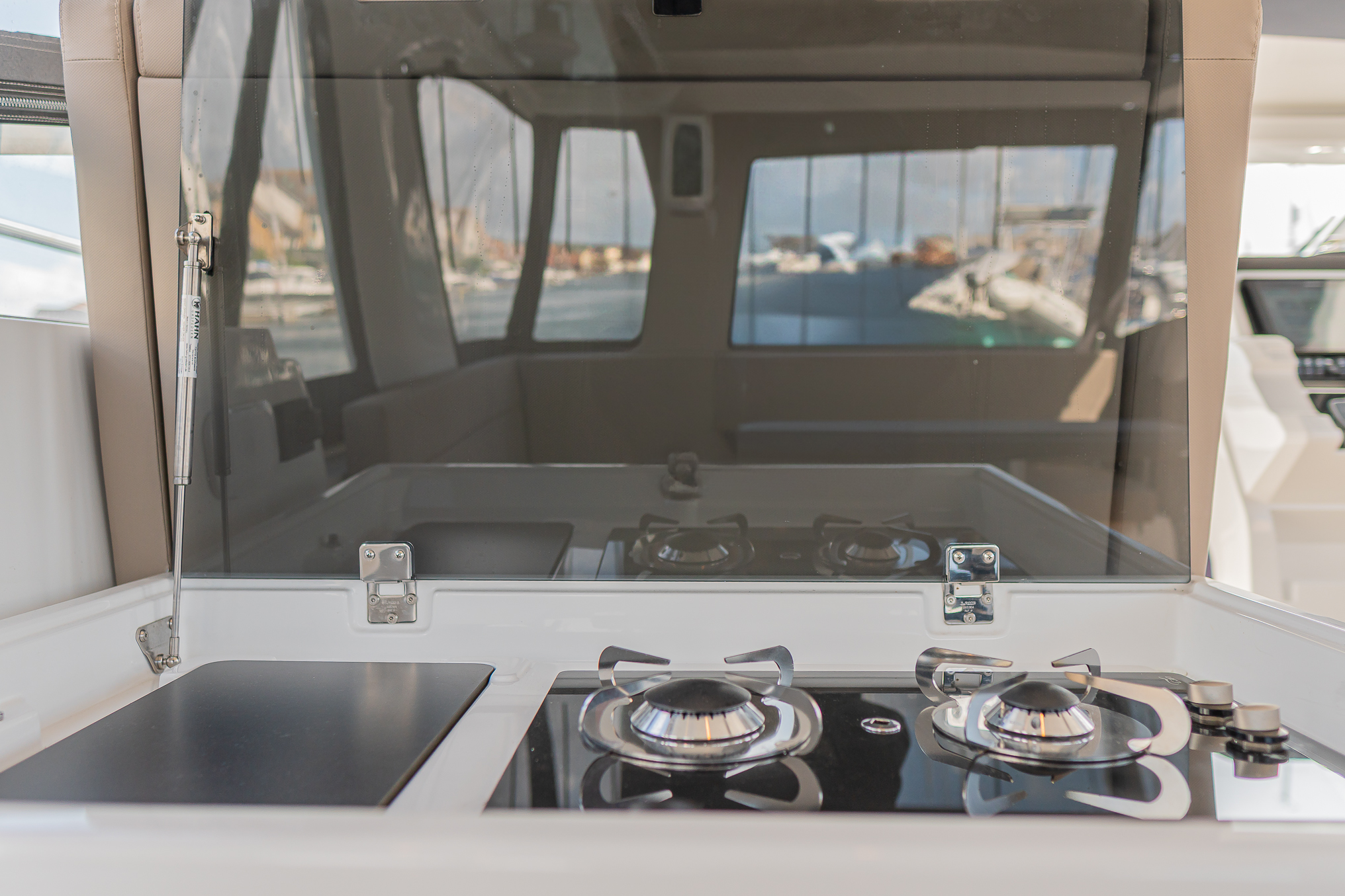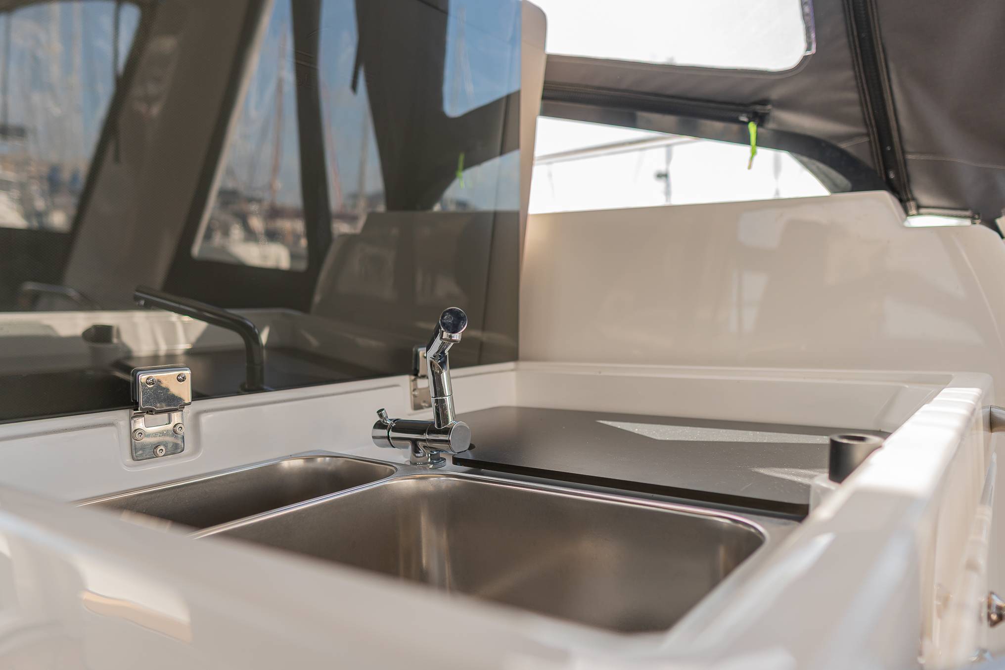 Cockpit seating "L"-shaped bench with fixed backrest with storage underneath and teak bar. Galley element on port side with 2-burner gas stove, fridge (90 l), worktop and storage underneath. Starboard side of cockpit with sink, hot and cold water, worktop and storage underneath