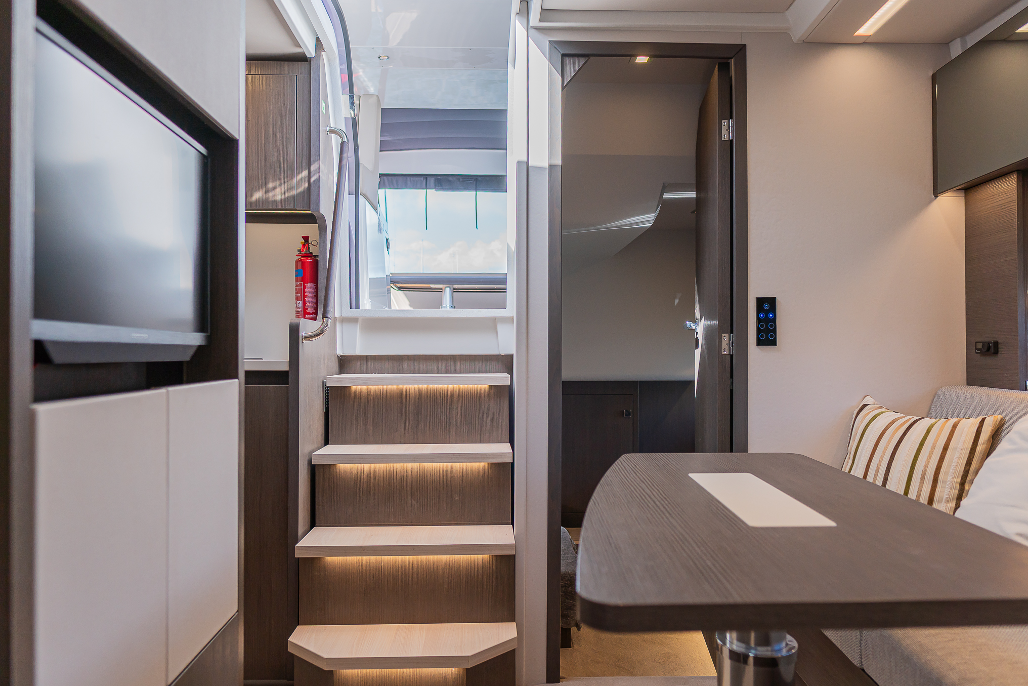 Saloon with L-shaped sofa (converst to occasional single berth courtesy of hi-lo leg), table, stowage and hanging locker. Flatscreen TV