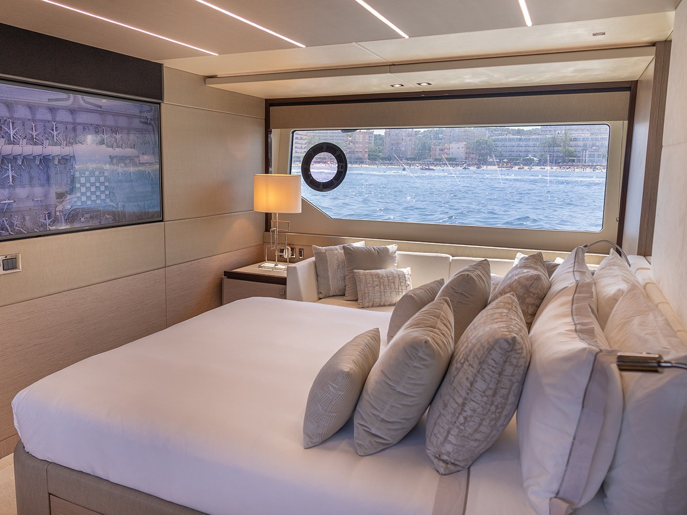 Owners cabin with a double berth, lots of storage, Samsung 55" television, warm white ceiling strip lighting, vanity/desk area, sofa to port side and a large window for lots of natural light with an opening and closing port hole. Attached is an ensuite with twins sinks, shower, tecma electric toilet, heated towel rail and plenty of storage.