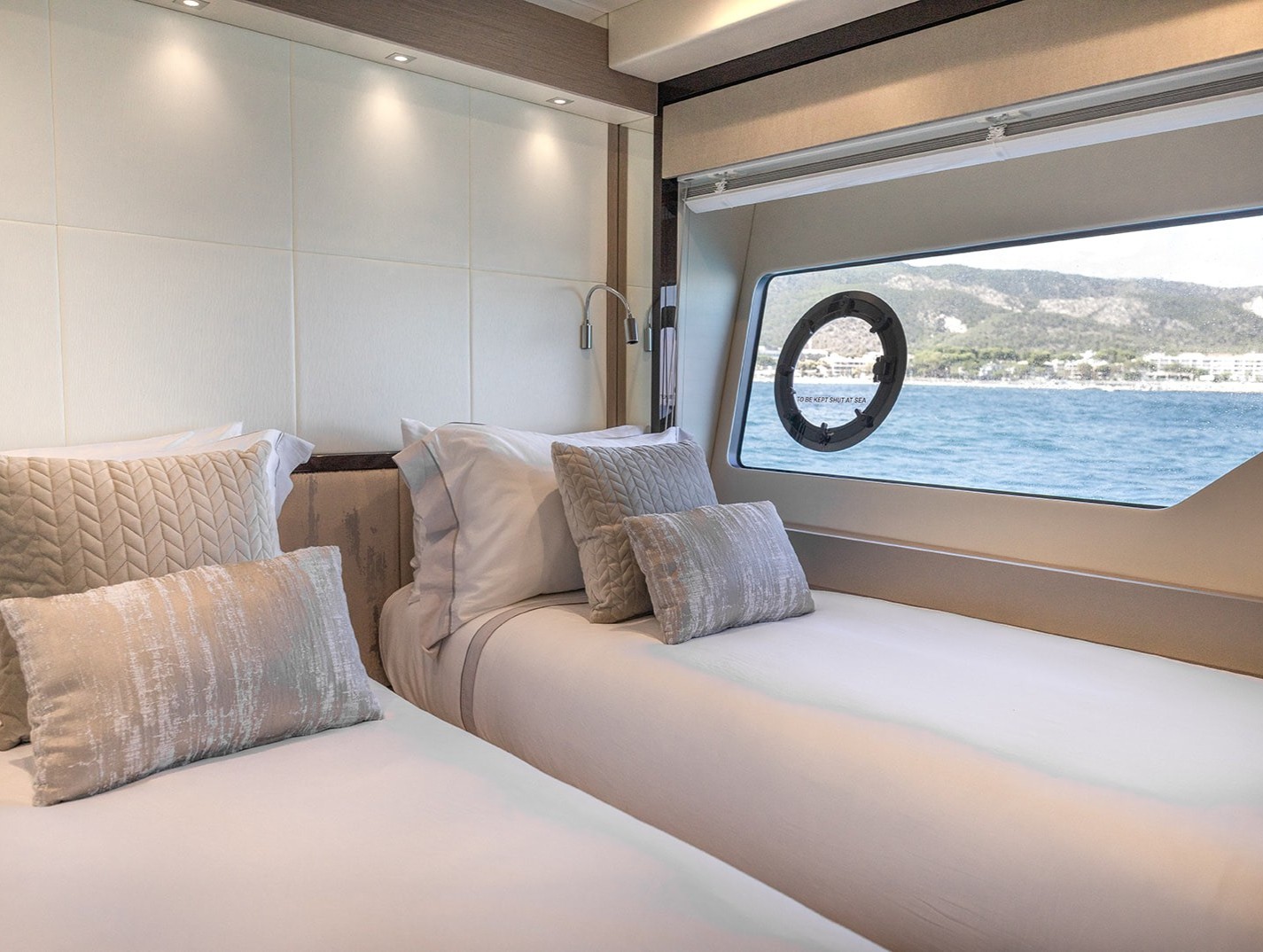Two single beds in both twin cabins with spot down lights, storage, Samsung TV and large side hull windows with an opening and closing port hole. Attached onto an ensuite with a tecma electric toilet, shower, sink and a heated towel rail.