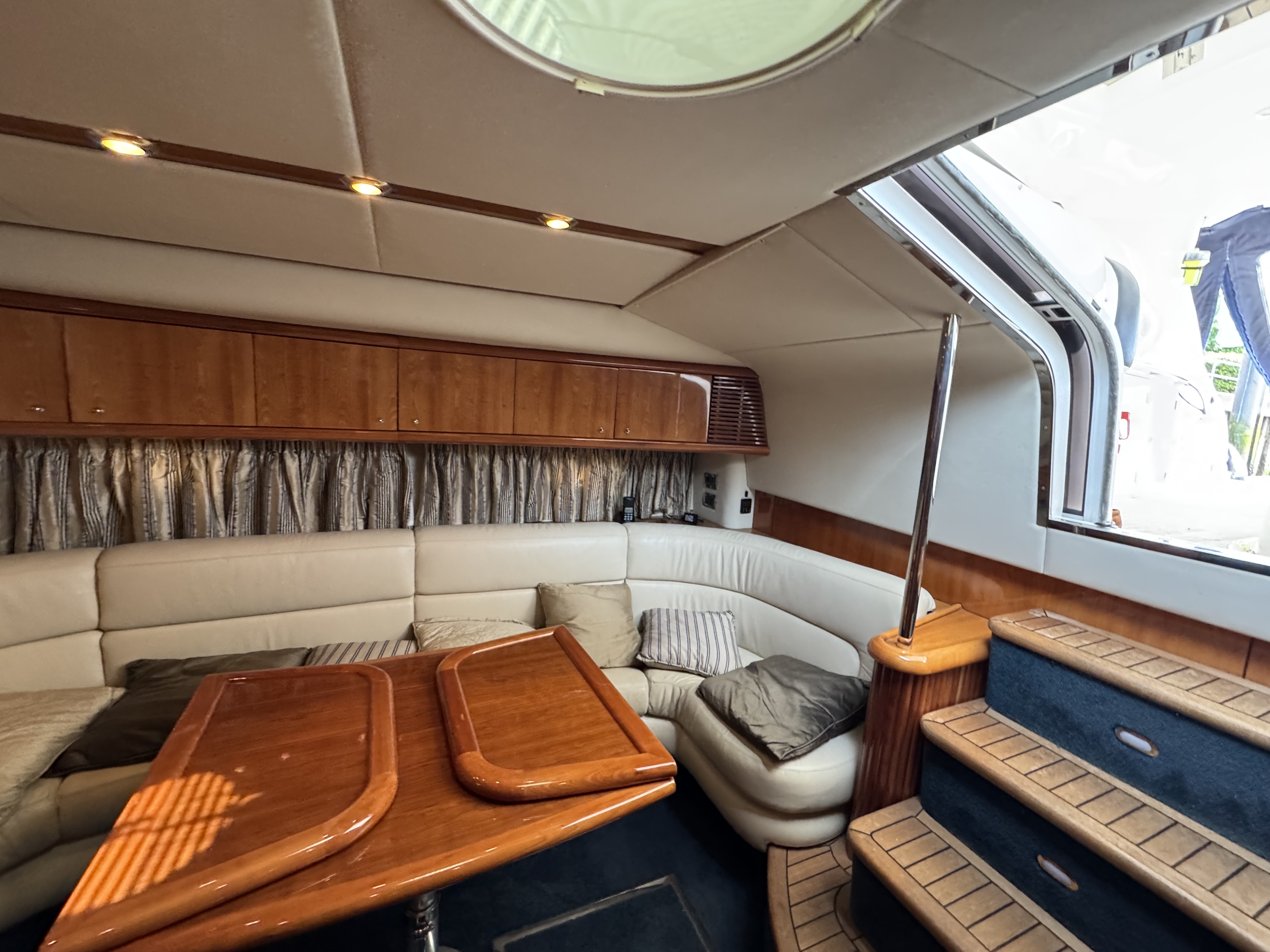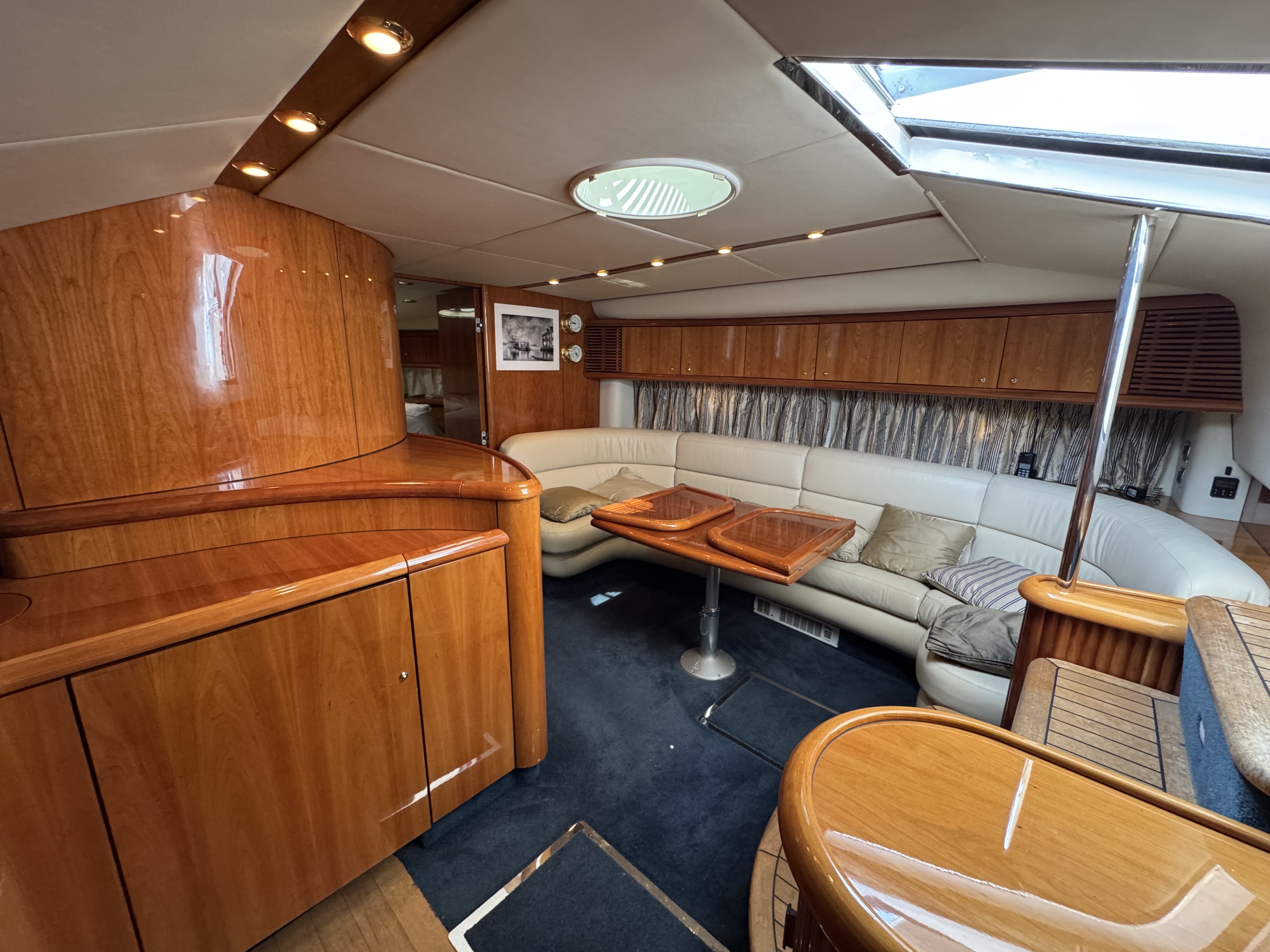 Large seating area along starboard side around coffee table which drops and converts into a double berth or folds out to form a large