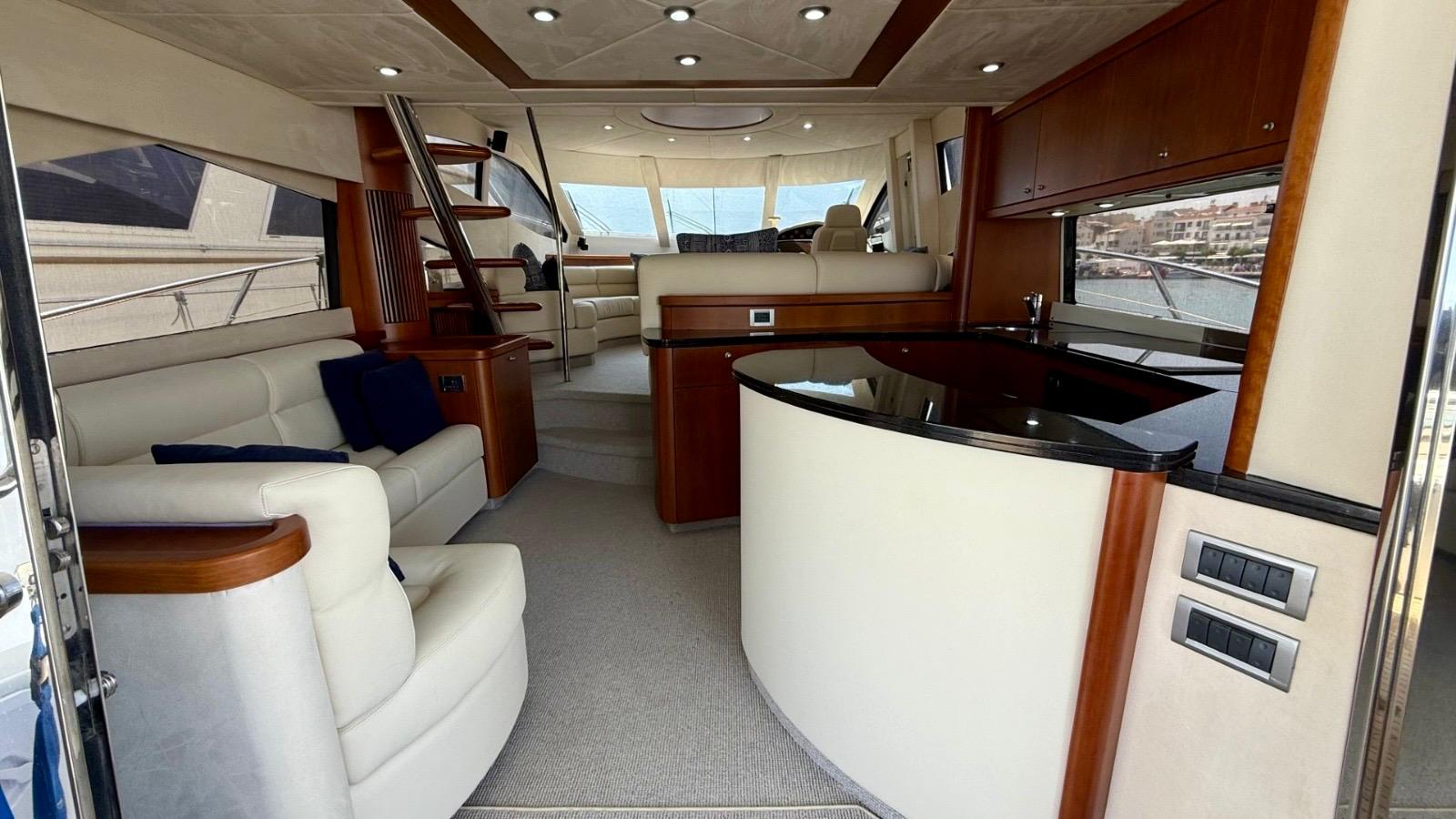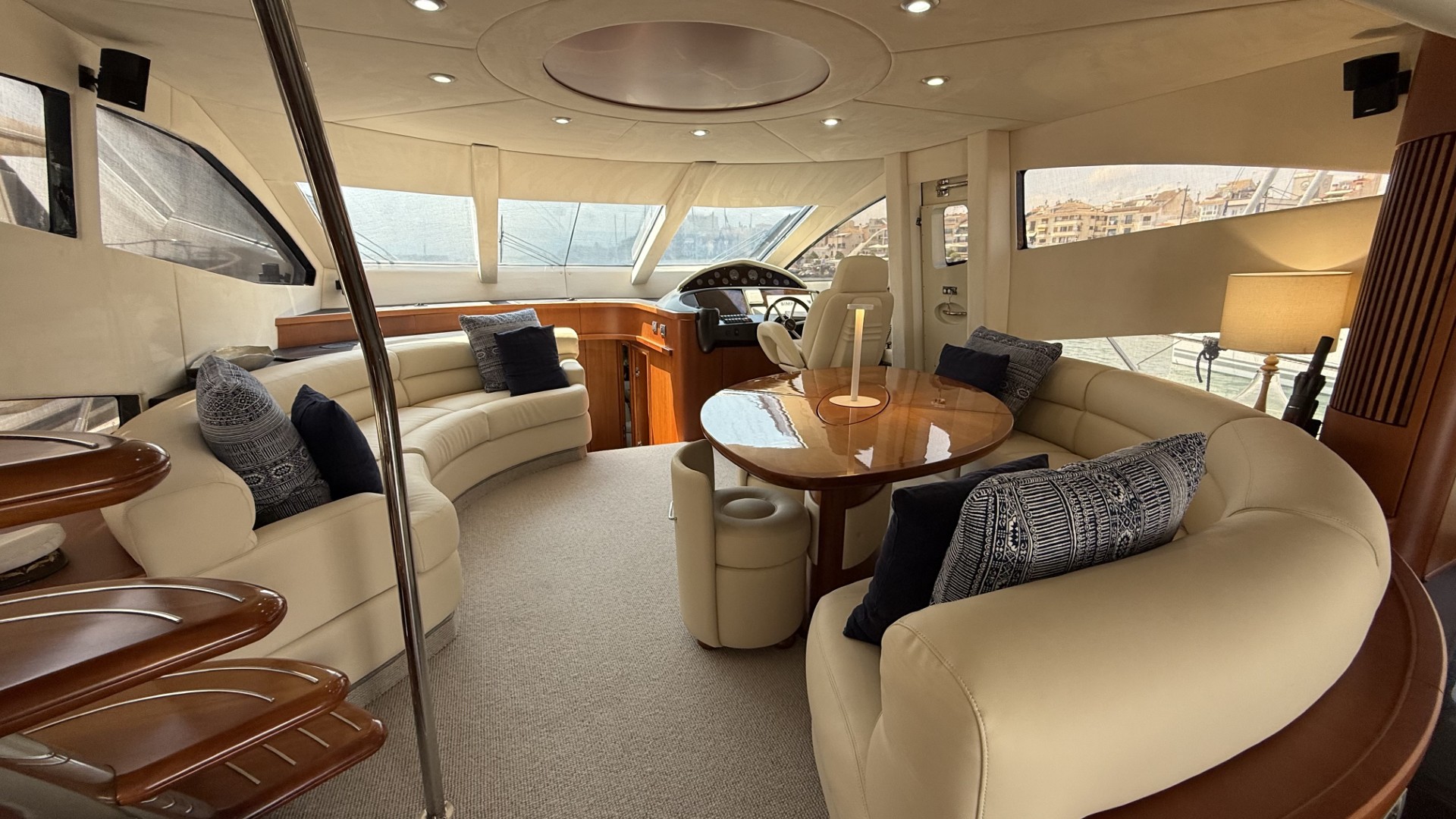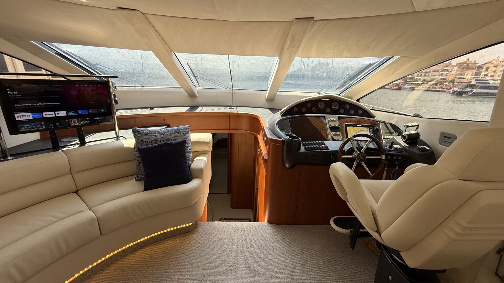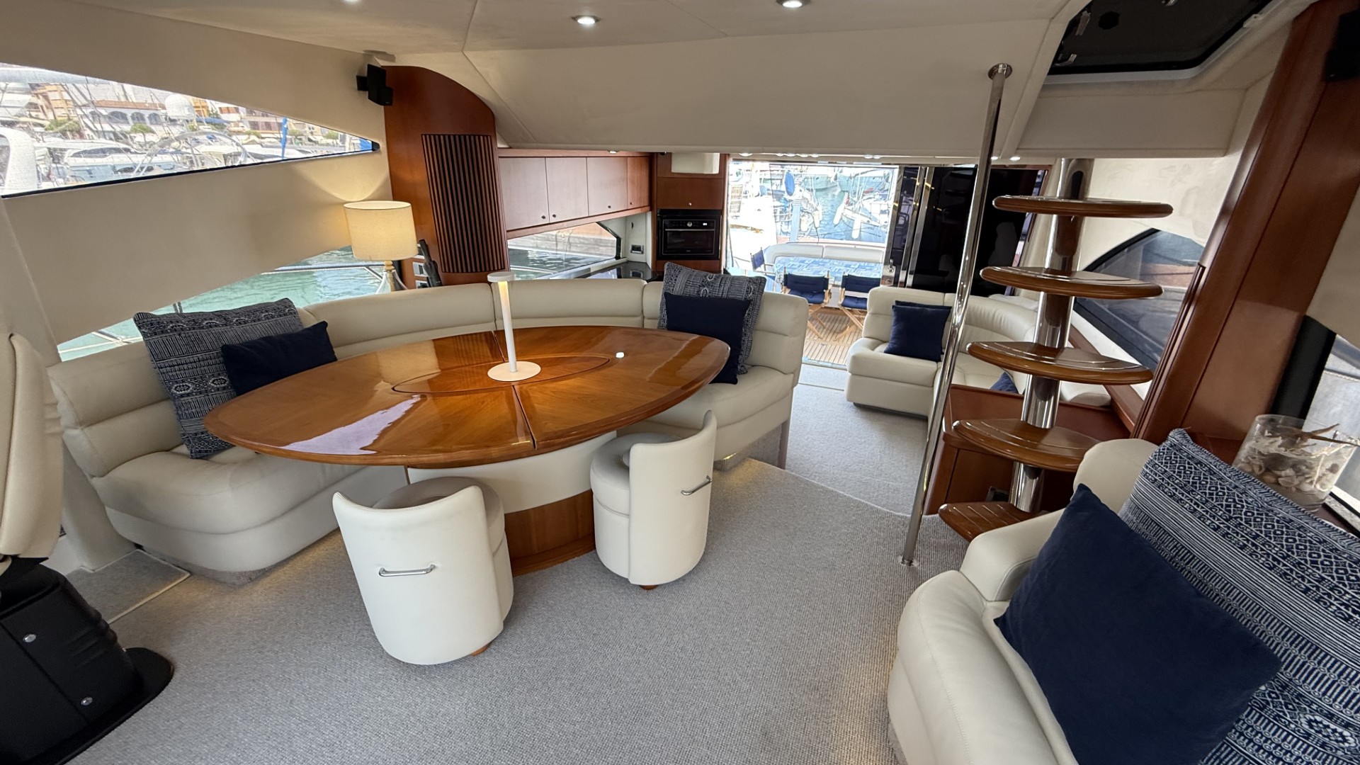 The yacht features a spacious and light-filled saloon with large panoramic windows, creating a bright and welcoming atmosphere. A distinctive feature of the Manhattan 66 is the internal staircase leading directly to the flybridge, providing safe and convenient access while underway.