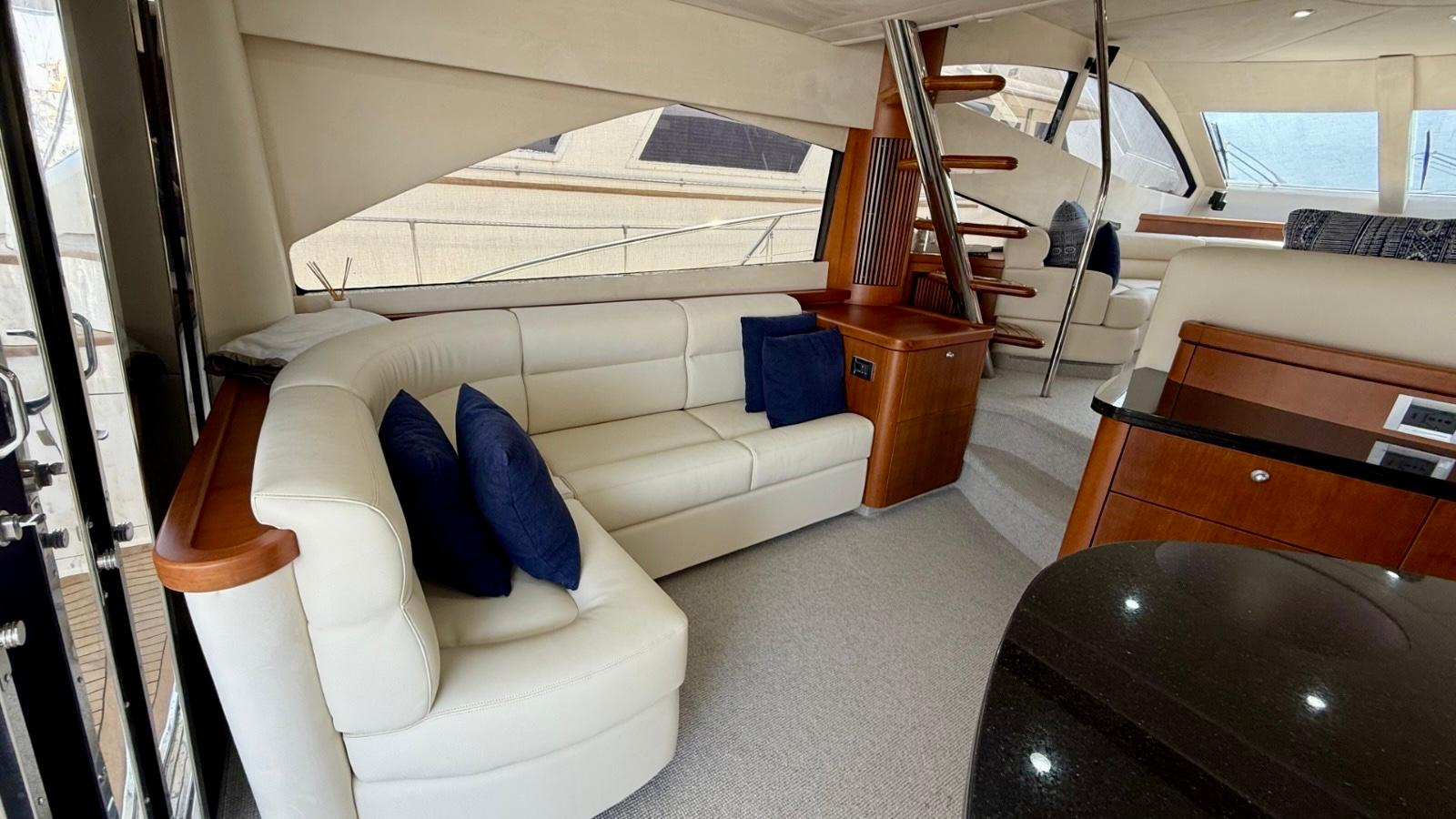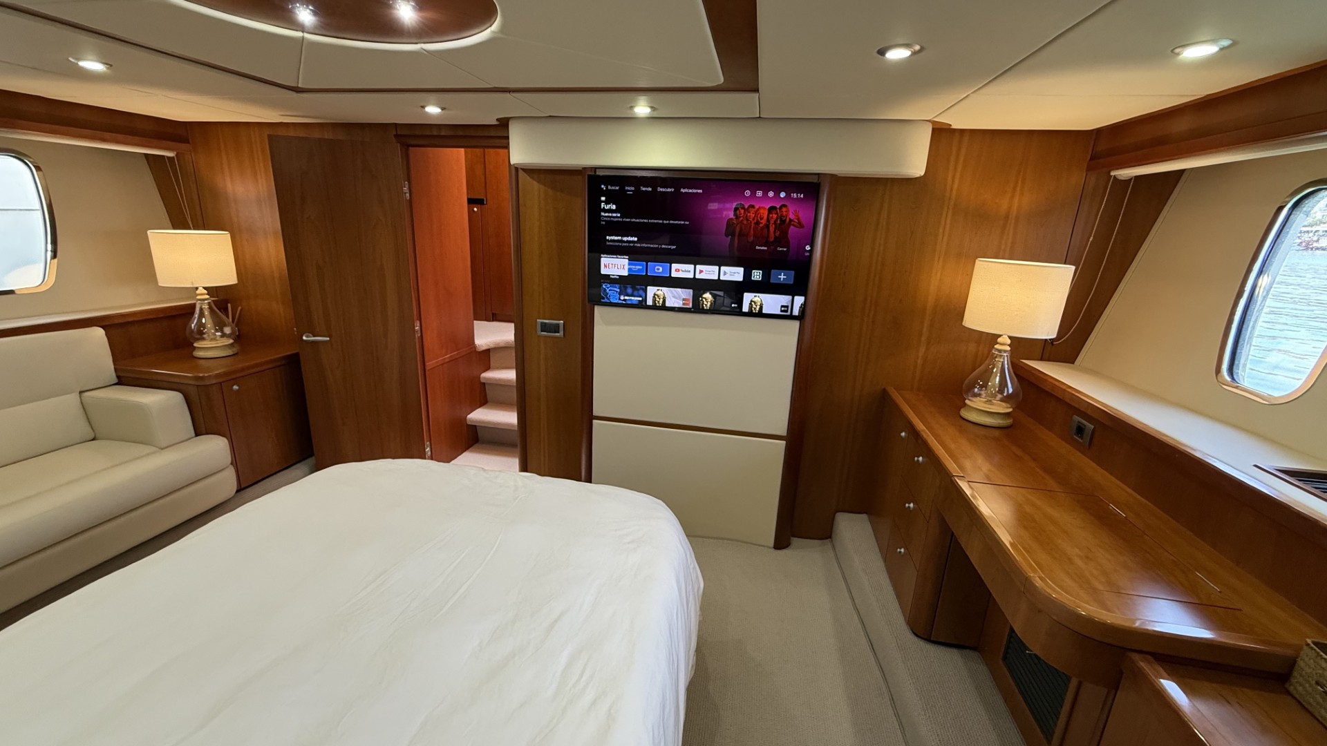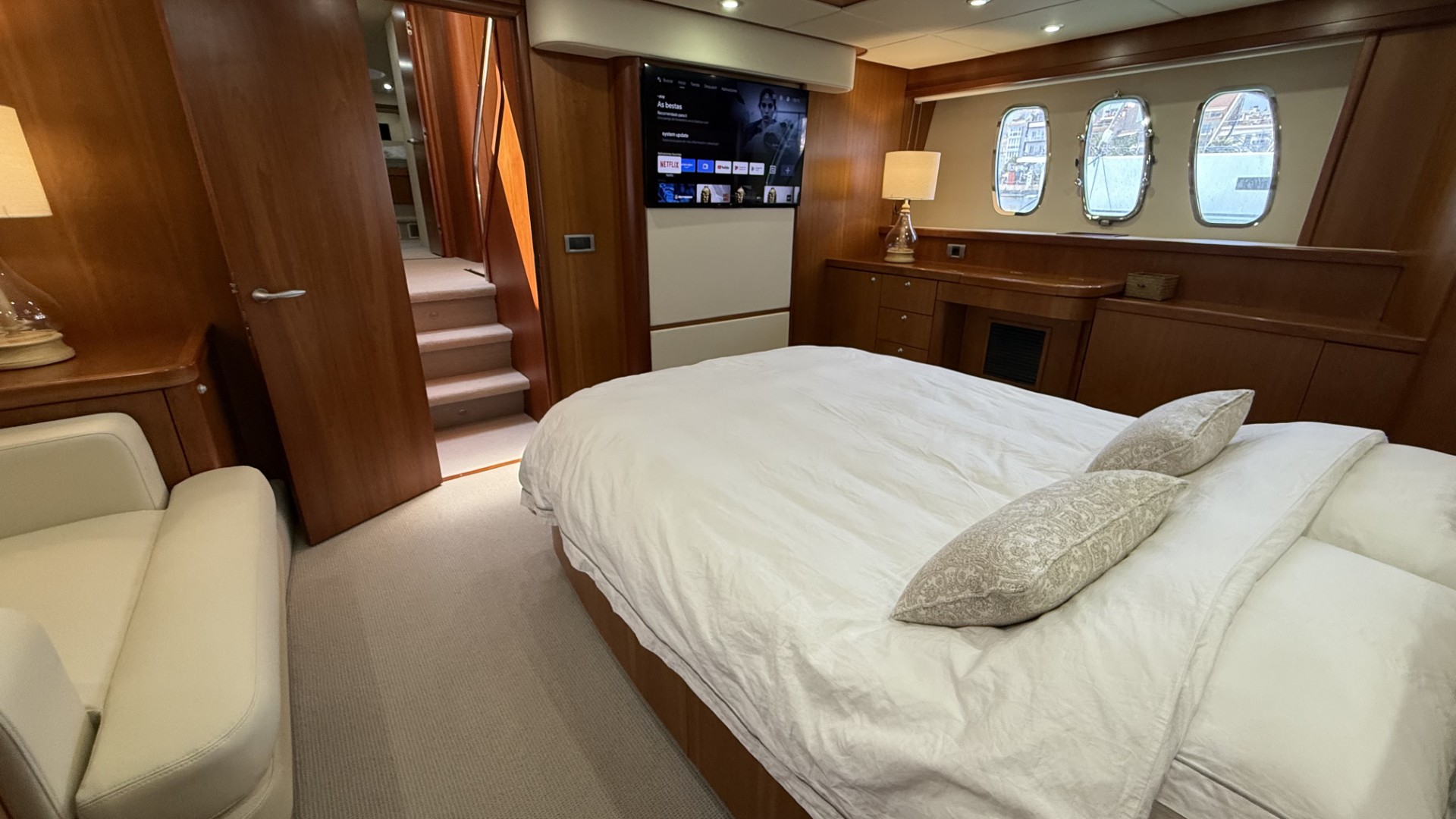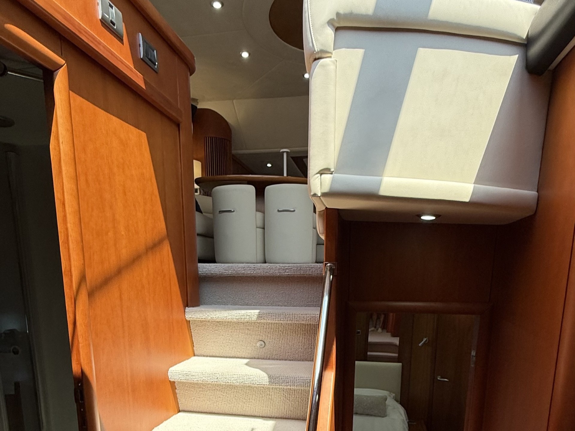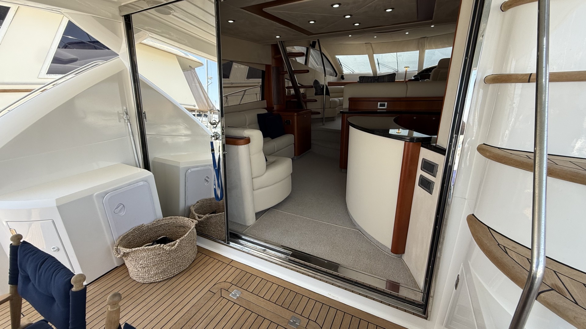The yacht features a spacious and light-filled saloon with large panoramic windows, creating a bright and welcoming atmosphere. A distinctive feature of the Manhattan 66 is the internal staircase leading directly to the flybridge, providing safe and convenient access while underway.