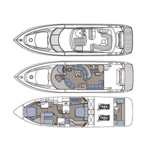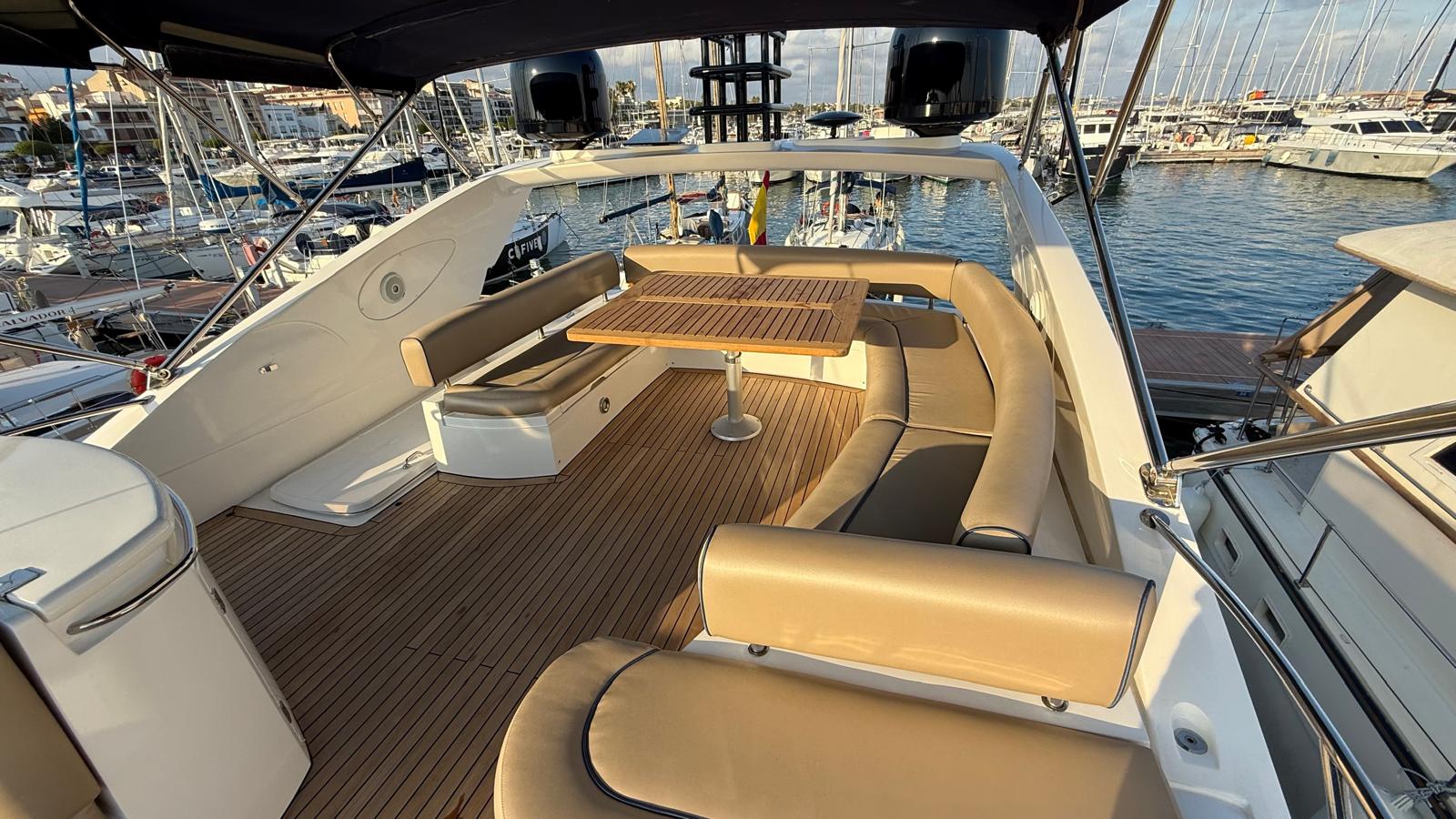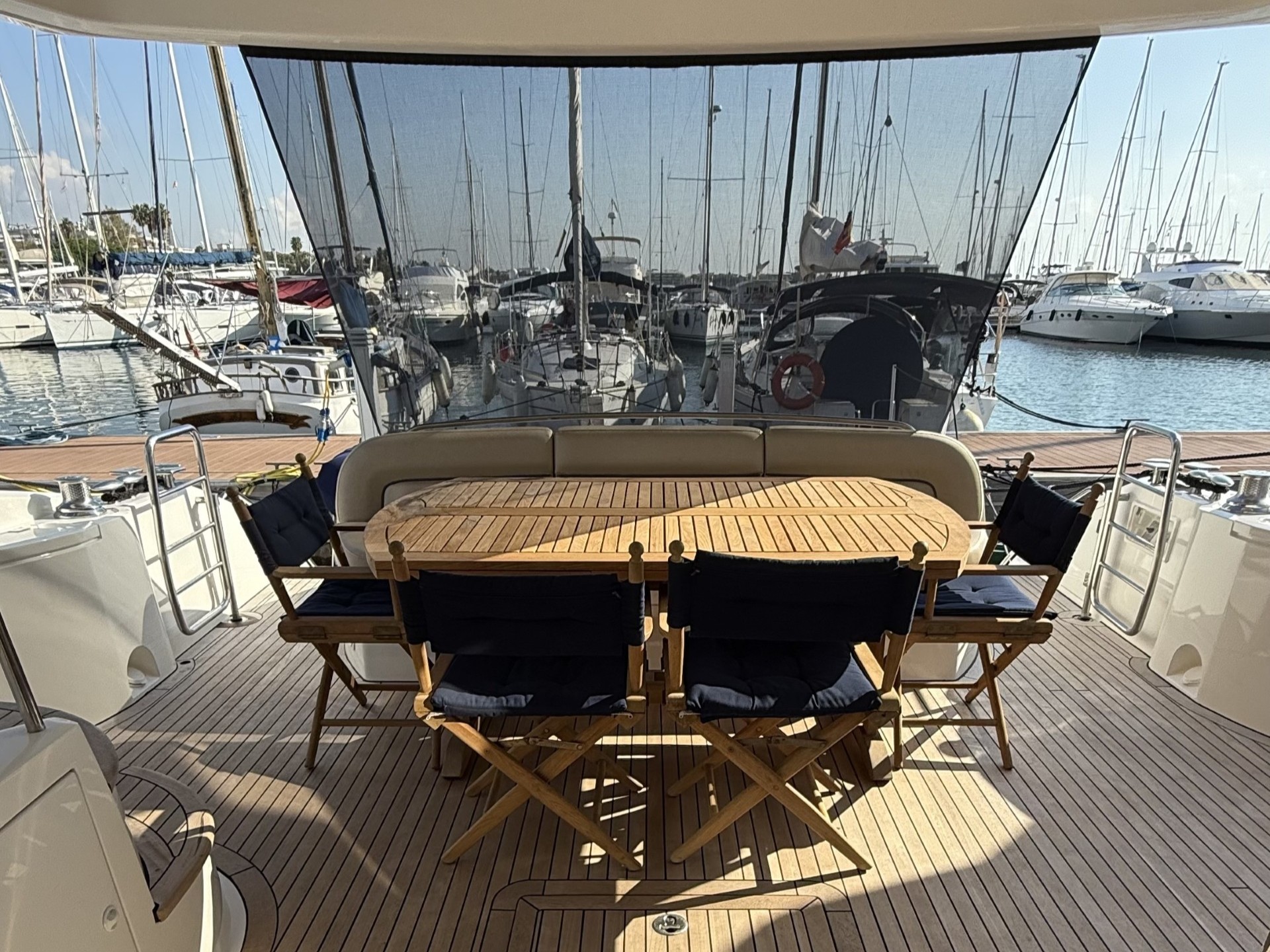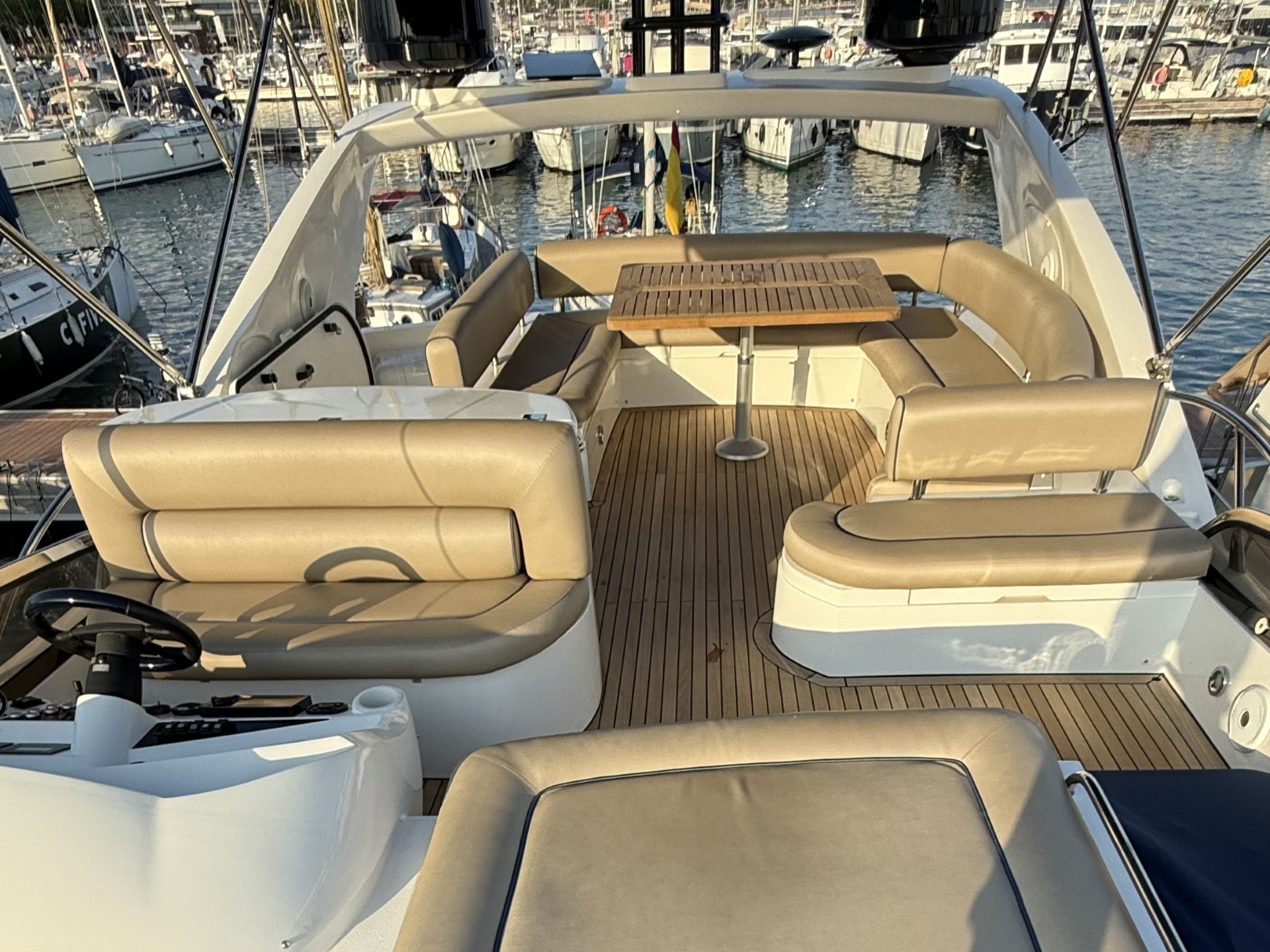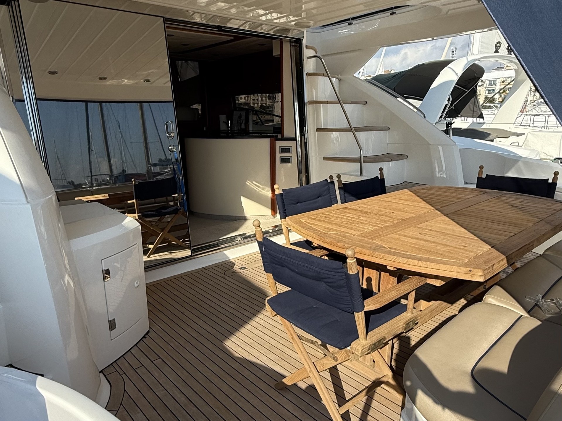 The yacht features a spacious and light-filled saloon with large panoramic windows, creating a bright and welcoming atmosphere. A distinctive feature of the Manhattan 66 is the internal staircase leading directly to the flybridge, providing safe and convenient access while underway.