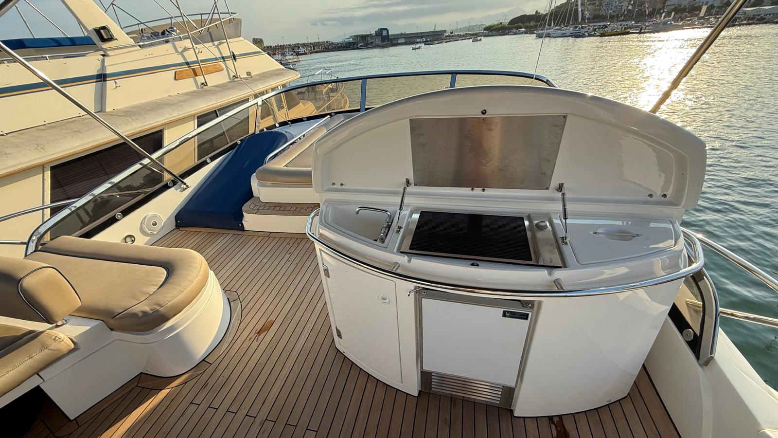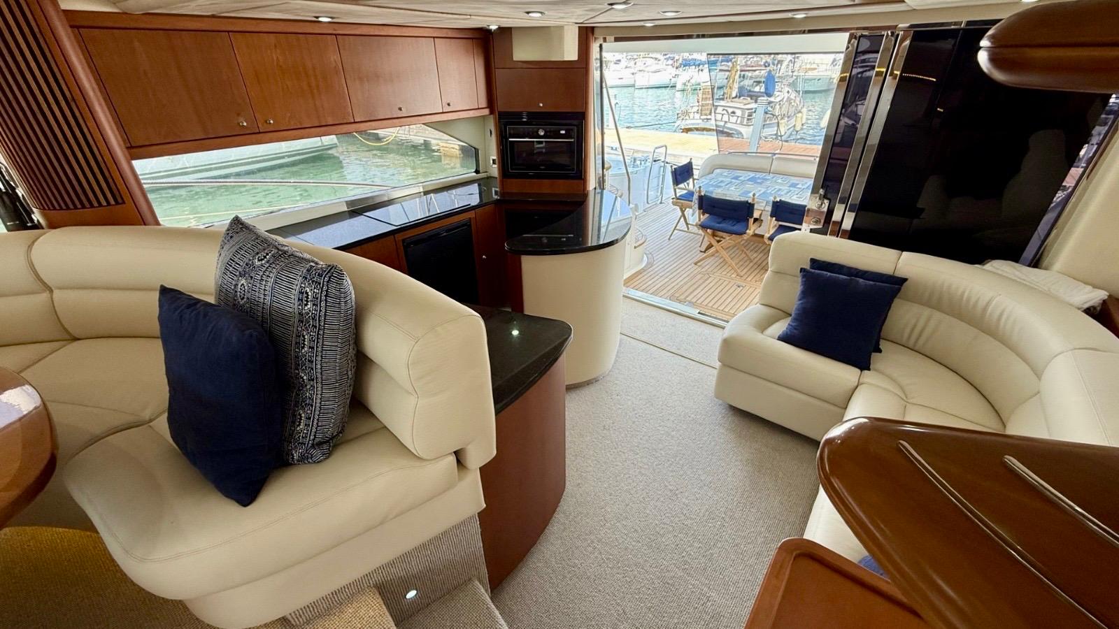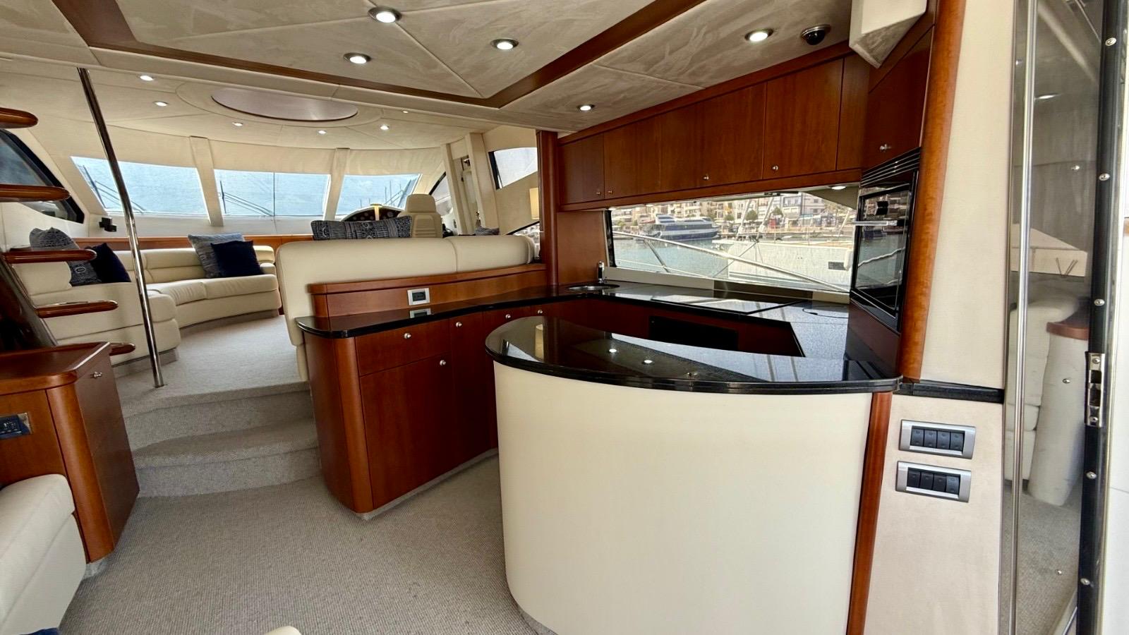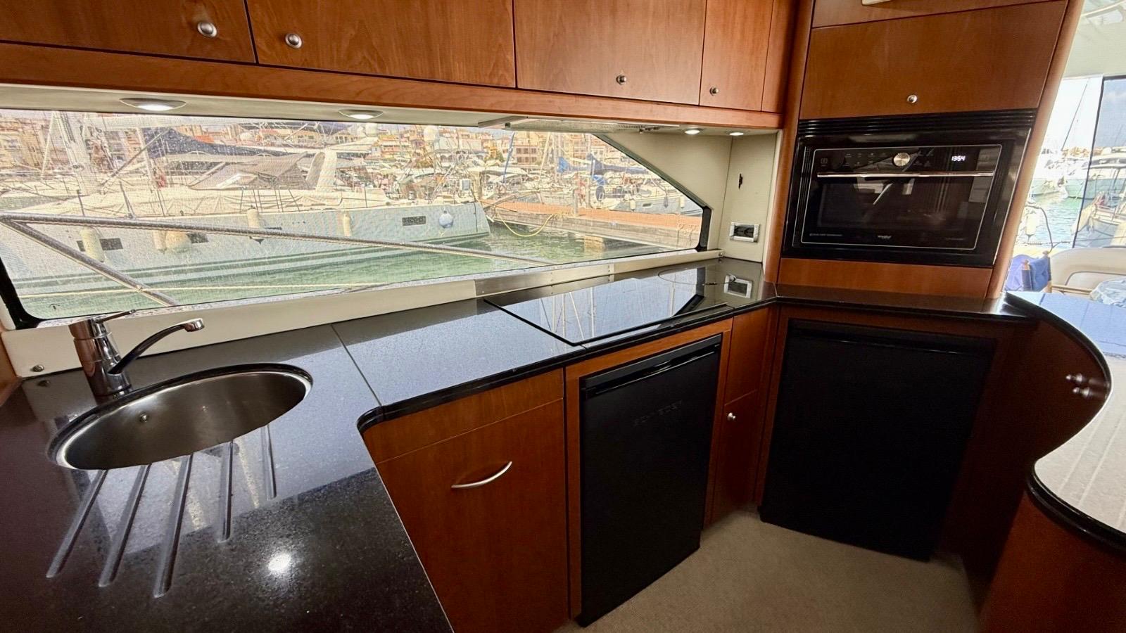 The aft galley layout connects seamlessly to the cockpit, making it ideal for entertaining guests and serving meals both inside and out.