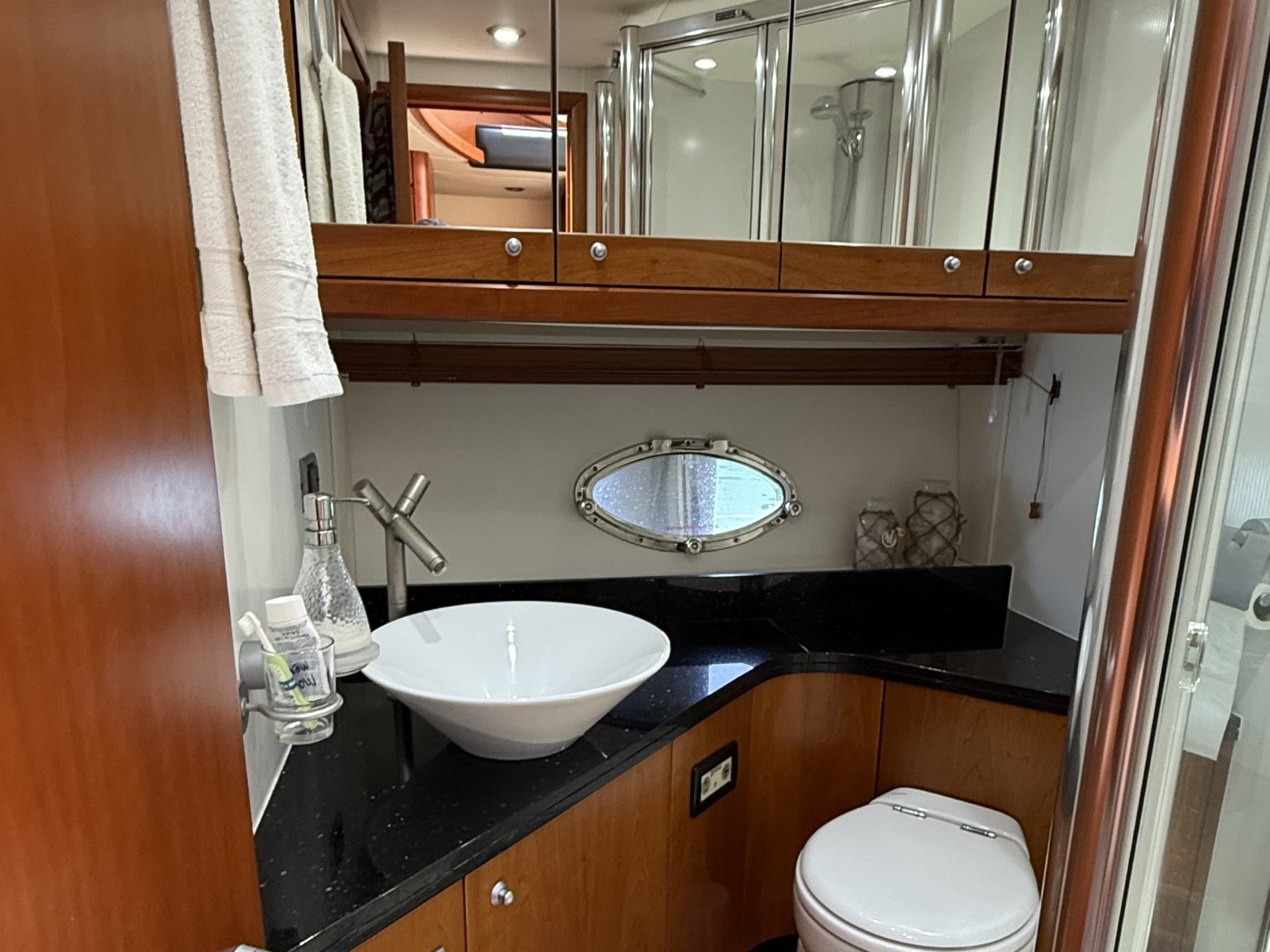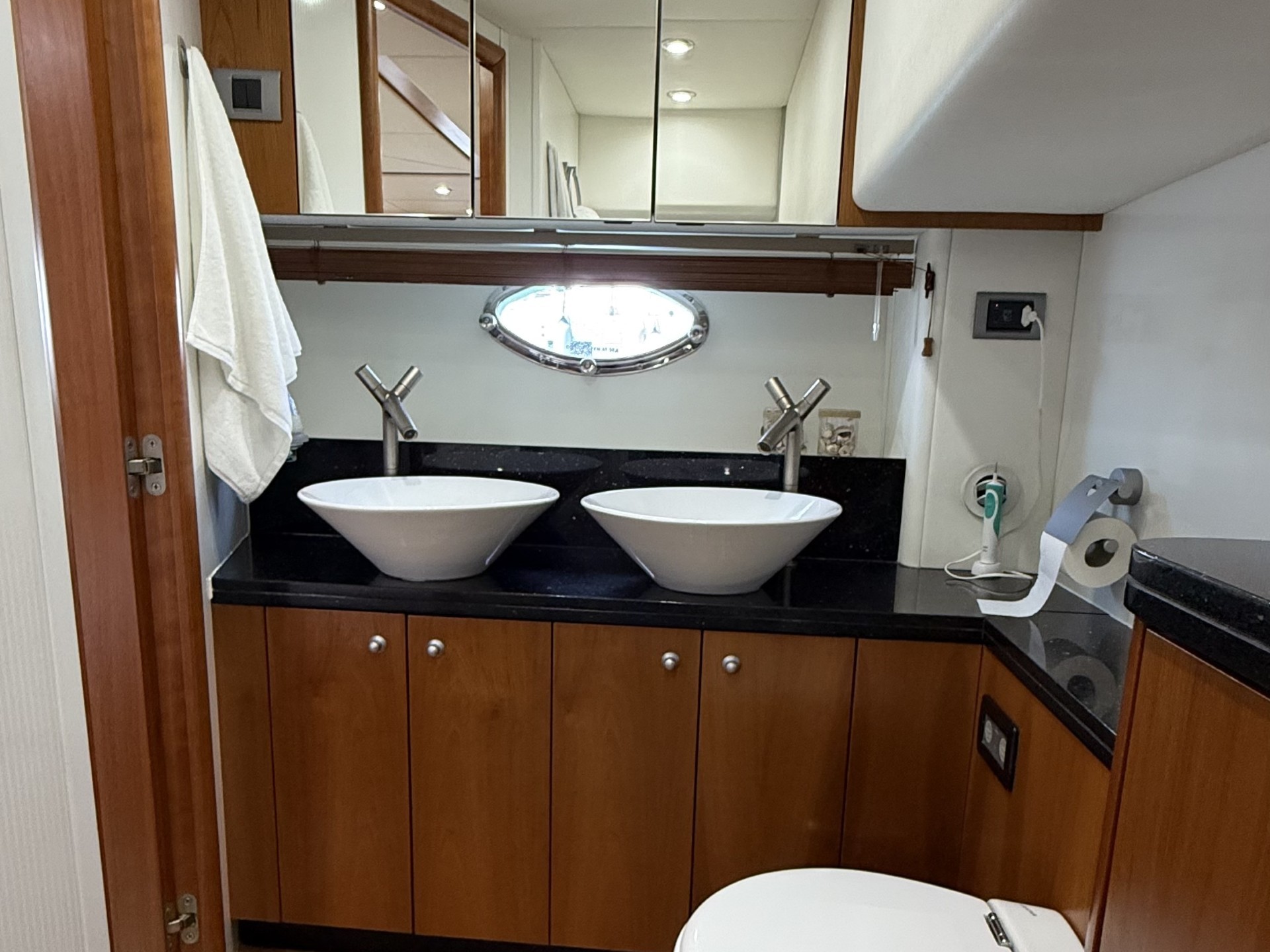 Forward VIP cabin with full bathroom, new headliners and wall upholstery in cream leather, lacquered wood furniture