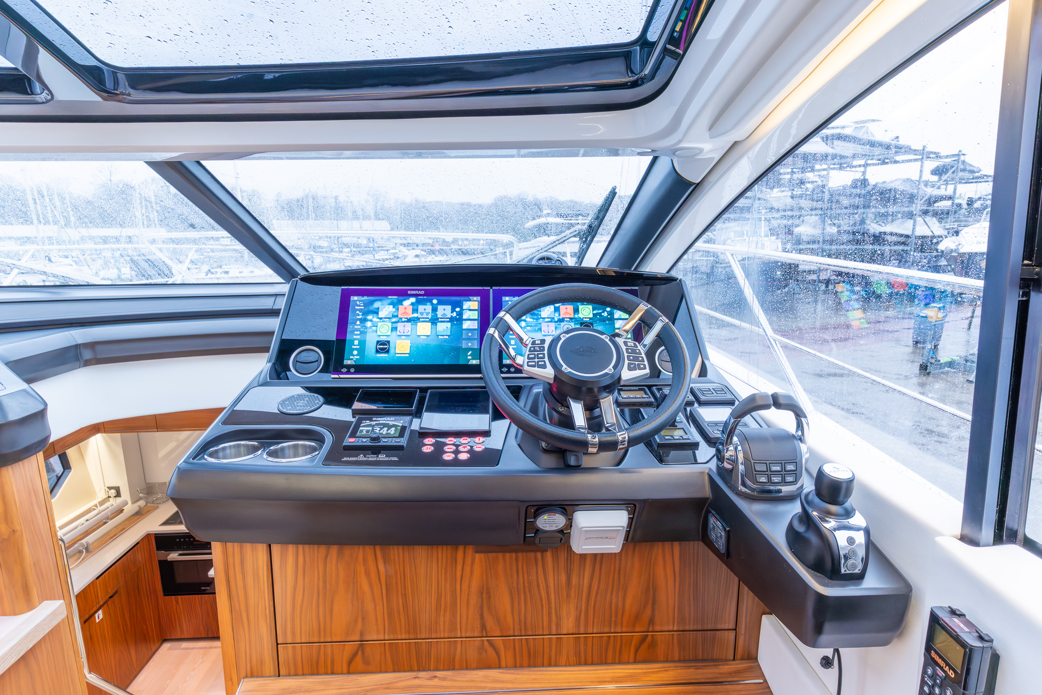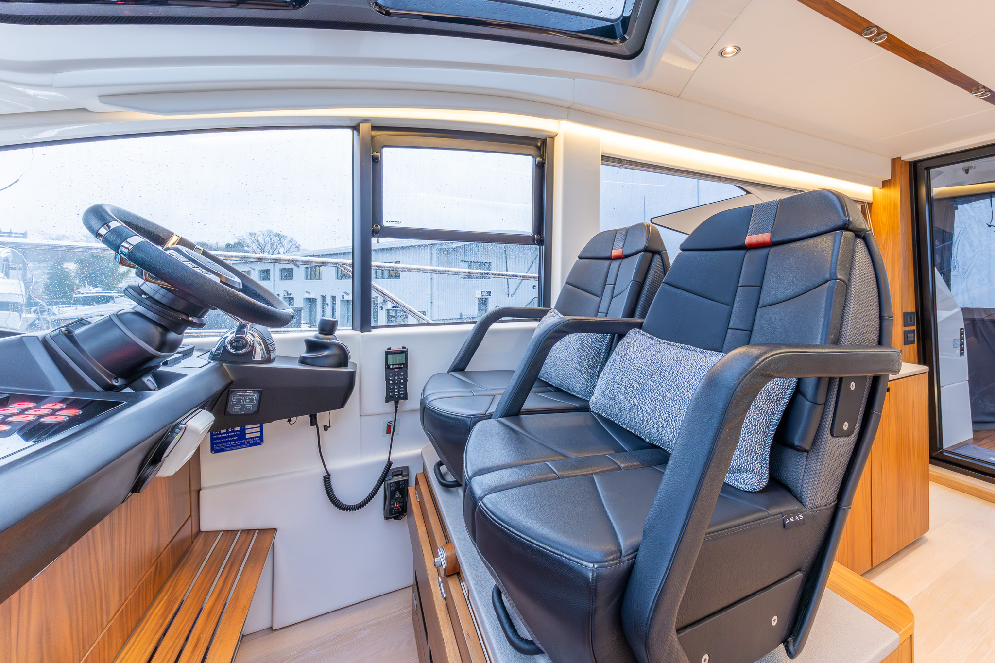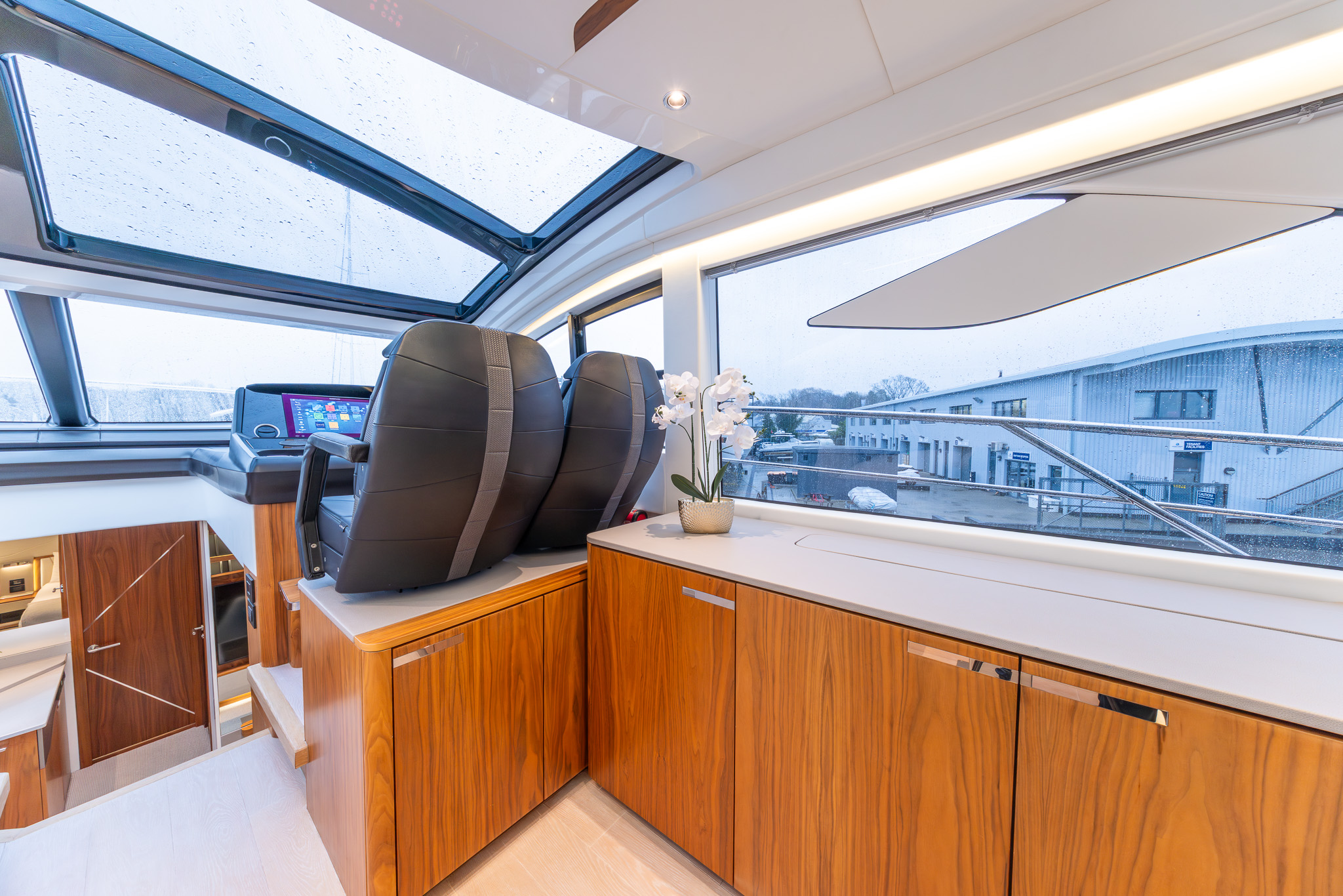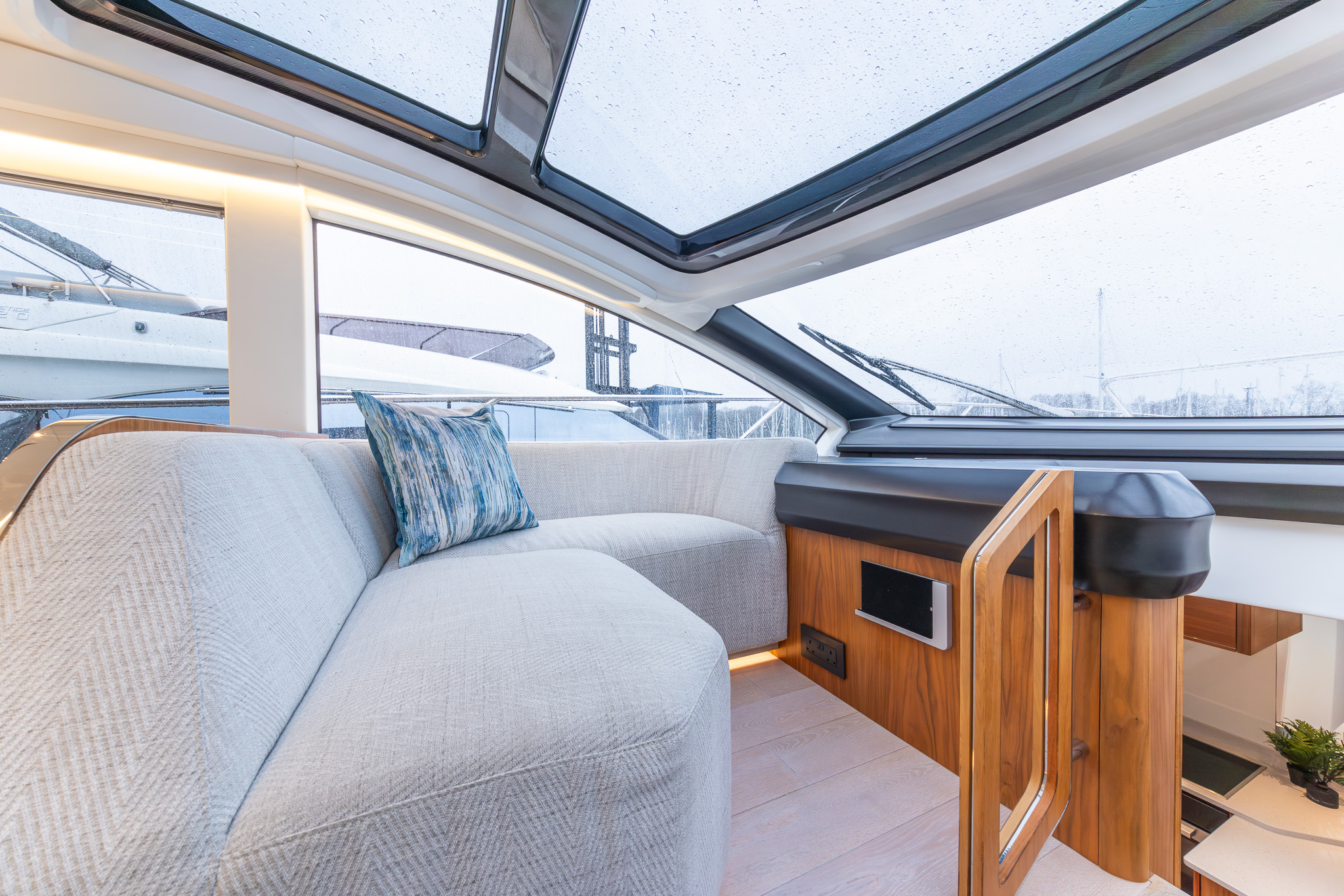 The spacious main deck saloon features large panoramic side windows, large opening hard roof a small sofa to port opposite the helm