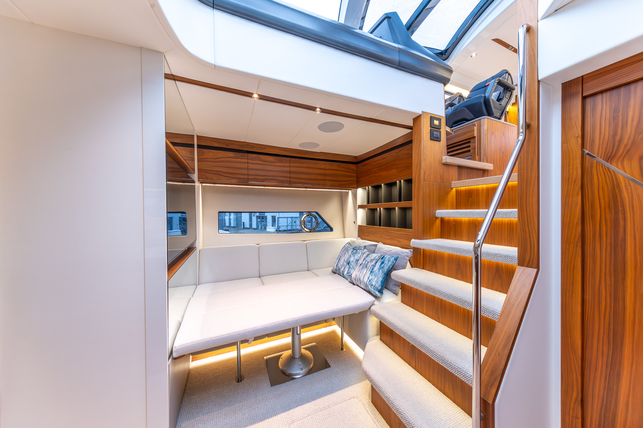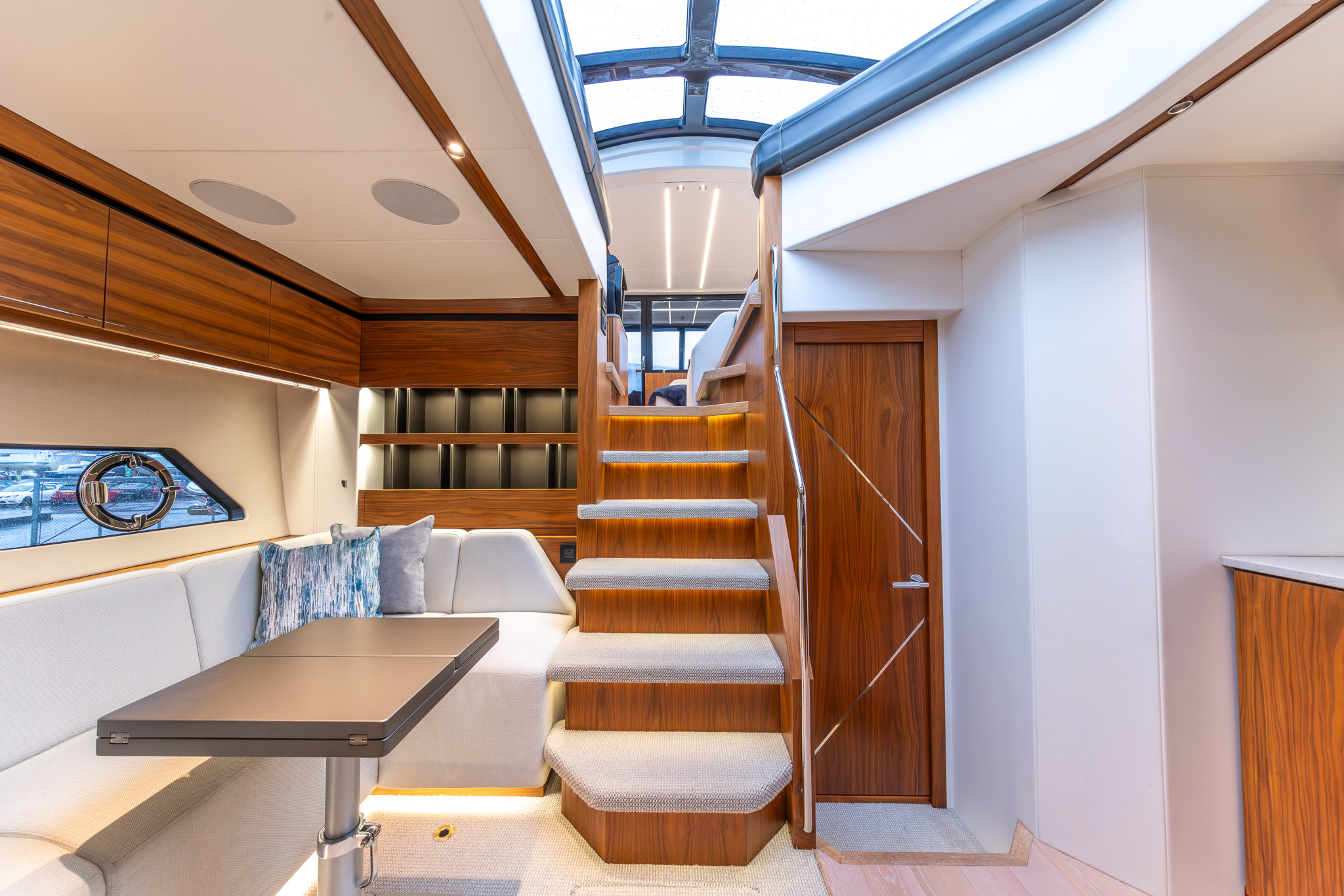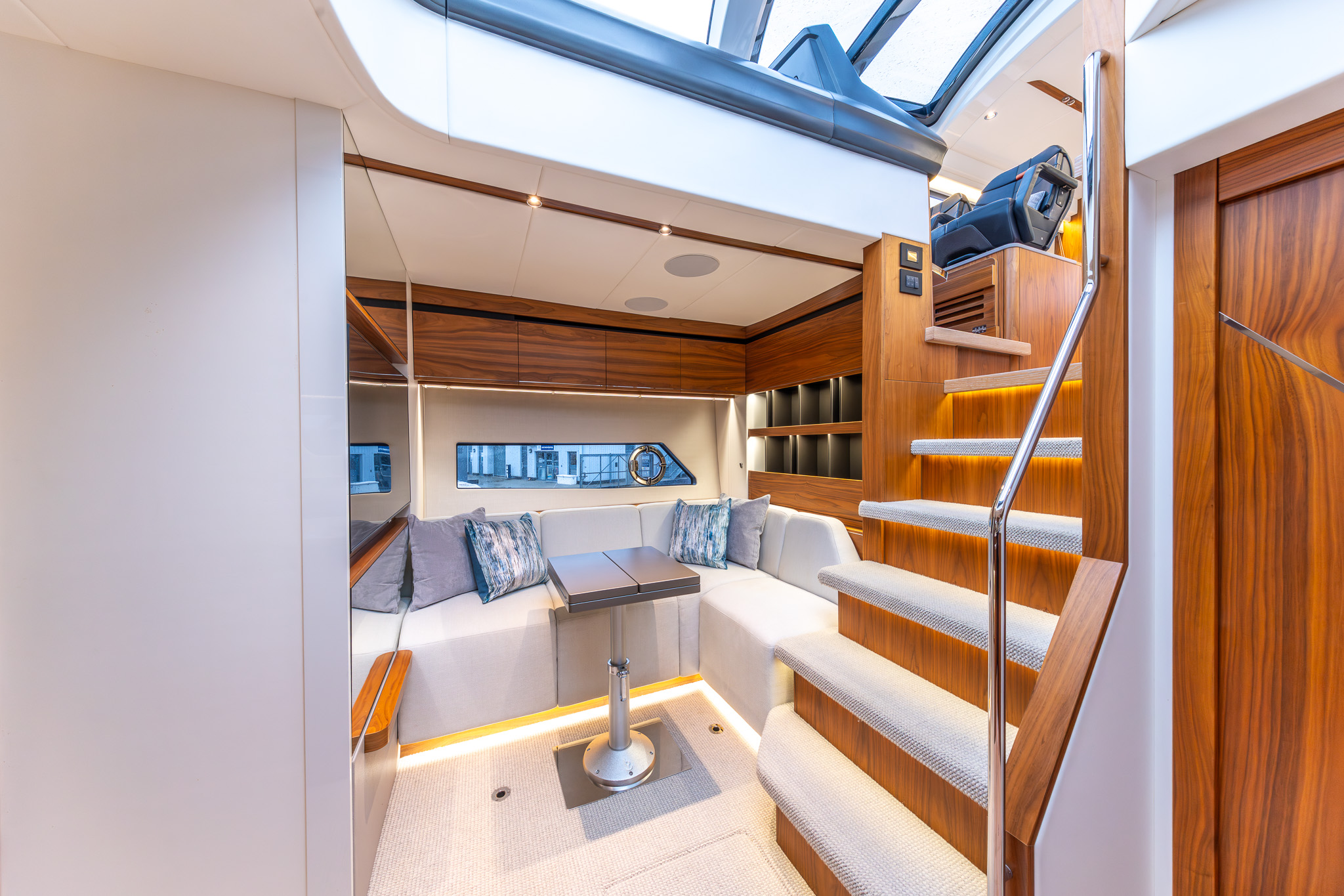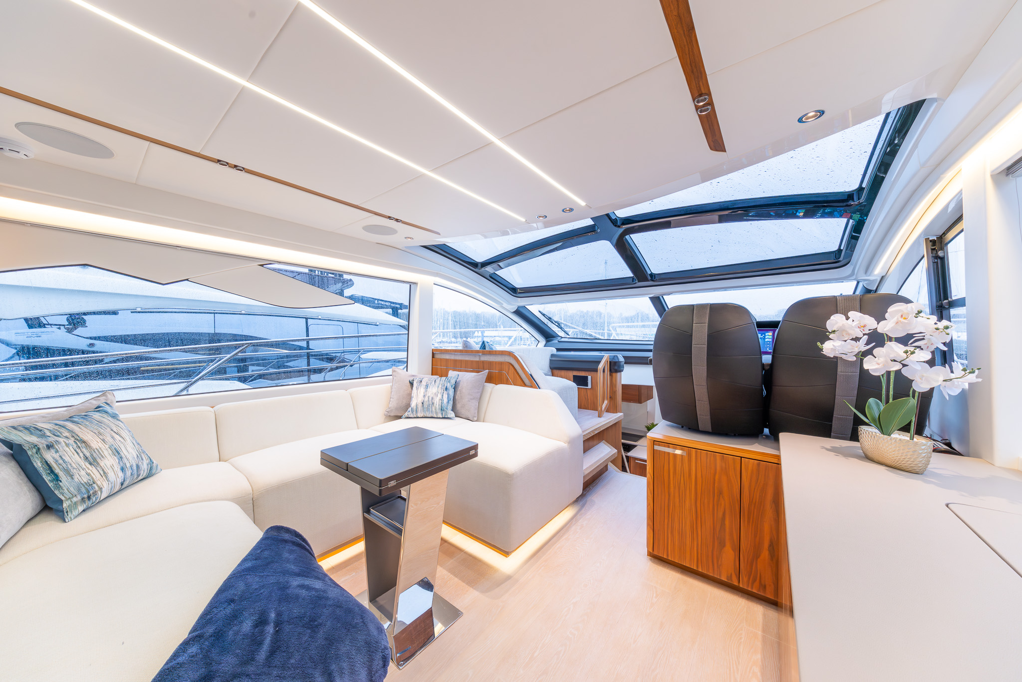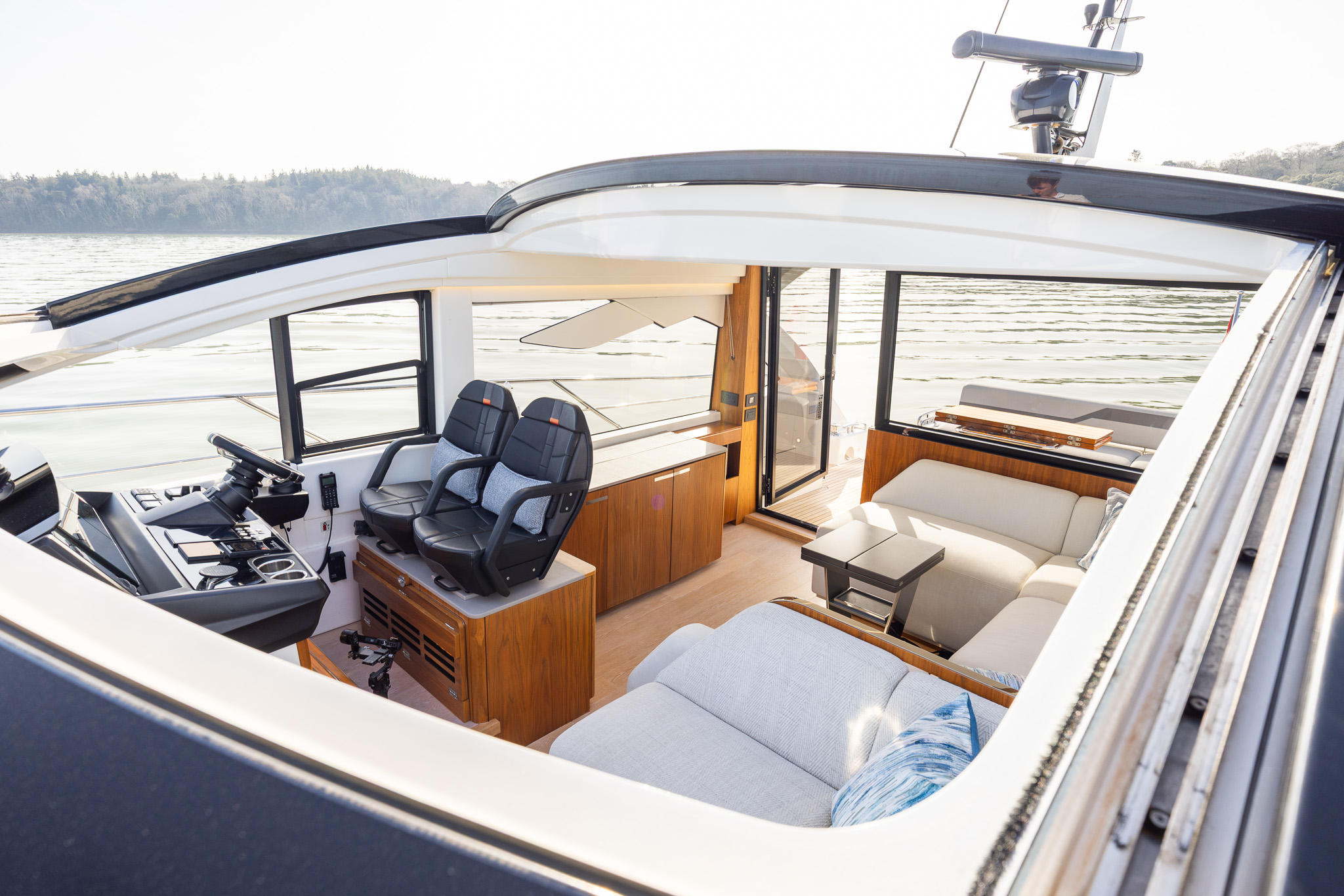 The spacious main deck saloon features large panoramic side windows, large opening hard roof a small sofa to port opposite the helm