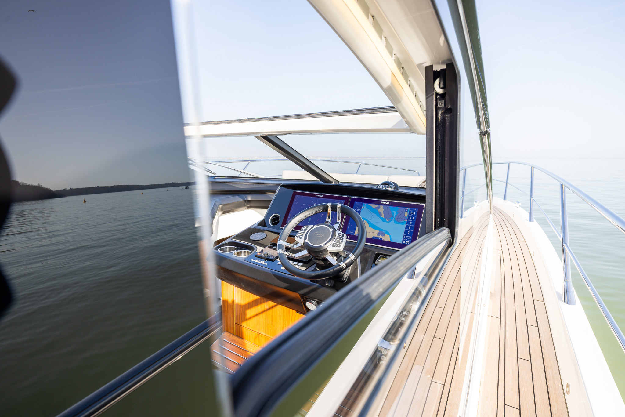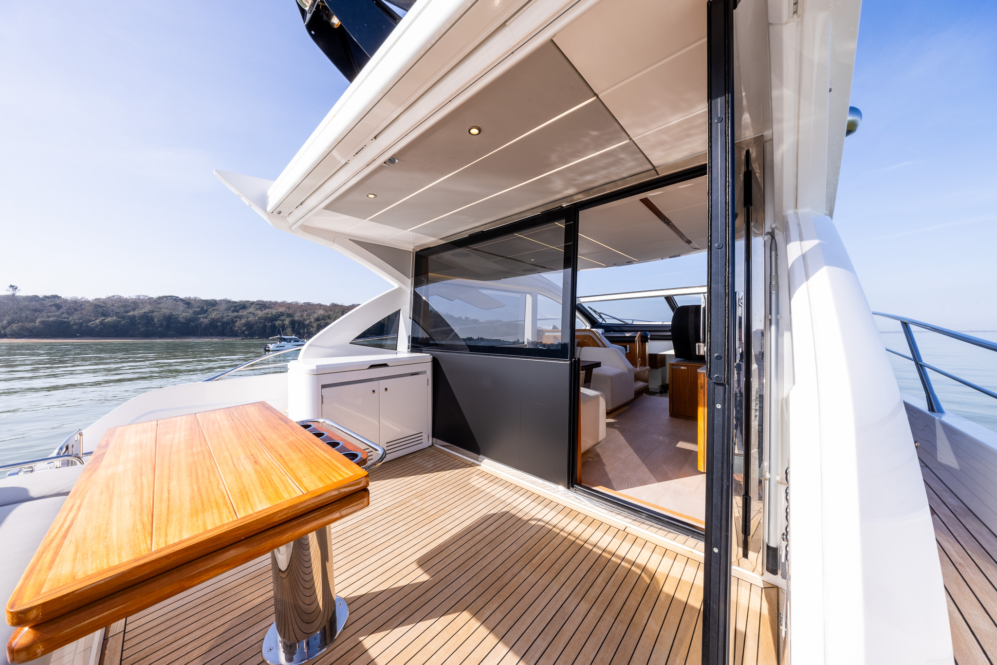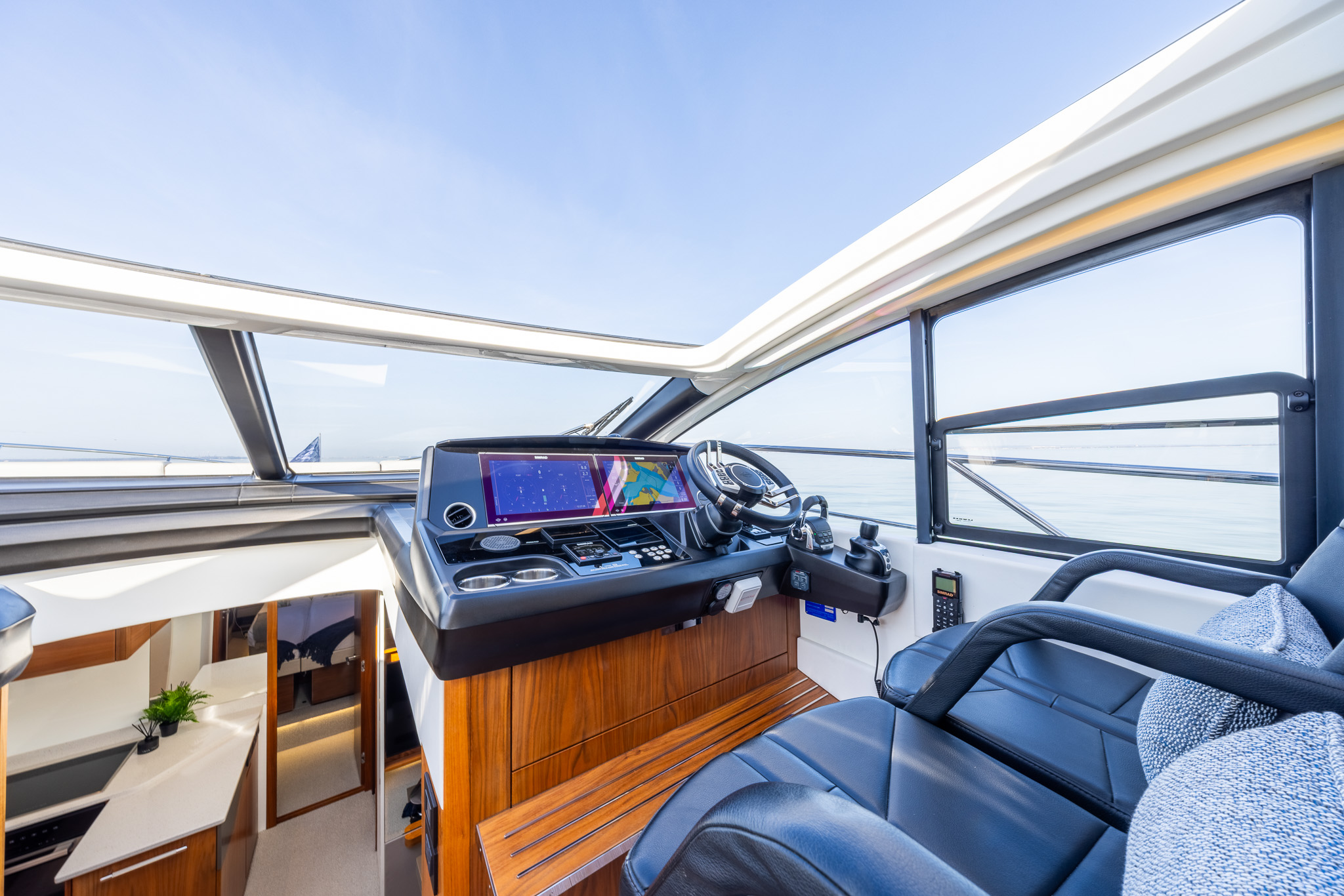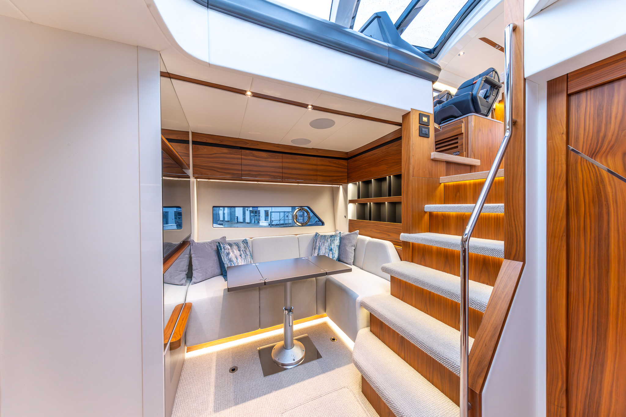 The spacious main deck saloon features large panoramic side windows, large opening hard roof a small sofa to port opposite the helm