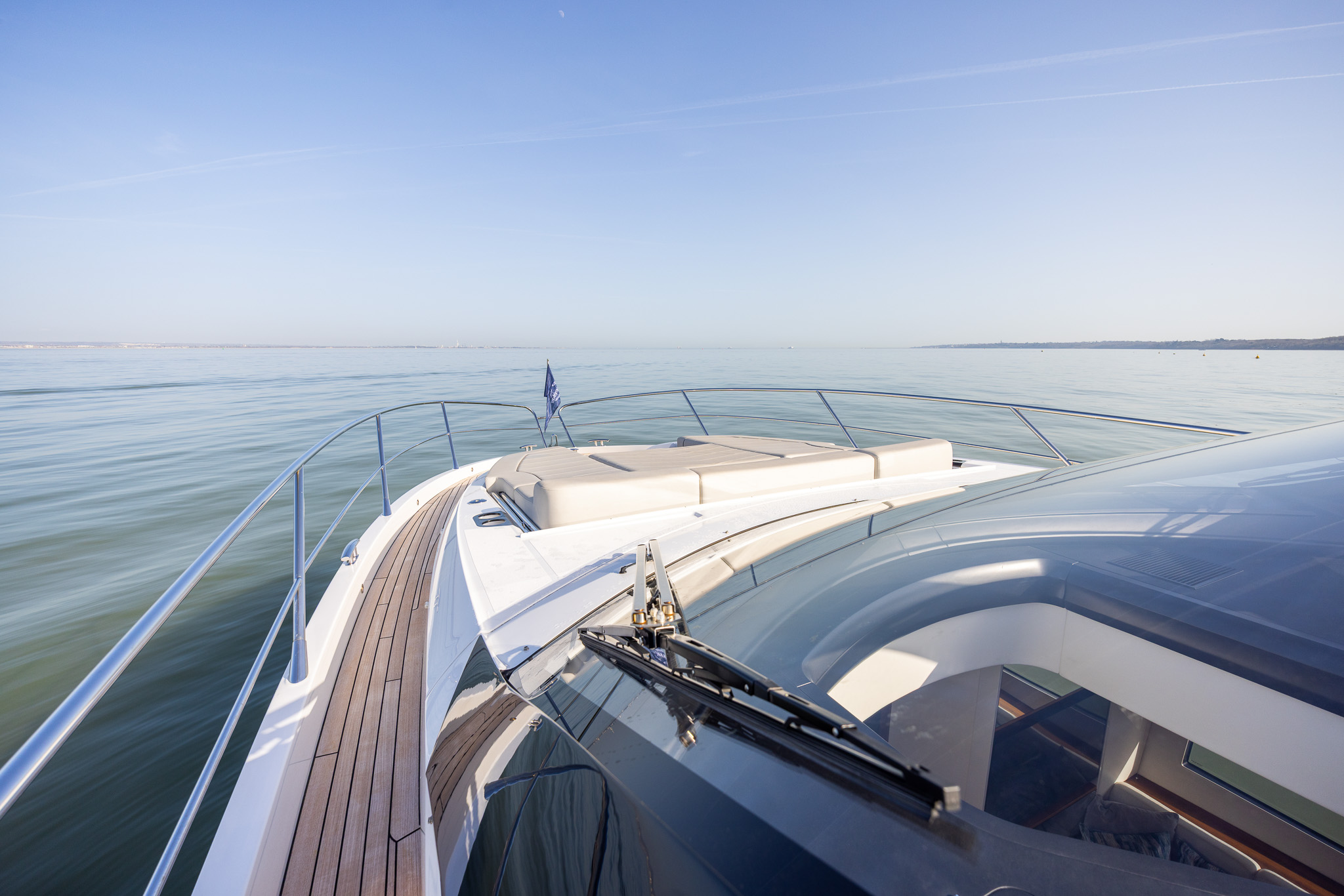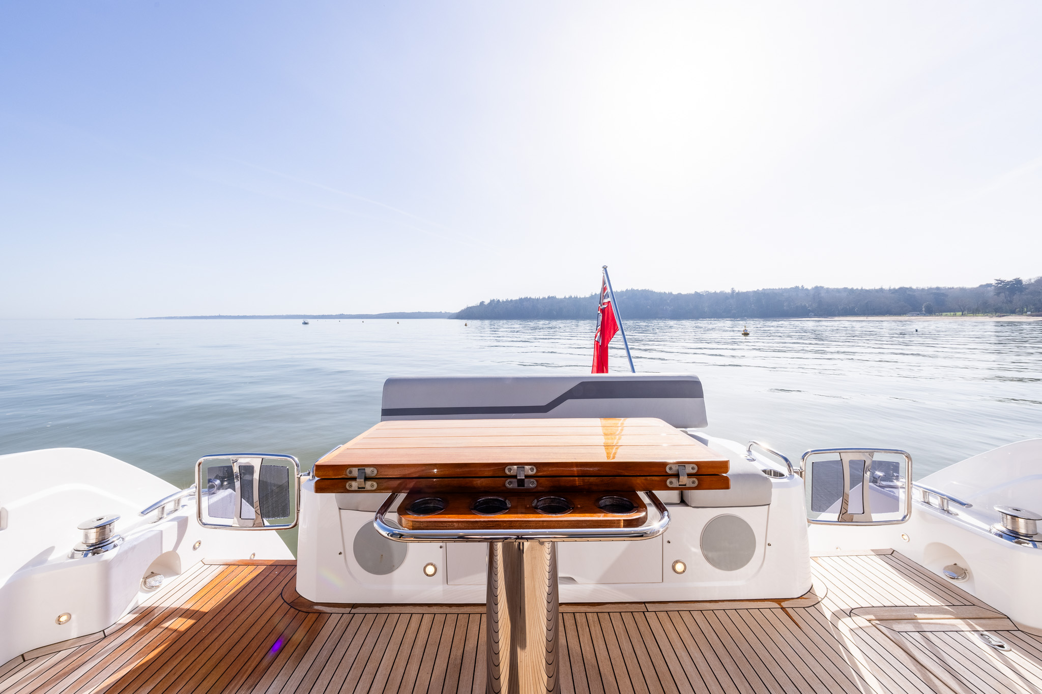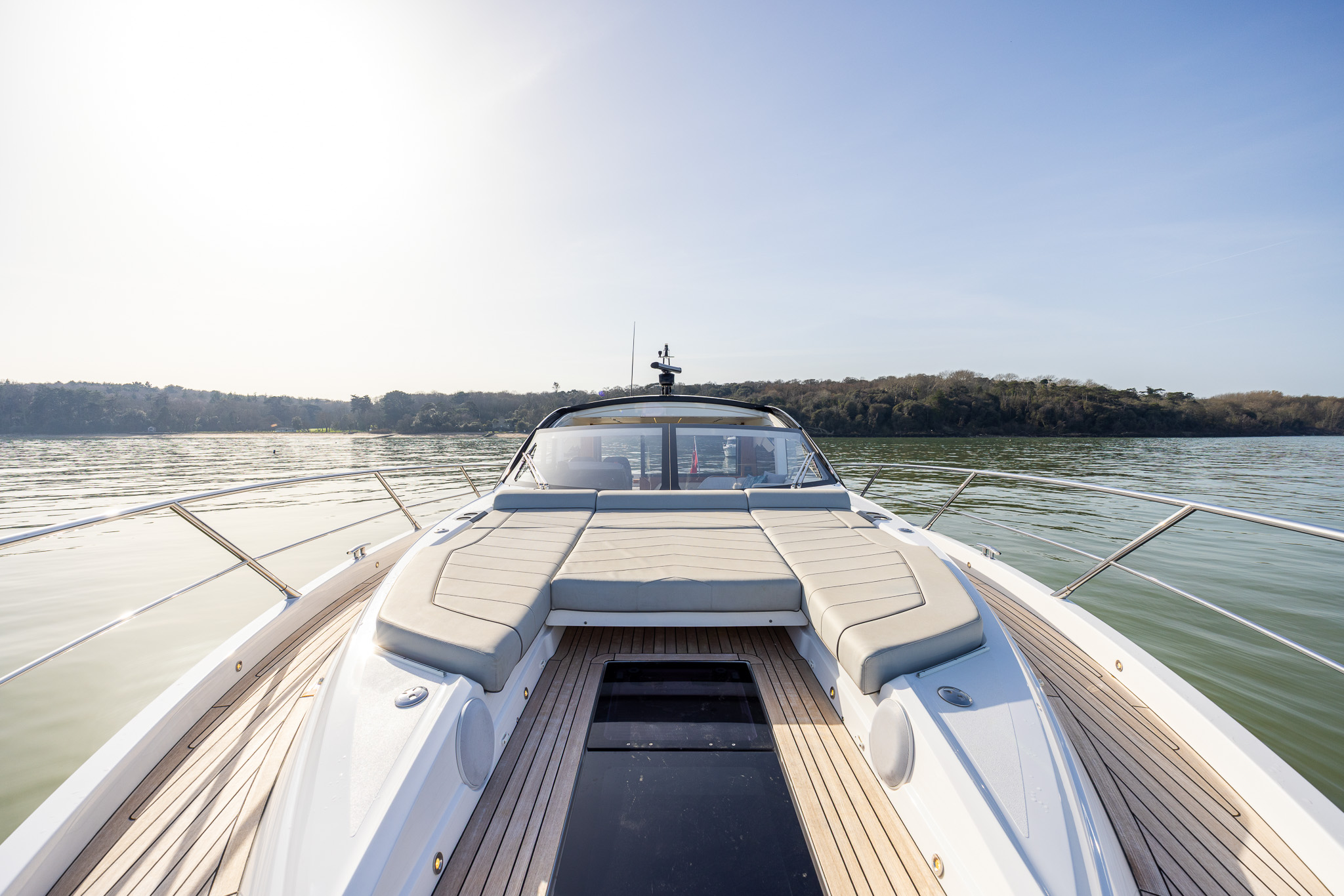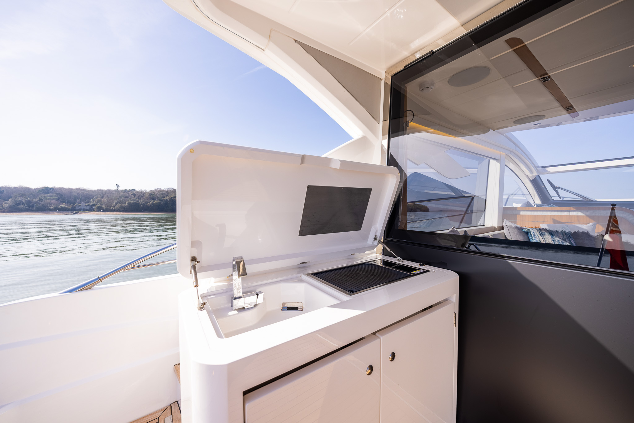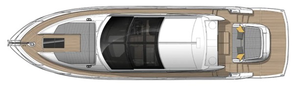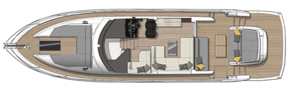 The spacious main deck saloon features large panoramic side windows, large opening hard roof a small sofa to port opposite the helm