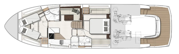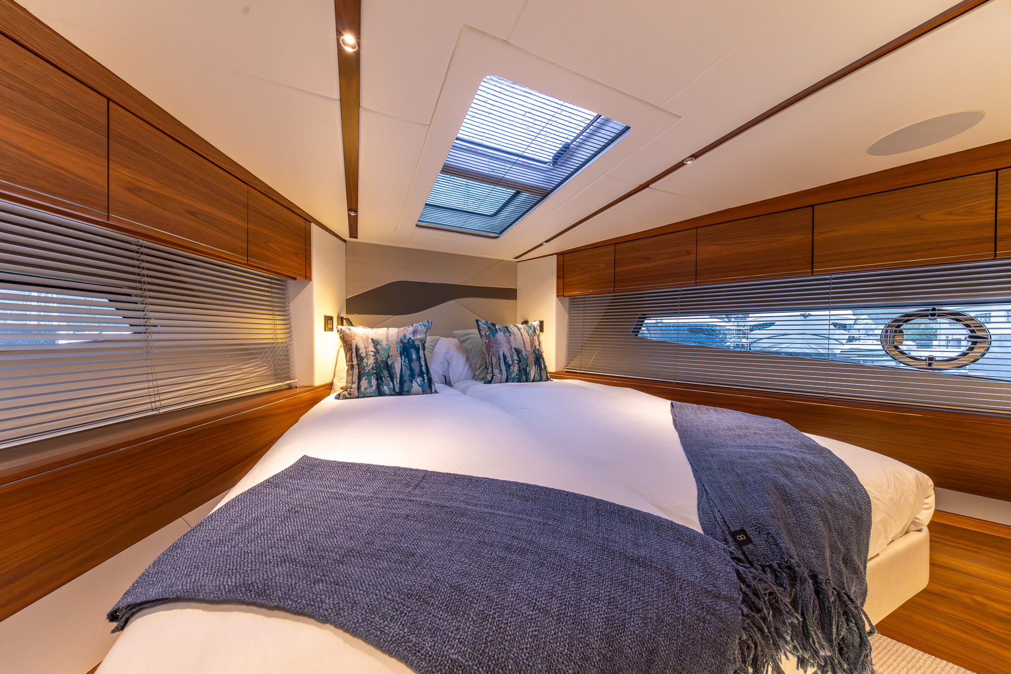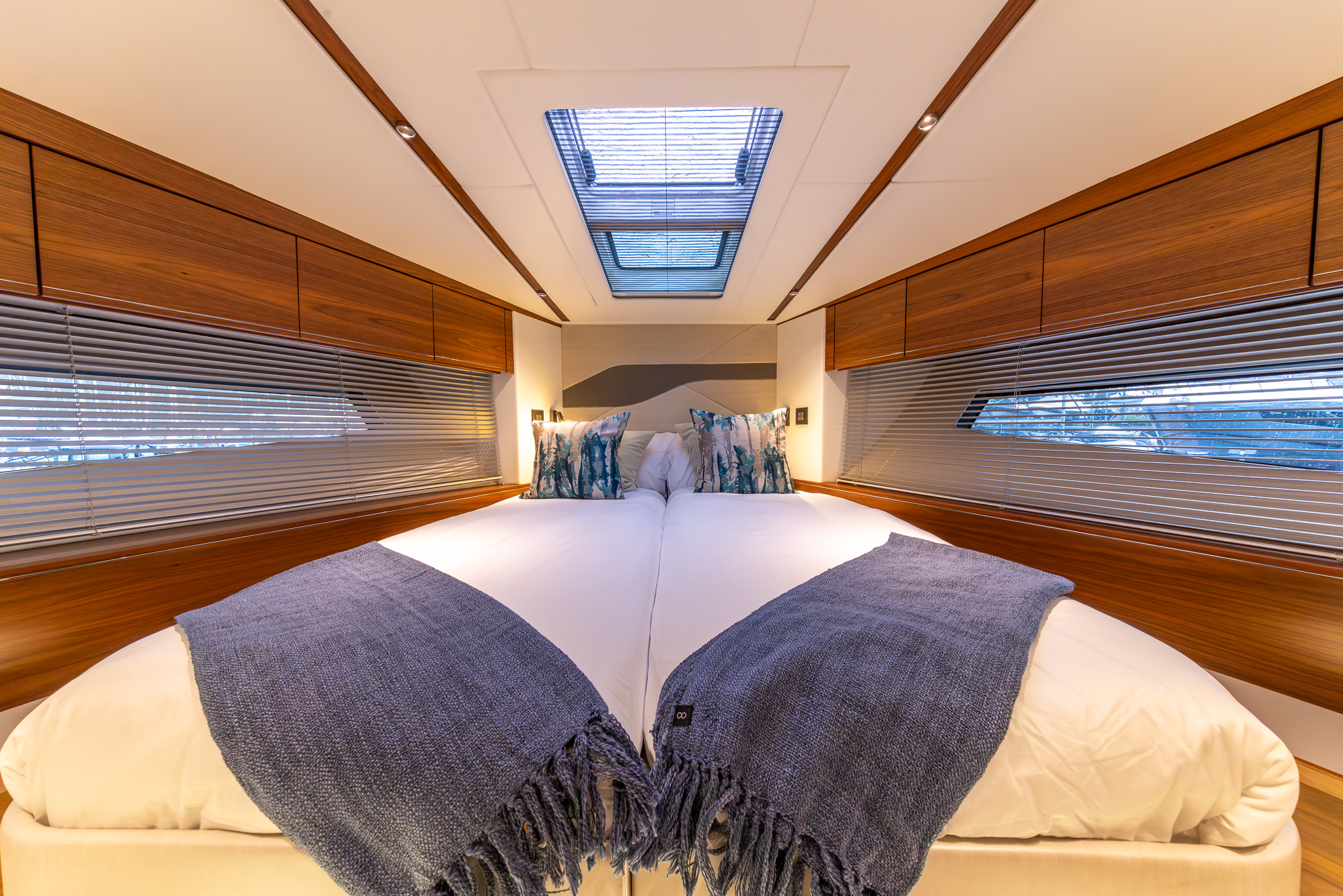 Forward V berth which converts from 2 singles to a double berth, under berth storage, hanging wardrobe, storage cupboard, reading lights and overhead deck hatch
