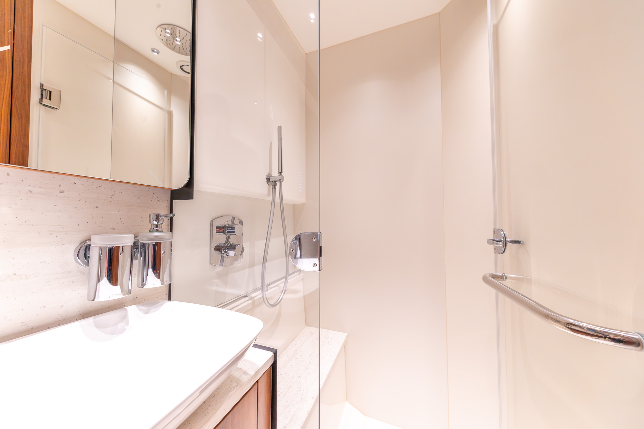 Aft of this you find a large U-shaped sofa, table and opposite a cabinet housing the up/down TV and storage cuboards