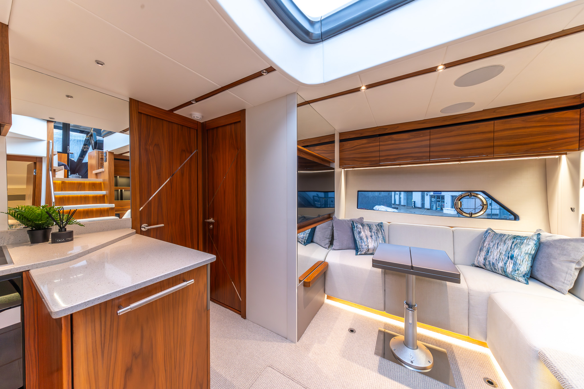 The saloon has L-shaped seating and dining table to starboard, which can be lowered manually to convert to a berth using a cushion infill
