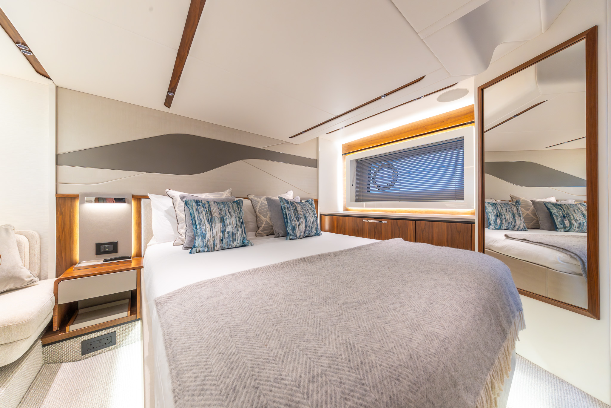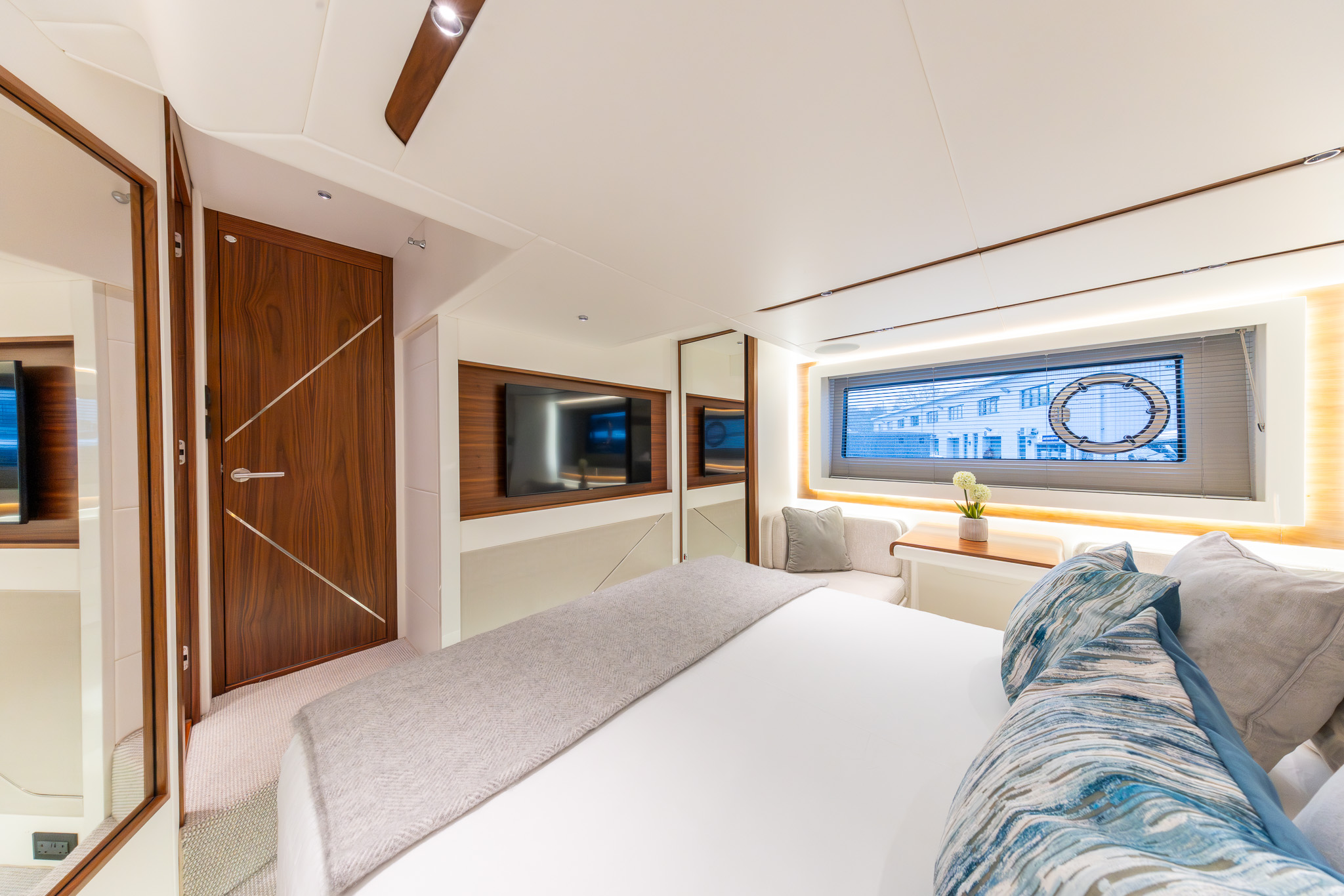 Master cabin Samsung 43" Smart 4K UHD Television with Apple TV App and Airplay 2 included. Sonos Amp connecting TV with the built in B&W CCM362 speakers allowing music streaming