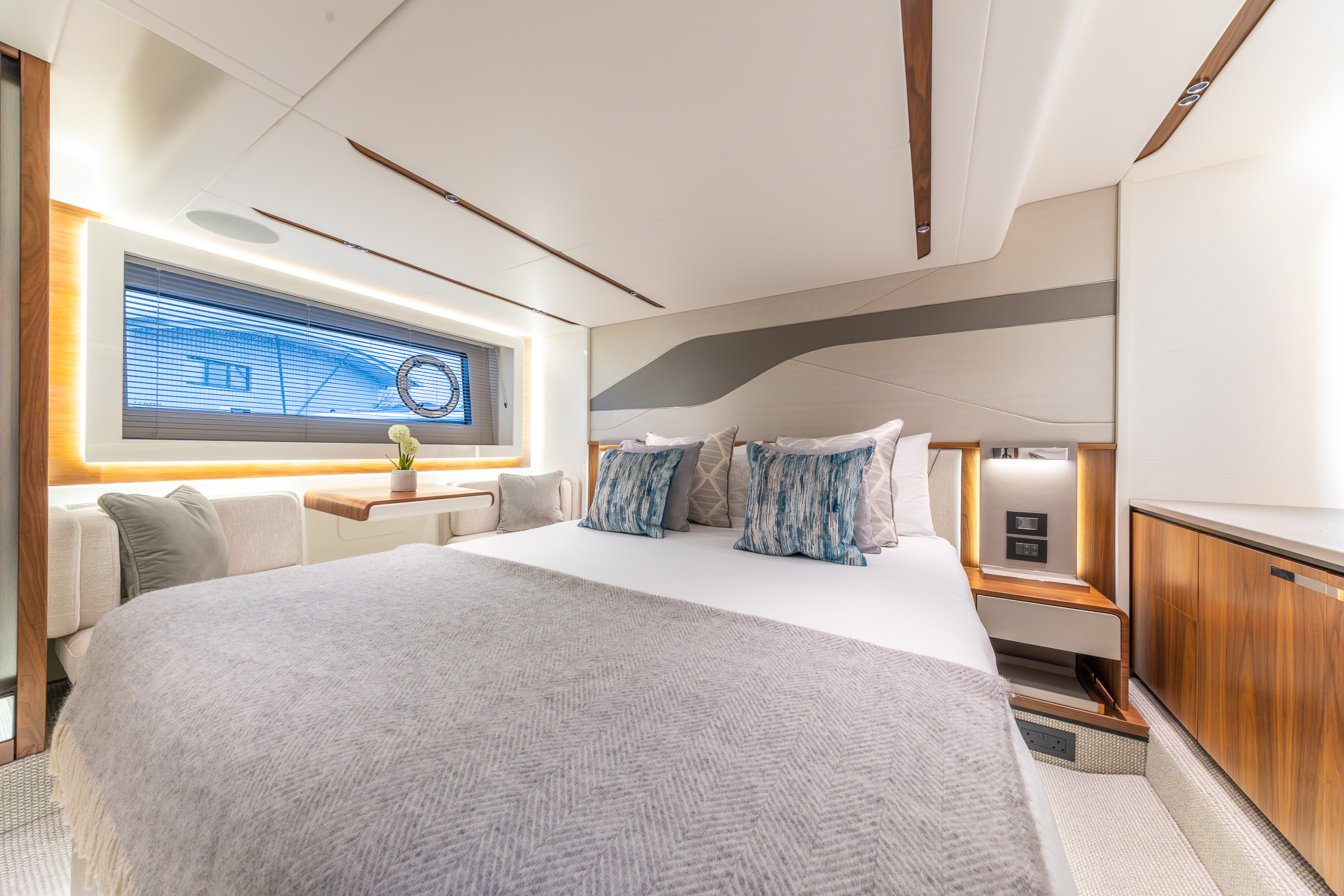 The master cabin is midships with a central island double bed, stbd seating for two with a table, hanging wardrobes, storage lockers, nightstands and reading lights