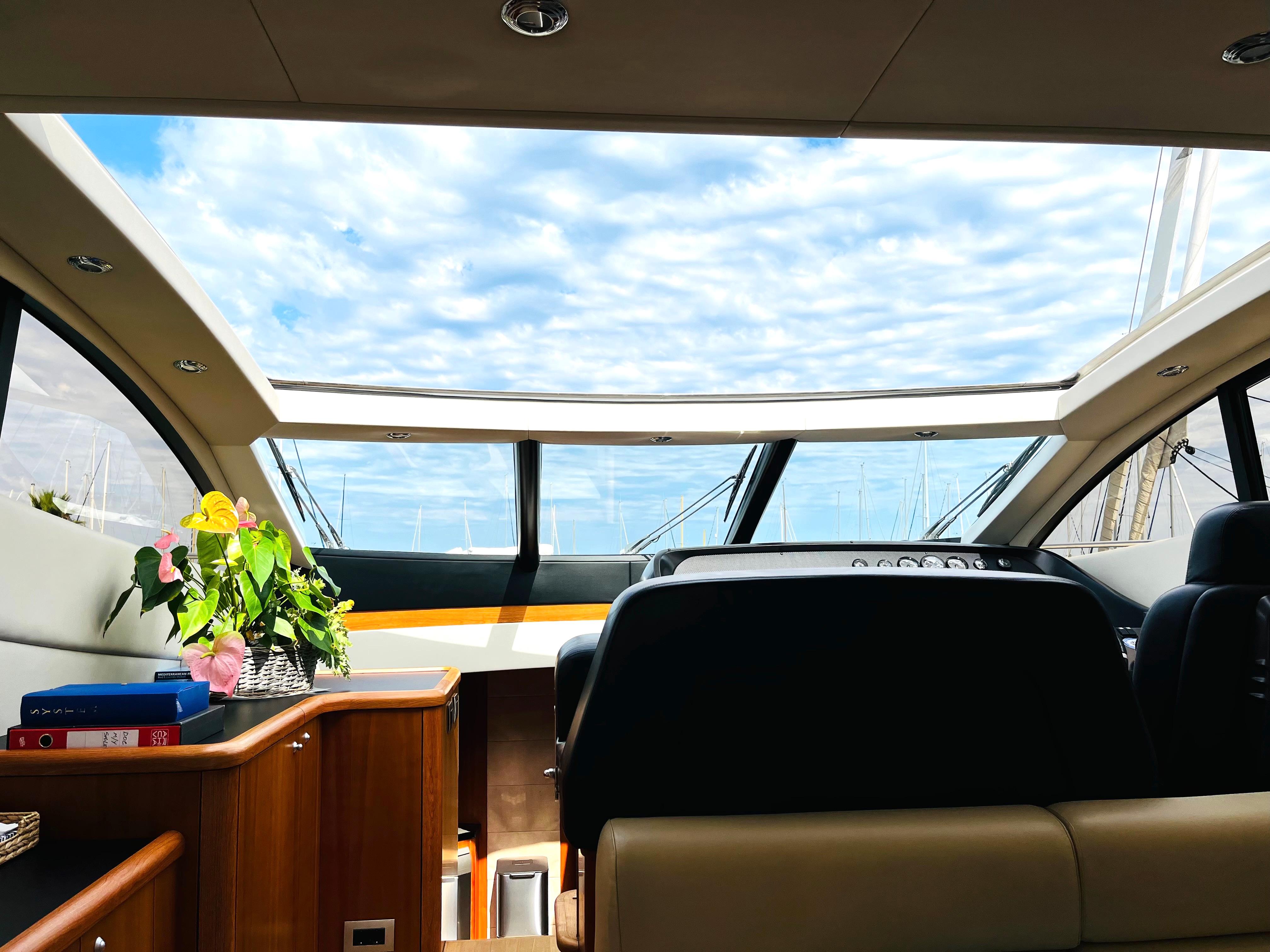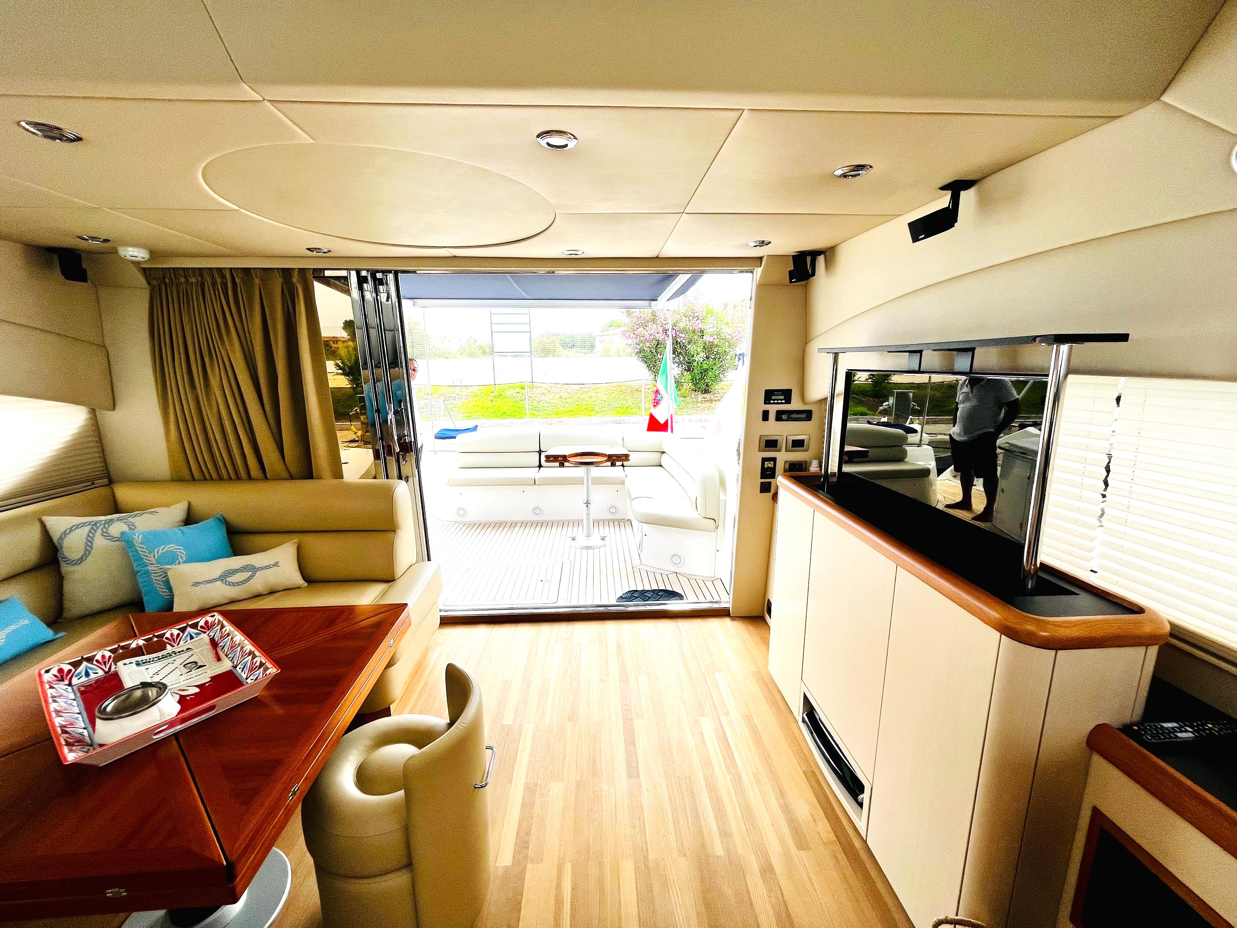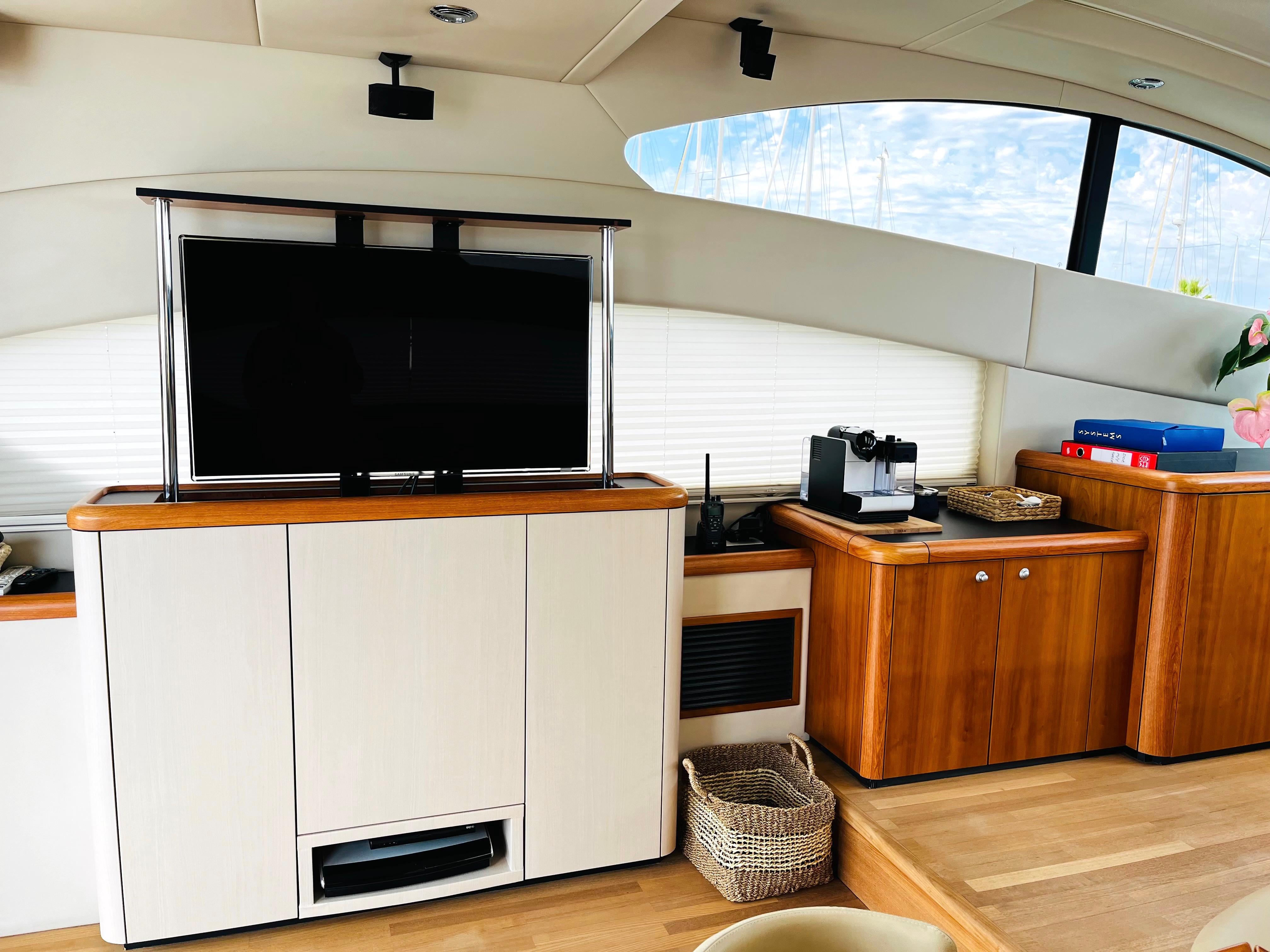 Large cockpit connected to the saloon by a fully open steel door, specious saloon with TV zone and Bose dolby surround sound.