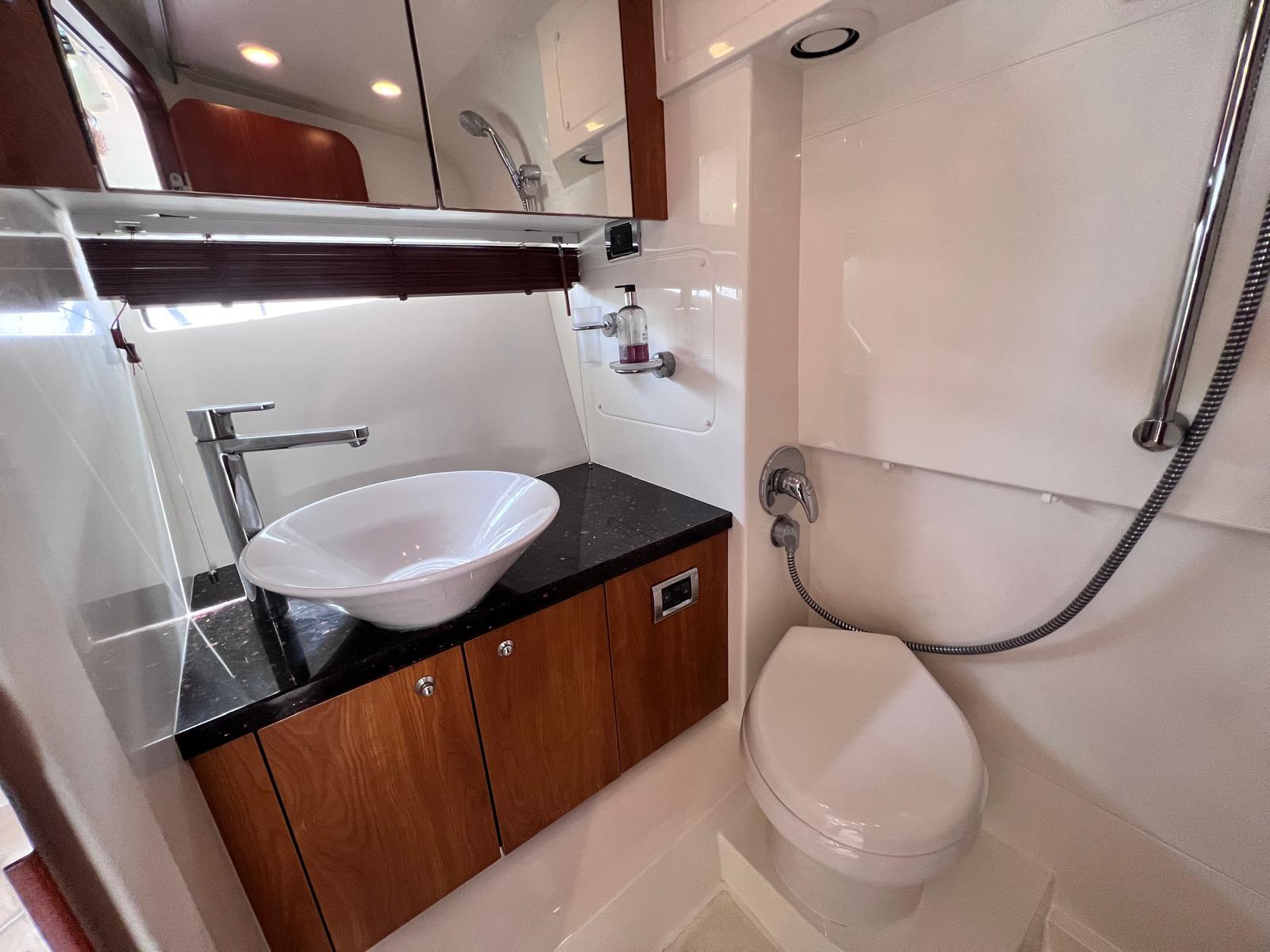 Day heads aft to stbd with marine electric toilet, shower, sink, mirror and cupboard